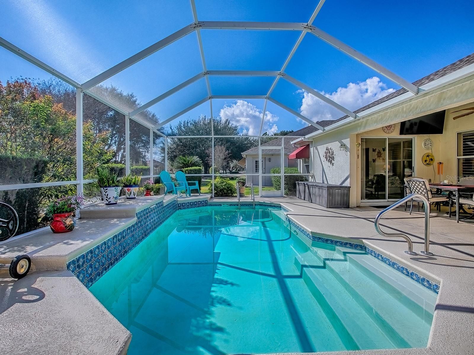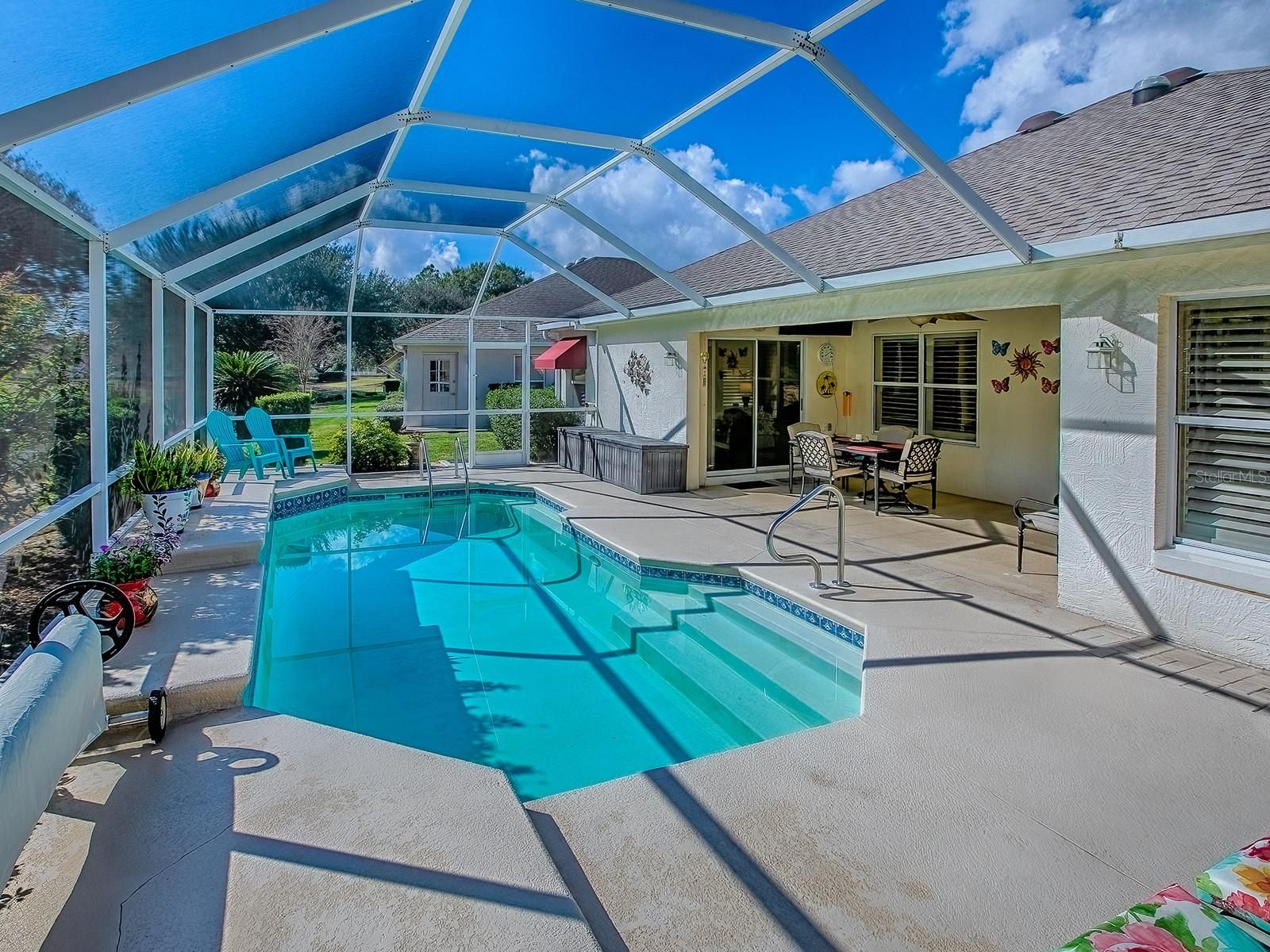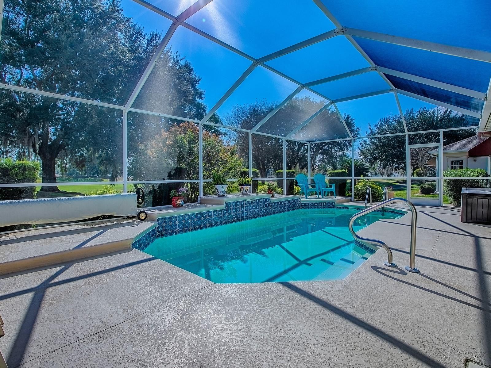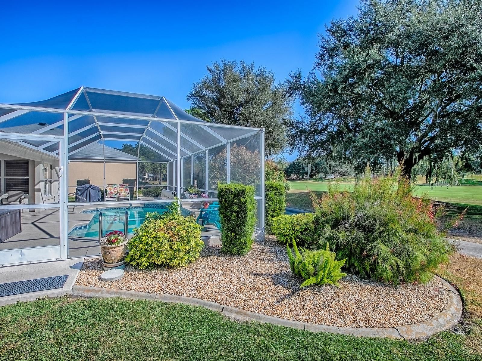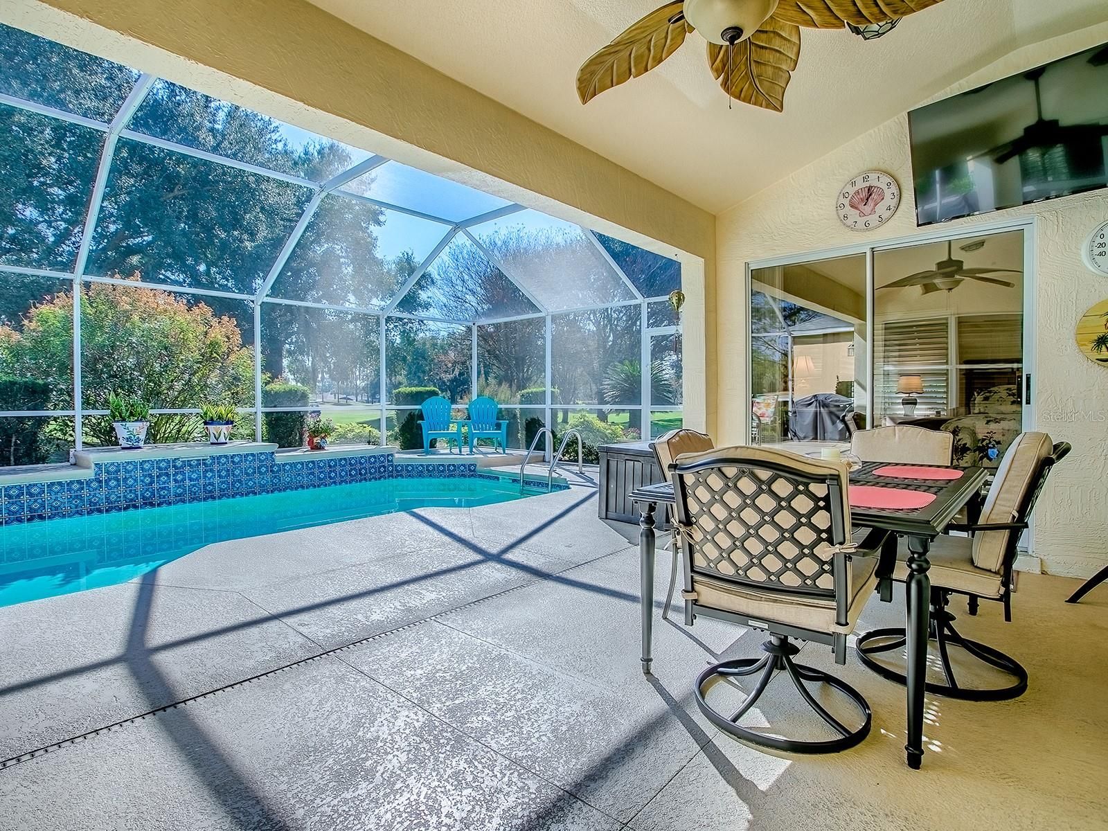 Imagine waking up each morning in a luxurious space where every detail has been thoughtfully crafted to enhance your lifestyle. Located in the Village of Santo Domingo, this exquisite 3-bedroom, 2-bathroom Bond Paid designer home offers a serene escape without sacrificing the conveniences of modern living. Overlook the lush greens of the Tierra Del Sol Championship Golf Course from your backyard haven. Dive into relaxation in your own sparkling private pool, perfect for leisurely swims or hosting friends. Privacy landscaping allows you to enjoy the view while keeping to yourself a bit. With a paver driveway, double door screened front and meticulously maintained landscaping that surrounds the home, the curb appeal is undeniable. The spacious lanai and newly screened birdcage over the pool area invite both relaxation and entertainment, complete with a solar blanket, a 2022 pool heater, and a variable speed pump to keep your pool perfect year-round. Entering through the double leaded glass doors, you are immediately captivated by the spaciousness of the foyer, complete with a practical coat closet. The entire home boasts beautiful polished tile flooring, ensuring there is no carpet to worry about. Plantation shutters encase each window adding even more of a truly finished look. Wander into the eat-in kitchen, designed to delight every cook with its granite countertops, white cabinets, reverse osmosis system at the sink & convenient rolling island. A tile backsplash adds an elegant touch, while the built-in desk area offers a peaceful view of the pool & beyond. The primary bedroom serves as a retreat, featuring sliding glass doors that open directly onto the pool and lanai area. It includes separate his and her walk-in closets, providing ample storage, and a luxurious en-suite bathroom with a double sink vanity. Every morning can start with inspiration as you step out to admire the golf course view. Guest spaces are accommodating and comfortable. The front guest room, enhanced by a charming bay window, offers ample closet space and access to a guest bath with a new vanity and features a tub/shower combo, ensuring your visitors feel right at home. This home is not only beautiful but also smart with an app controlled irrigation system to monitor it's function even while away. You can also ask your Alexa to control the smart wired light switches in the dining room & primary bedroom. Set within easy reach of Spanish Springs Town Square and Sumter Landing, the home places you close to shopping, dining, healthcare, and a host of recreational opportunities. The thriving community offers myriad activities for all interests, from leisurely strolls to vibrant nightlife. Enjoy proximity to the 441 corridor for convenient travel throughout the area, while enjoying all the advantages of life in The Villages. Whether you are considering a vacation home, a peaceful abode for retirement, or even a forever home, this property delivers with its blend of style, comfort, and location. Its efficient layout and modern updates make it a smart choice for discerning buyers seeking both beauty and practicality. Discover how this inviting home can enhance your lifestyle with its thoughtful design and vibrant community ambiance. Schedule a viewing today to truly appreciate all that it has to offer.