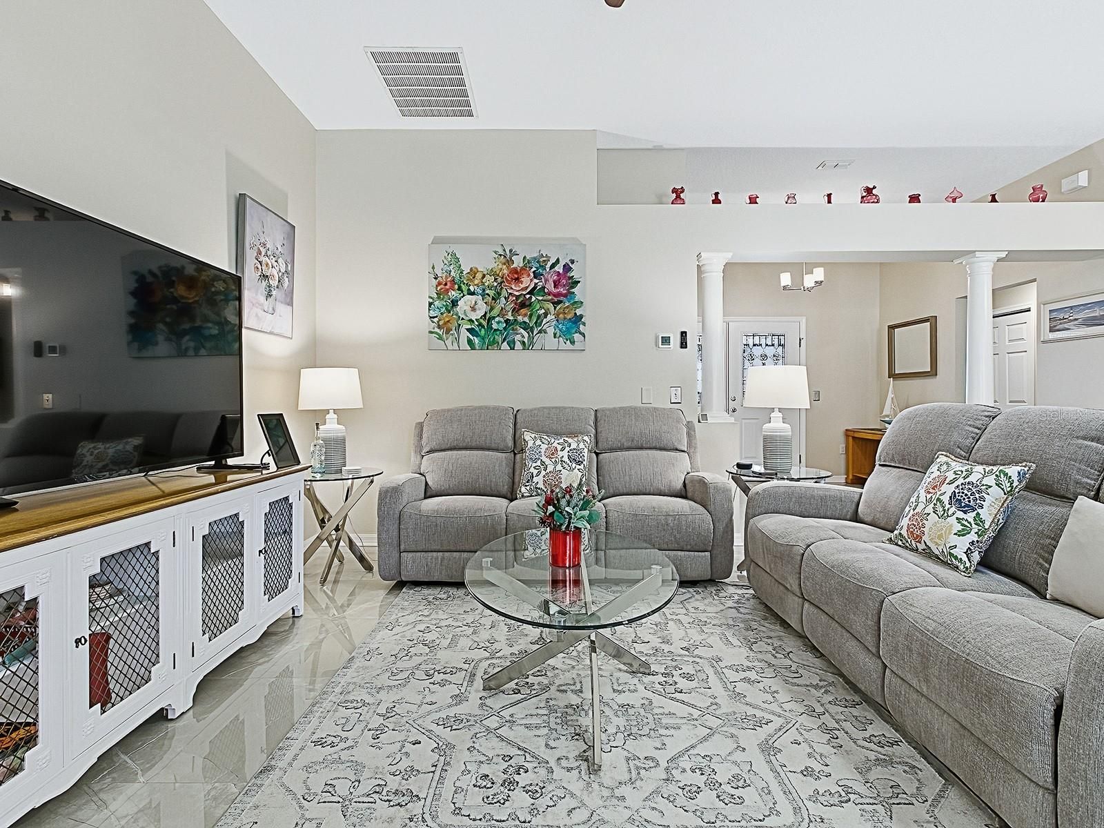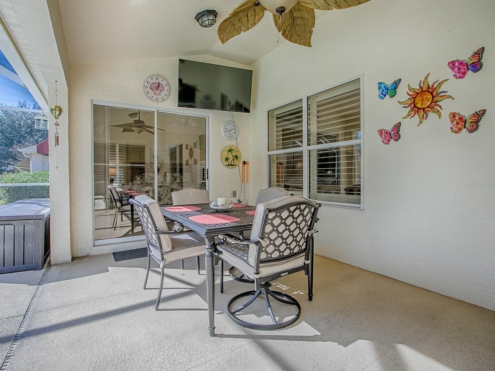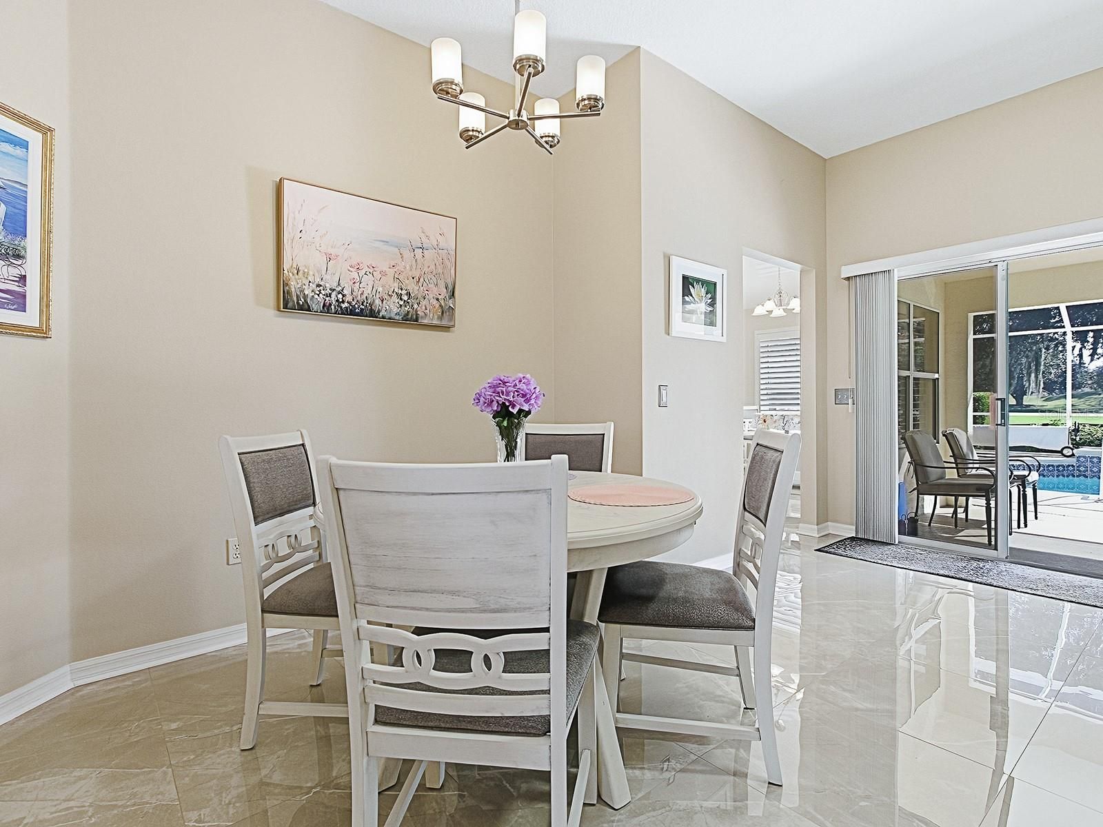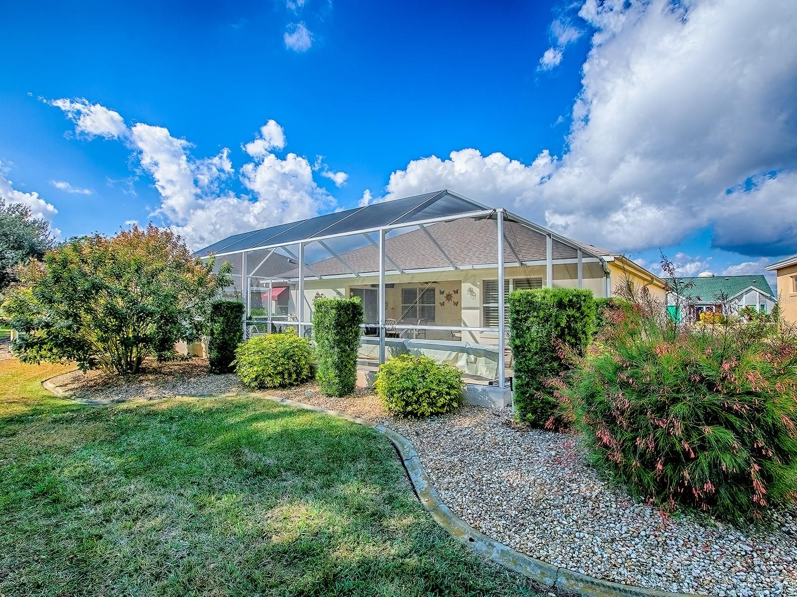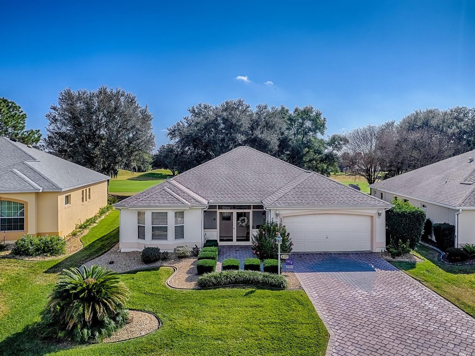 Imagine waking up each morning in a luxurious space where every detail has been thoughtfully crafted to enhance your lifestyle. Located in the Village of Santo Domingo, this exquisite 3-bedroom, 2-bathroom Bond Paid designer home offers a serene escape without sacrificing the conveniences of modern living. Overlook the lush greens of the Tierra Del Sol Championship Golf Course from your backyard haven. Dive into relaxation in your own sparkling private pool, perfect for leisurely swims or hosting friends. Privacy landscaping allows you to enjoy the view while keeping to yourself a bit. With a paver driveway, double door screened front and meticulously maintained landscaping that surrounds the home, the curb appeal is undeniable. The spacious lanai and newly screened birdcage over the pool area invite both relaxation and entertainment, complete with a solar blanket, a 2022 pool heater, and a variable speed pump to keep your pool perfect year-round. Entering through the double leaded glass doors, you are immediately captivated by the spaciousness of the foyer, complete with a practical coat closet. The entire home boasts beautiful polished tile flooring, ensuring there is no carpet to worry about. Plantation shutters encase each window adding even more of a truly finished look. Wander into the eat-in kitchen, designed to delight every cook with its granite countertops, white cabinets, reverse osmosis system at the sink & convenient rolling island. A tile backsplash adds an elegant touch, while the built-in desk area offers a peaceful view of the pool & beyond. The primary bedroom serves as a retreat, featuring sliding glass doors that open directly onto the pool and lanai area. It includes separate his and her walk-in closets, providing ample storage, and a luxurious en-suite bathroom with a double sink vanity. Every morning can start with inspiration as you step out to admire the golf course view. Guest spaces are accommodating and comfortable. The front guest room, enhanced by a charming bay window, offers ample closet space and access to a guest bath with a new vanity and features a tub/shower combo, ensuring your visitors feel right at home. This home is not only beautiful but also smart with an app controlled irrigation system to monitor it's function even while away. You can also ask your Alexa to control the smart wired light switches in the dining room & primary bedroom. Set within easy reach of Spanish Springs Town Square and Sumter Landing, the home places you close to shopping, dining, healthcare, and a host of recreational opportunities. The thriving community offers myriad activities for all interests, from leisurely strolls to vibrant nightlife. Enjoy proximity to the 441 corridor for convenient travel throughout the area, while enjoying all the advantages of life in The Villages. Whether you are considering a vacation home, a peaceful abode for retirement, or even a forever home, this property delivers with its blend of style, comfort, and location. Its efficient layout and modern updates make it a smart choice for discerning buyers seeking both beauty and practicality. Discover how this inviting home can enhance your lifestyle with its thoughtful design and vibrant community ambiance. Schedule a viewing today to truly appreciate all that it has to offer.