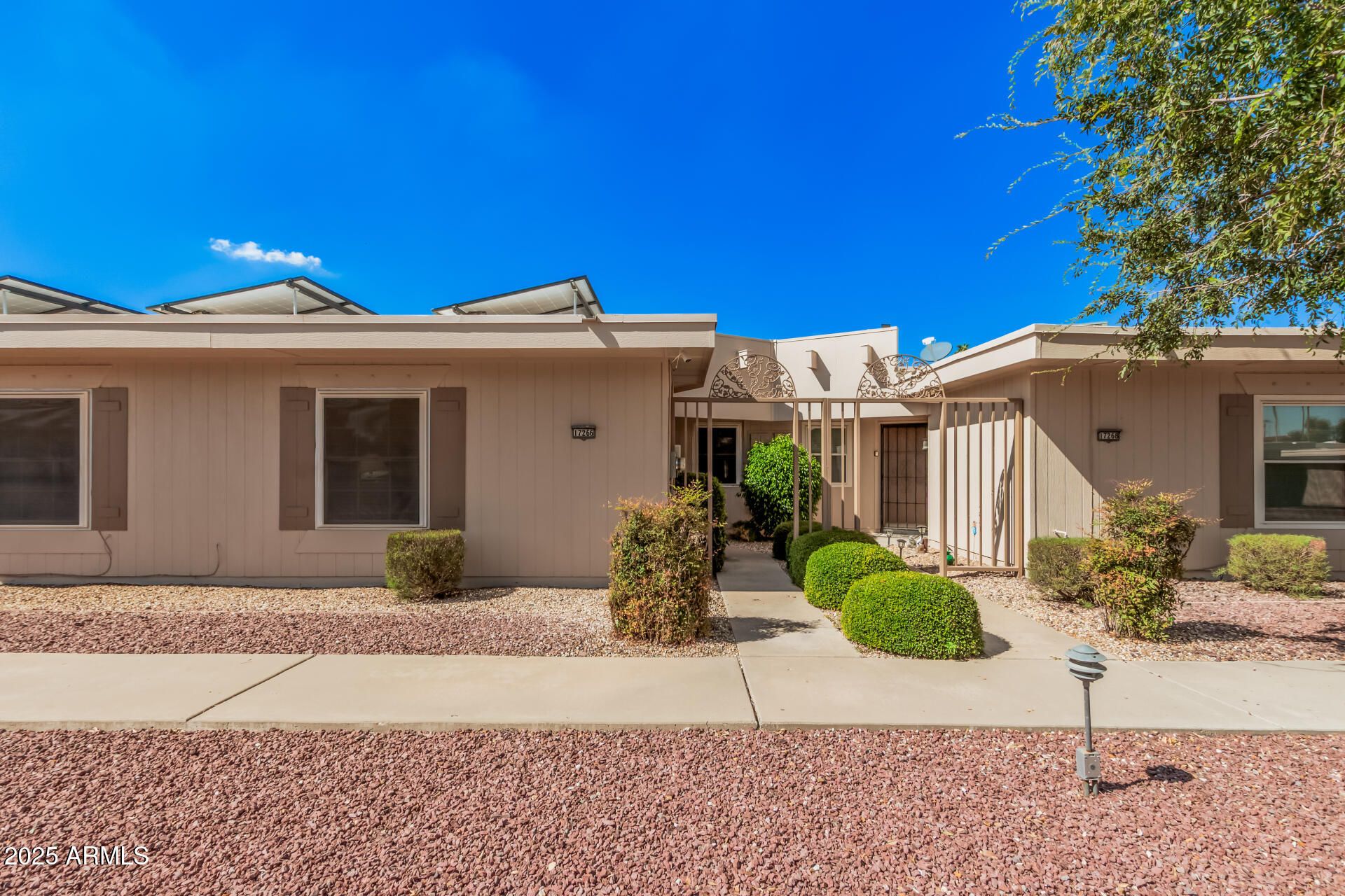 Come see this darling Phase 3 2 bedroom, 2 bath end unit. This home features a newer kitchen, newer appliances and breakfast area. The living/dining area has vaulted ceilings with two sun tunnel/tube skylights bringing more natural light into the room and opens onto a lovely garden and walled, covered porch/patio courtyard that expands the living area. Perfect for entertaining. Both interior bathrooms have safety grab bars and each have a skylight that keep them bright and cheery with natural light during the day. All windows in the home are dual pane. The large bedrooms have roomy walk-in closets. The master bedroom has an ensuite bathroom. Deluxe Armstrong vinyl plank flooring replaced all carpeted areas in 2017. Kitchen, laundry room, hallway and bathrooms are all tiled for easy cleaning. Another great feature is the inside laundry room with newer sink and cabinets. The roof is re-coated every 2 years the most recent being October 2024. The porch and patio courtyard is quite large and offers plenty of shade on our warm summer days. Both front and back courtyards have water sprinklers on timers. The one car garage is quite roomy with storage cabinets along one wall and more cabinet storage with a work counter top on the back wall The common area courtyard is very pretty and has a nice walk-way out to the sidewalk so you can take a stroll when the weather is nice. The home's energy source is solar provided by twenty roof top solar panels and a transferable solar prepaid(20yr) lease subscription plan owned, maintained and warranted for 20yrs by SUNRUN. Sun City offers 7 recreational centers with indoor and outdoor pools, pickleball, golf, lawn bowling, real bowling, fitness centers and clubs for pretty much every interest you can think of and MUCH more! This is truly a place to make friends and live your best life. Come see this home today!