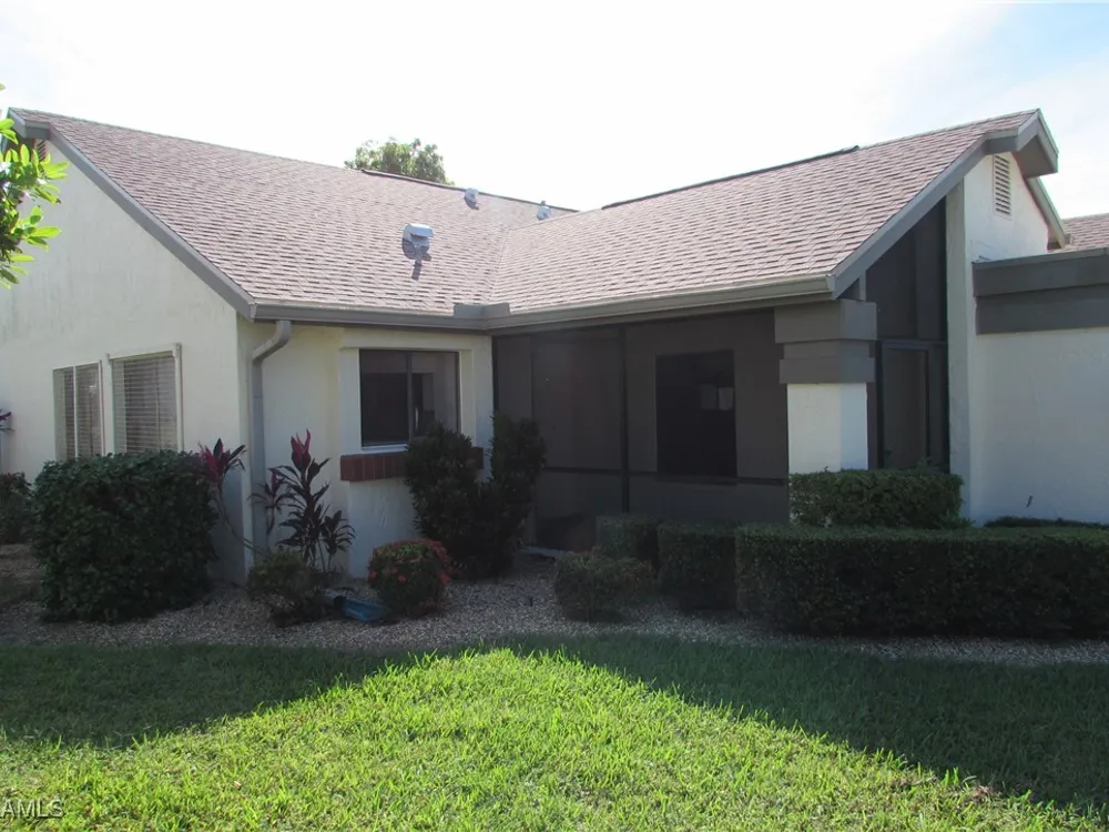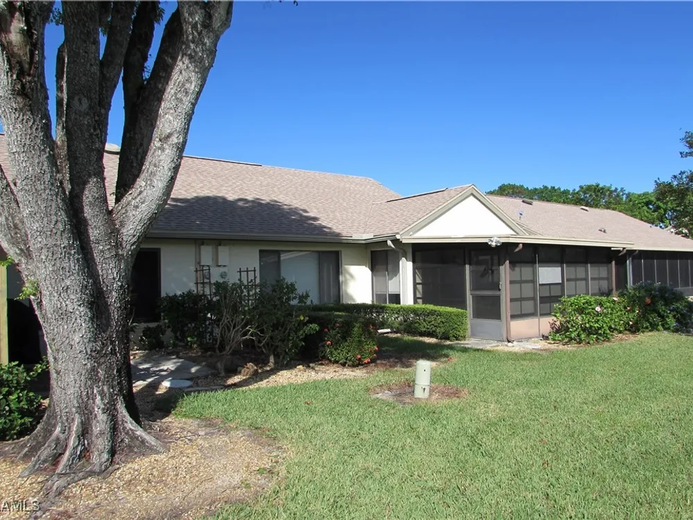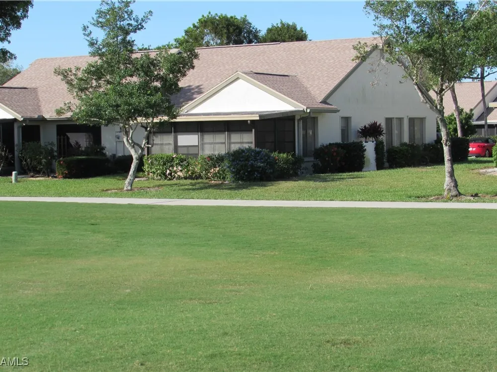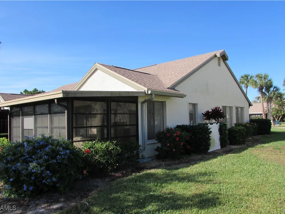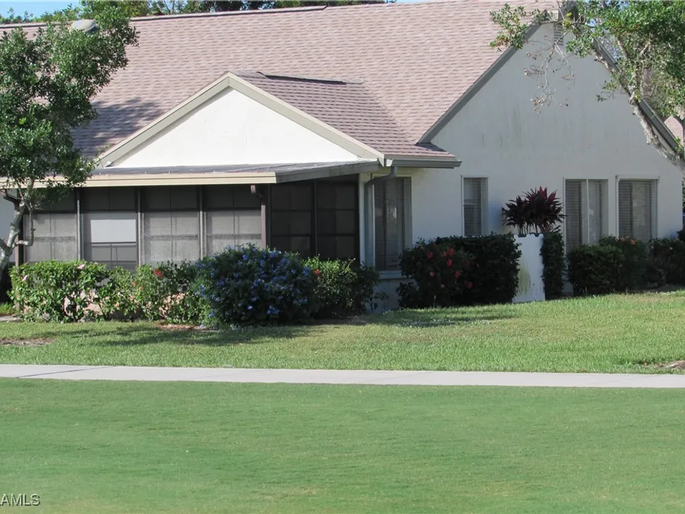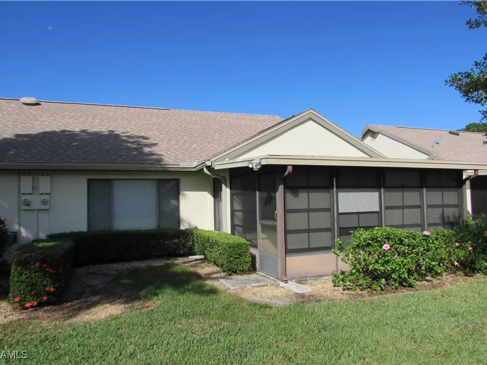 Bring your personal touch to this garden villa overlooking golf course, wide views. Lowest price villa in the community. Large living room with lot of windows, screened lanai and screened front porch, oversized garage and inside laundry. Very active senior living club house with busy social calendar, full service recreation department, restaurant, and with unlimited golf playing privileges, no additional golf fees. Excellent location in South Fort Myers, close to everything the area has to offer