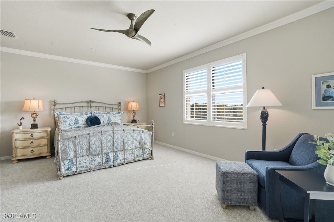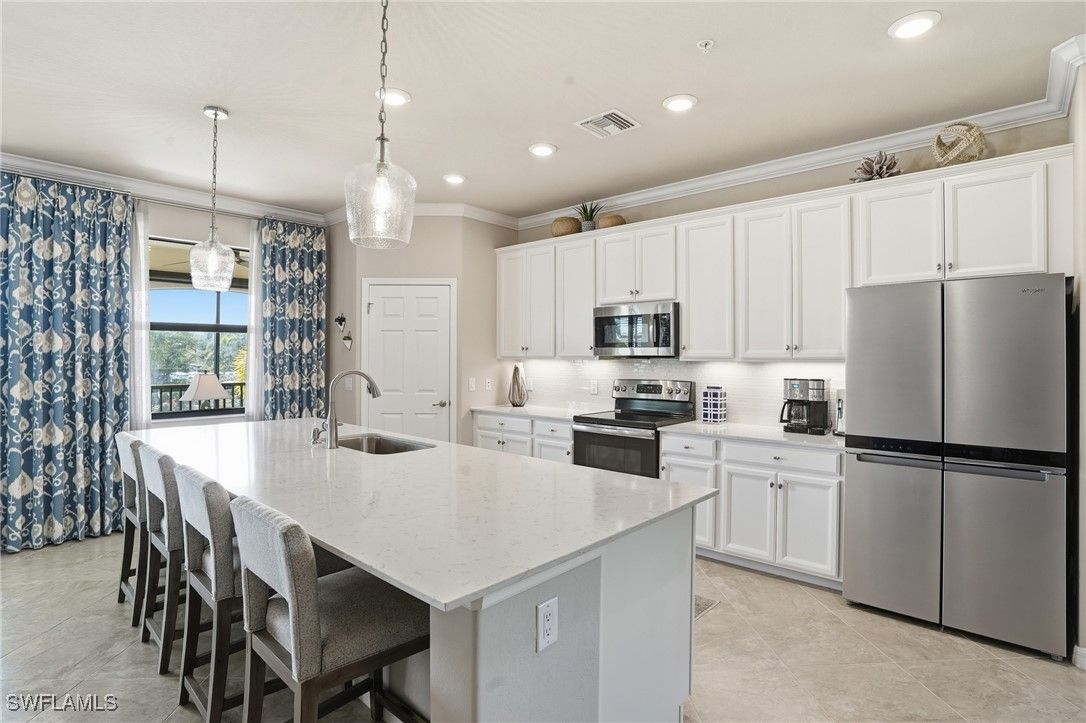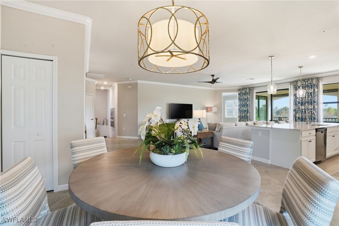 Luxury Living Meets the Florida Tropics at Bonita National! Introducing this exquisitely maintained and fully furnished 3-bedroom, 2-bath coach home with a coveted Social Membership—perfectly located in the prestigious Bonita National Golf & Country Club. Step into your own tropical retreat, where lush landscaping, water views, and gentle Florida breezes create the perfect backdrop for relaxing or entertaining. This home features a 3-car tandem garage and over 2,100 sq. ft. of bright, open living space with crown molding in the entry, living areas, and primary suite, plus custom lighting throughout. The gourmet kitchen is a chef’s dream with white cabinets, quartz countertops, a large island with designer pendants, and under-cabinet lighting. The open living and dining areas flow seamlessly, ideal for entertaining or quiet evenings at home. The primary suite is a private retreat, featuring plantation shutters, crown molding, a sitting area, and custom built-ins in his-and-her walk-in closets. The primary bathroom features upgraded lighting, faucets, and protective shower coating, while the guest bath has a custom shower door, lighting, mirror, and faucets. Step outside to the lanai with water and nature views, eastern exposure for morning coffee and sunrise, perfect for relaxing or entertaining. The home also includes hurricane windows and sliders and roll-down lanai shades. Residents enjoy resort-style amenities, including a gorgeous pool, spa, fitness center, tennis courts, clubhouse, and coming soon—pickleball and bocce ball! Social memberships include all amenities except golf (available off-season May–November). Additional convenience includes huge under-stair storage, perfect for bikes, seasonal décor, or extra household items. With its stunning finishes, turnkey condition, and tropical Florida lifestyle, this home offers the perfect setting to live, entertain, and unwind in style.