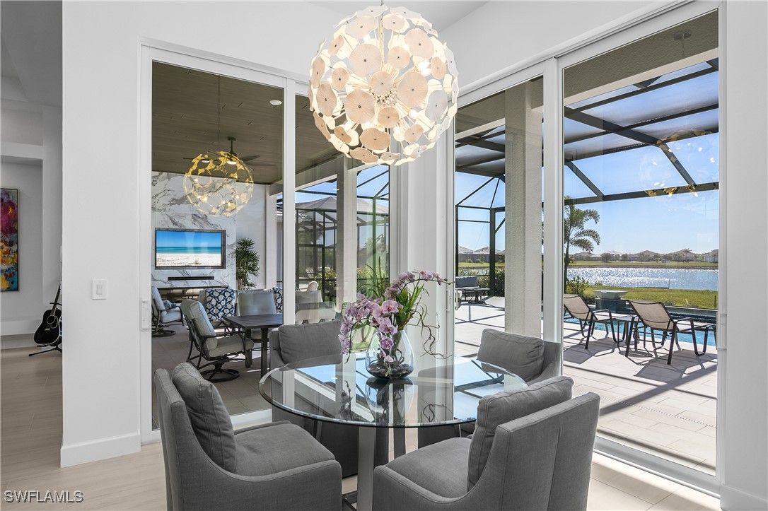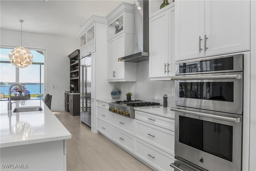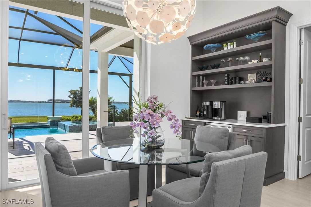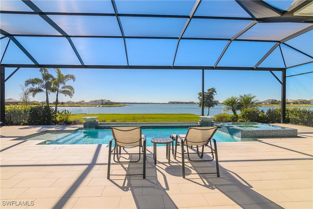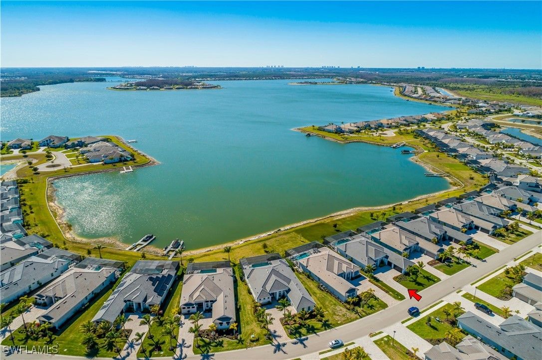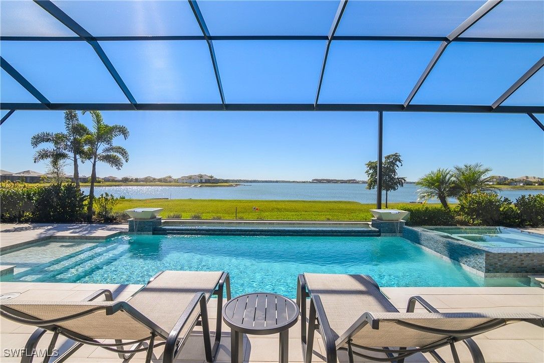 Welcome to this exceptional, one-of-a-kind, Iris floor plan in the prestigious lake and boating community of WildBlue, where thoughtful design meets elevated waterfront living. With over $400K in after-market upgrades, this home is perfectly positioned on the lake with coveted SOUTHERN exposure, the LONGEST water view, and plenty of natural light throughout the day. Completely reimagined with no detail overlooked, the heart of the home features a brand-new custom kitchen by Cornerstone, showcasing elegant cabinetry with lighted glass upper cabinets and a full suite of JennAir appliances. The entry wall was removed to create a more open and welcoming foyer, setting the tone for the home’s modern, sophisticated feel. A show-stopping, climate-controlled wine wall with capacity for approximately 500 bottles adds both function and drama—perfect for entertaining and collectors alike. Designer high-end lighting fixtures and chandeliers elevate every space, while custom interior feature walls and California Closets add style and organization. A whole-home water softener system enhances everyday comfort. Outdoor living is equally impressive, offering a sprawling custom pool and spa, picture-frame lanai screen for unobstructed lake views, and a stunning custom outdoor feature wall paired with a fully equipped outdoor kitchen—creating the ideal setting for year-round Southwest Florida living. Located within WildBlue, residents enjoy access to resort-style amenities including boating, water sports, pickleball, tennis, dining, and an active social calendar, with optional golf memberships available at nearby Grandezza. This is a rare opportunity to own a designer-finished lakefront home with southern exposure and timeless upgrades in one of the area’s most sought-after communities.