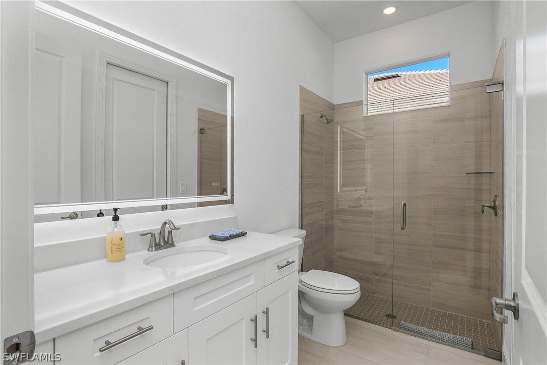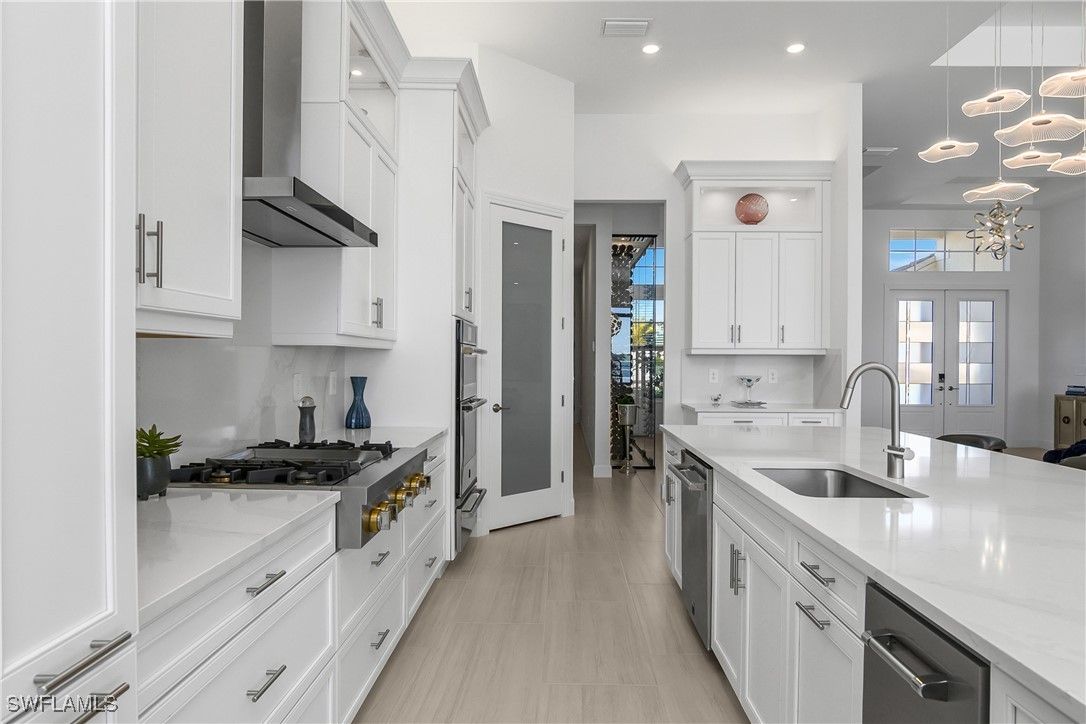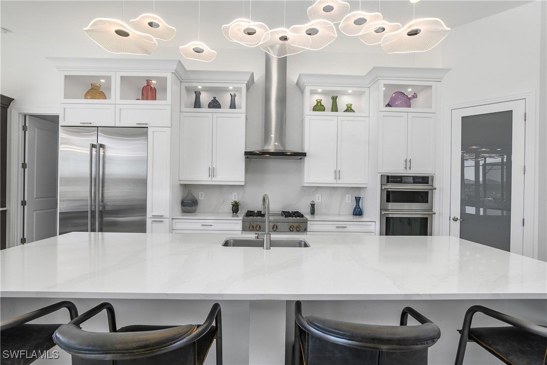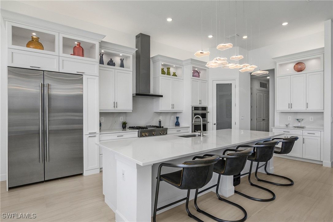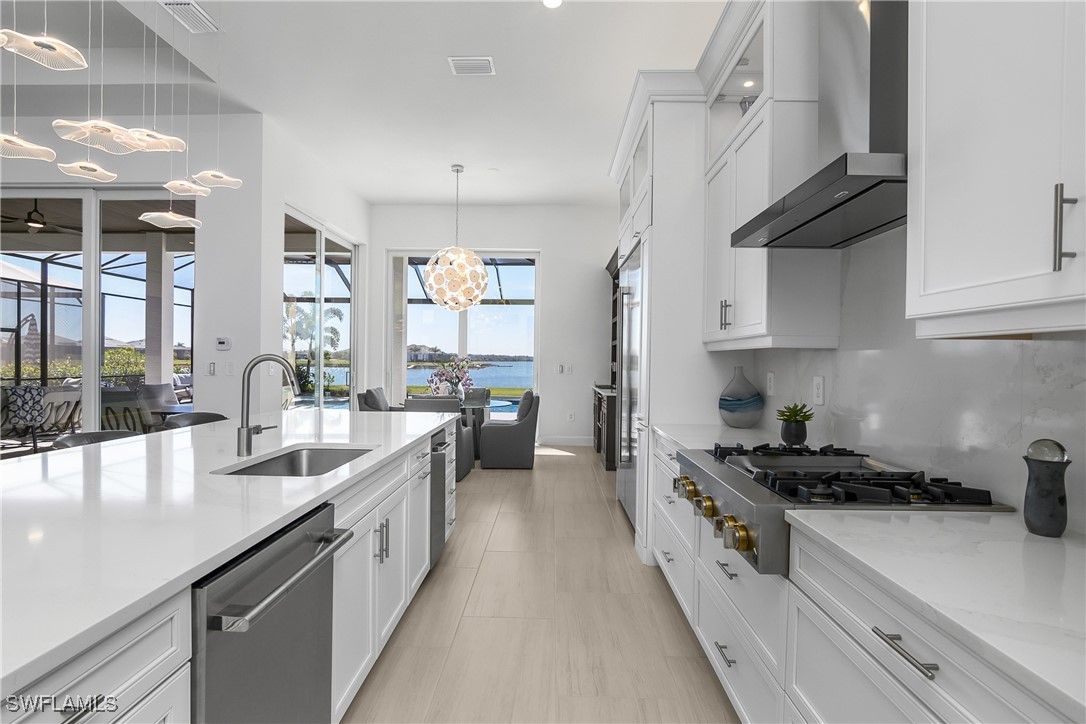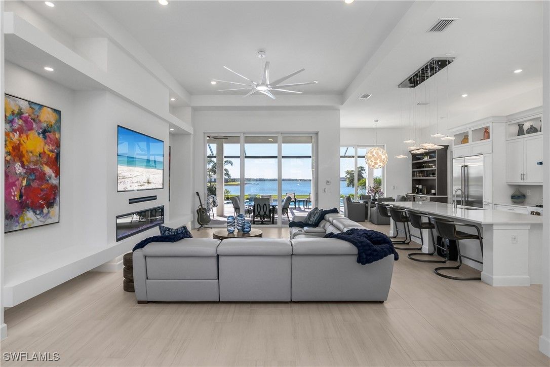 Welcome to this exceptional, one-of-a-kind, Iris floor plan in the prestigious lake and boating community of WildBlue, where thoughtful design meets elevated waterfront living. With over $400K in after-market upgrades, this home is perfectly positioned on the lake with coveted SOUTHERN exposure, the LONGEST water view, and plenty of natural light throughout the day. Completely reimagined with no detail overlooked, the heart of the home features a brand-new custom kitchen by Cornerstone, showcasing elegant cabinetry with lighted glass upper cabinets and a full suite of JennAir appliances. The entry wall was removed to create a more open and welcoming foyer, setting the tone for the home’s modern, sophisticated feel. A show-stopping, climate-controlled wine wall with capacity for approximately 500 bottles adds both function and drama—perfect for entertaining and collectors alike. Designer high-end lighting fixtures and chandeliers elevate every space, while custom interior feature walls and California Closets add style and organization. A whole-home water softener system enhances everyday comfort. Outdoor living is equally impressive, offering a sprawling custom pool and spa, picture-frame lanai screen for unobstructed lake views, and a stunning custom outdoor feature wall paired with a fully equipped outdoor kitchen—creating the ideal setting for year-round Southwest Florida living. Located within WildBlue, residents enjoy access to resort-style amenities including boating, water sports, pickleball, tennis, dining, and an active social calendar, with optional golf memberships available at nearby Grandezza. This is a rare opportunity to own a designer-finished lakefront home with southern exposure and timeless upgrades in one of the area’s most sought-after communities.