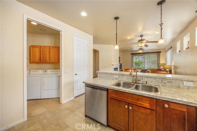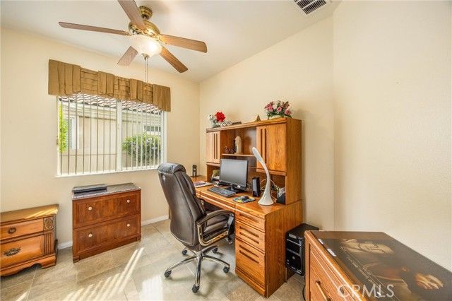 Welcome to resort-style living in the highly sought-after 55+ community of Solera at Oak Valley Greens-where comfort, elegance, and active living come together. This beautifully upgraded 2-bedroom, 2-bath home with a versatile den offers the perfect blend of style and functionality. The thoughtfully designed interior features marble countertops, newer stainless-steel appliances, and a fully upgraded kitchen ideal for both everyday living and entertaining. Enjoy tile flooring throughout main living areas, complemented by newer carpet in the bedrooms for added comfort. The spacious primary suite boasts an updated bathroom with a stunning walk-in shower. Additional highlights include a newer HVAC system, along with recent exterior paint and newer gutters for peace of mind. Step outside to your beautifully maintained backyard, complete with mature trees and fruit trees, offering privacy and a serene outdoor setting perfect for relaxing or hosting guests. Residents of Solera enjoy a guard-gated, resort-style community featuring an impressive clubhouse, fitness center, pool and spa, walking trails, tennis and bocce courts, and a full calendar of social activities and clubs designed for an active adult lifestyle. The community is ideally located near the Oak Valley Greens Golf Course, s
