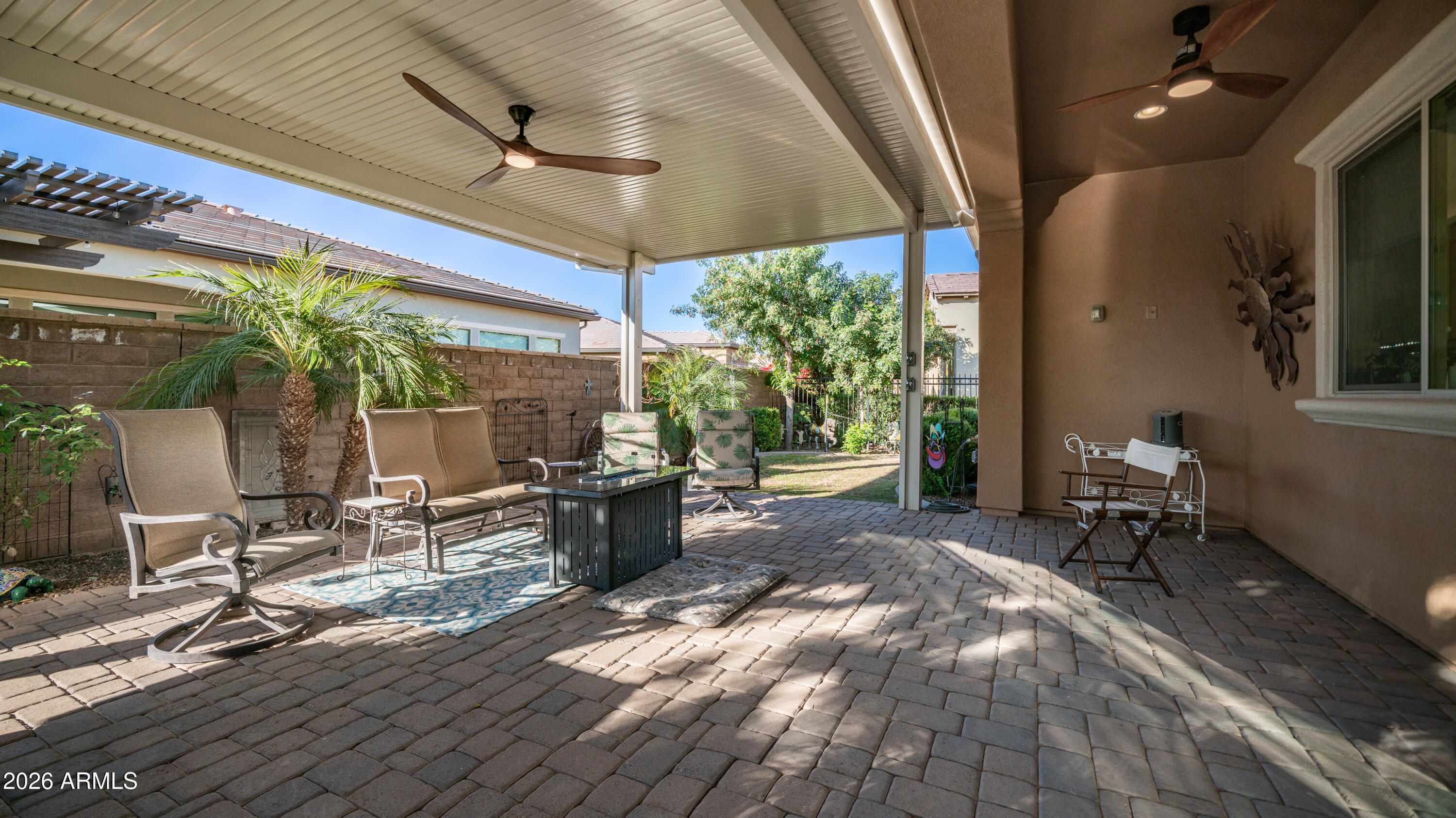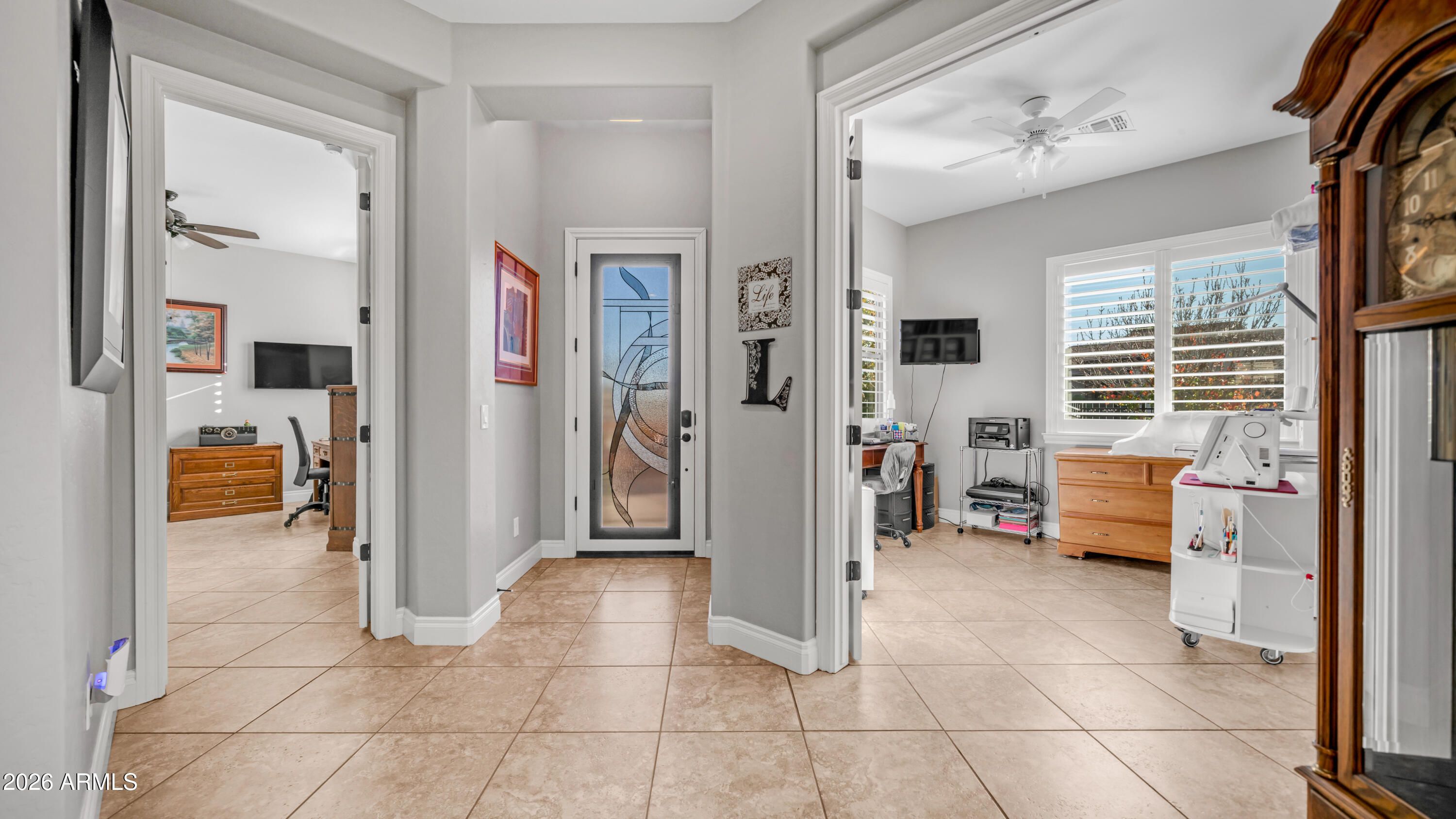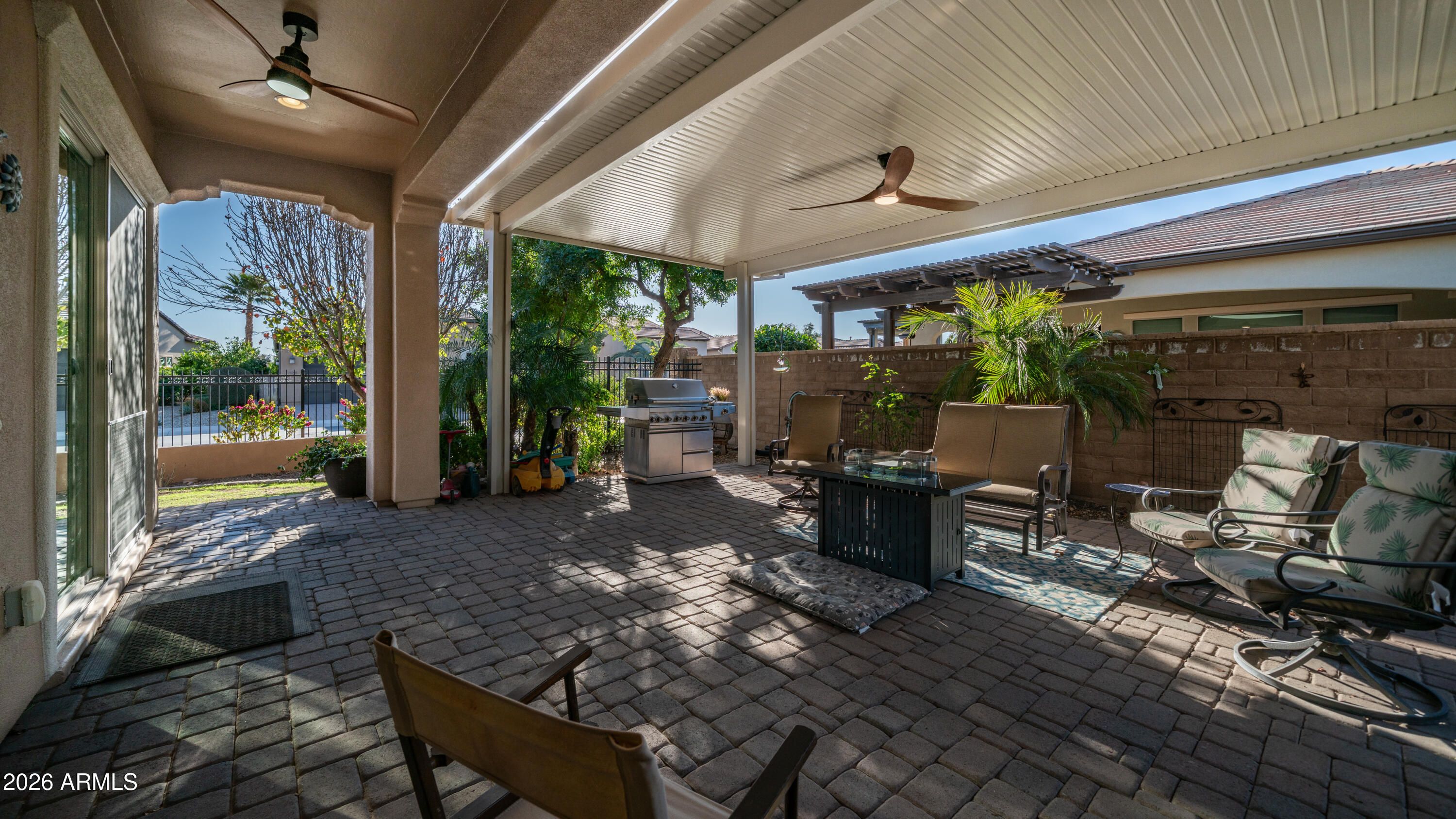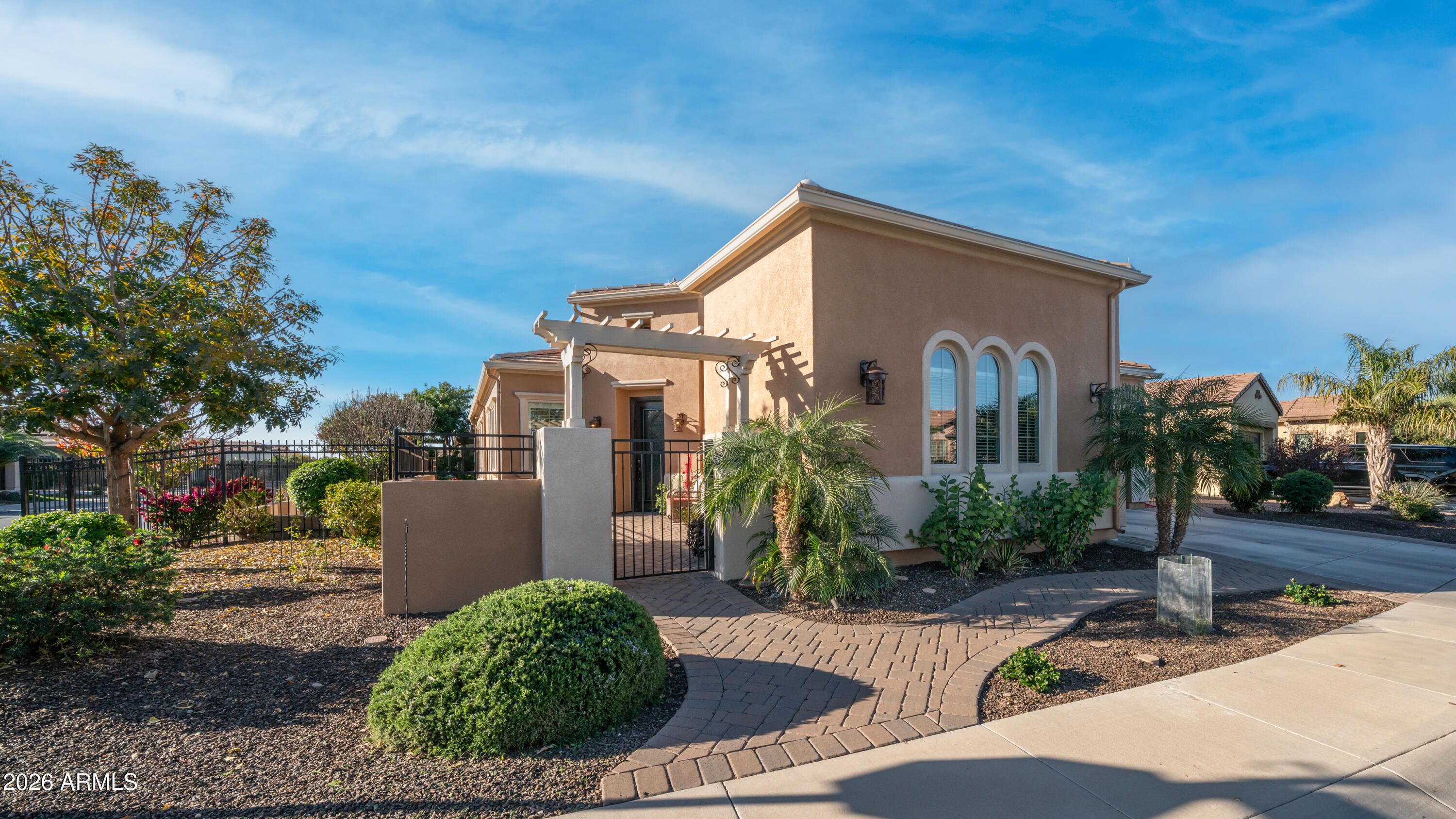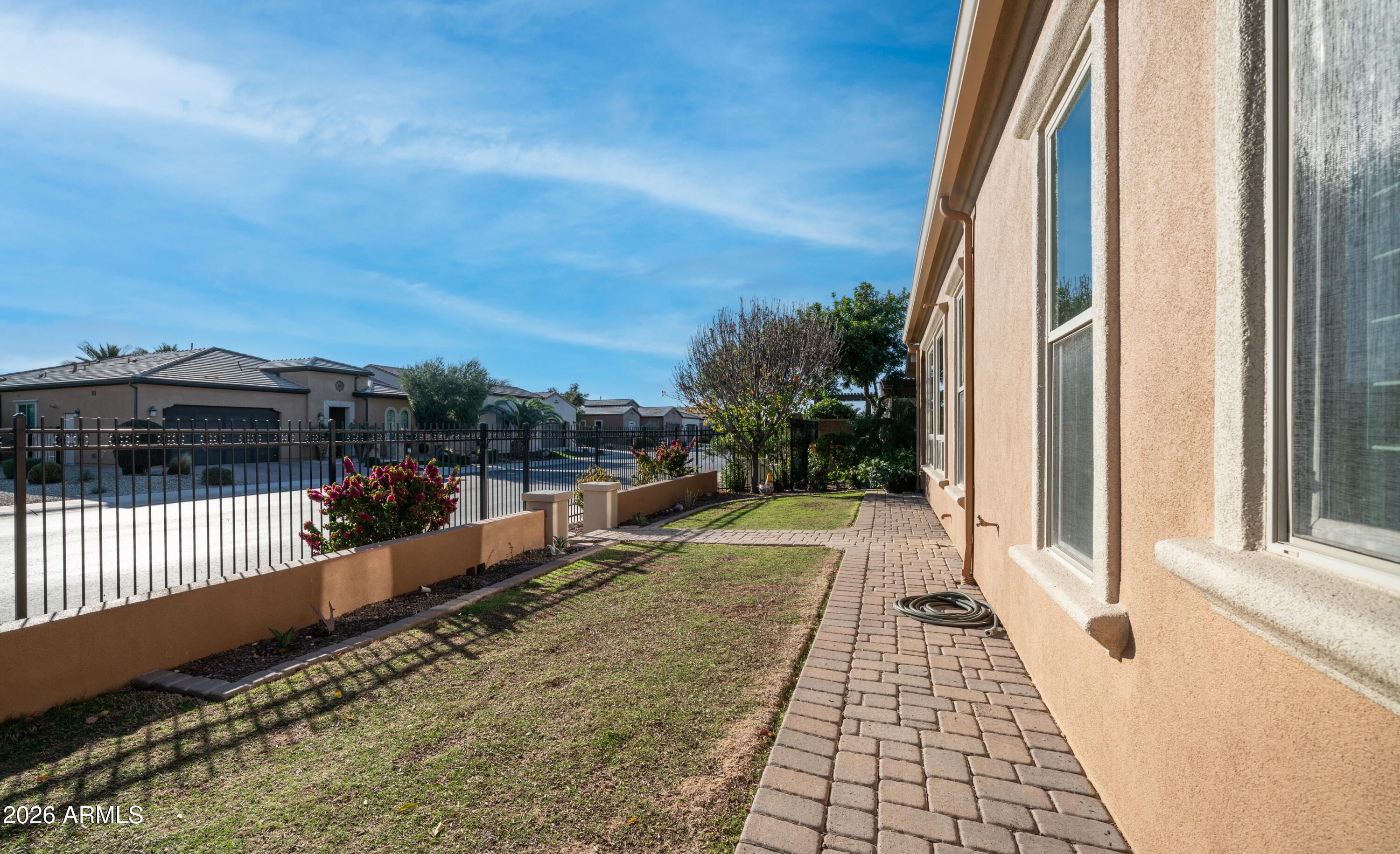 Beautiful Home on a Large Corner lot with a 3 car Garage. Custom Pavers on side yard of home and backyard with Custom Arbor Patio for Shade and outdoor living. Open Great room floorplan with Chefs style kitchen, granite island, gas cooktop and all stainless appliances. Upgraded Cabinetry and lighting throughout. Split floorplan with large master bedroom Walkin shower and closet. 2 separate dens with large laundry room. 20'' diagonal tile flooring throughout Upgraded stone counter tops in both bathrooms. 2025 New Exterior Painting with new patio cover, drip for plants and trees. Amazing subdivision with golf, community pools, work out facility, tennis, pickleball and restaurants.