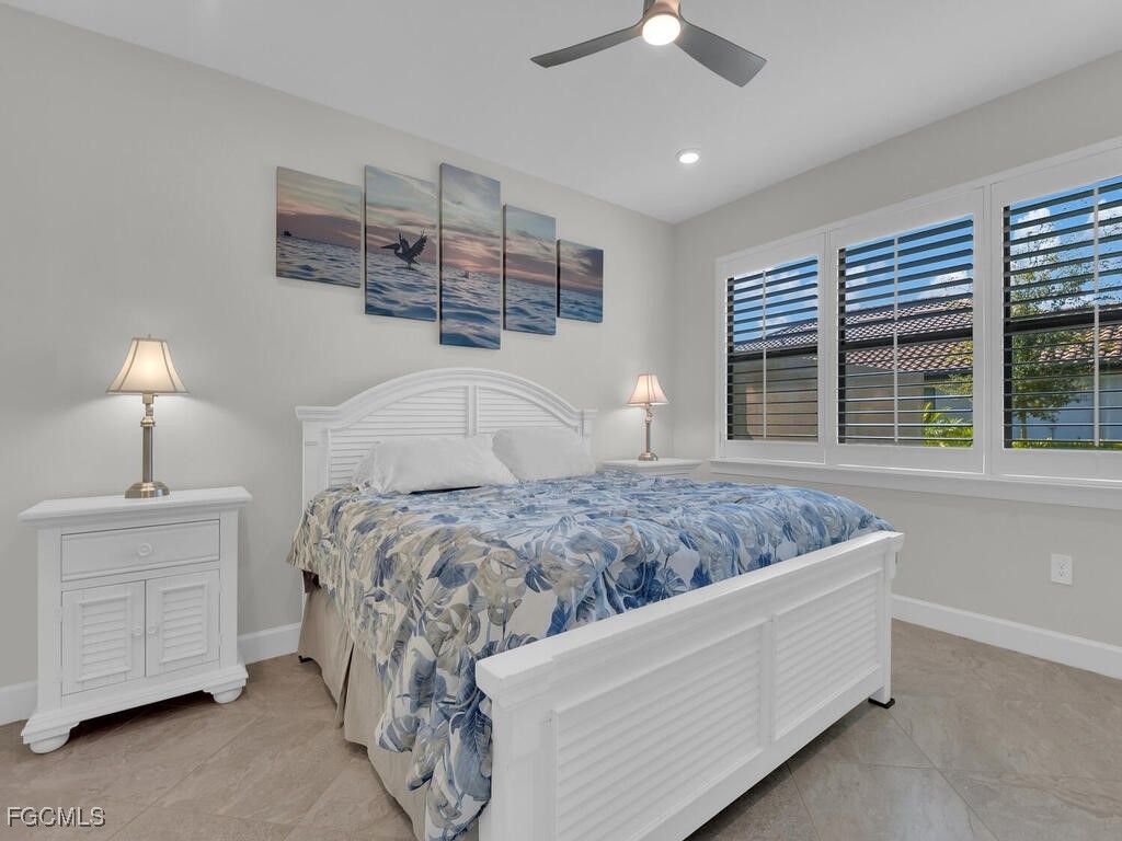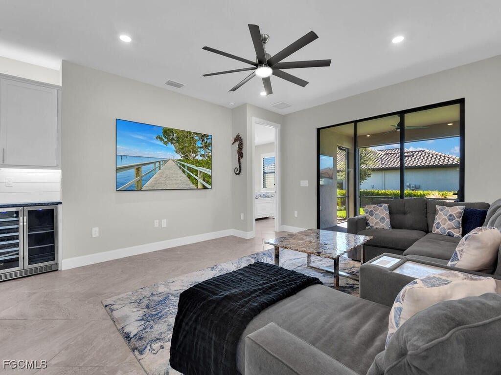 Experience everyday luxury in this inviting two-bedroom plus den villa located in the sought-after Esplanade Lake Club. As an end unit, this home offers added privacy and abundant natural light throughout its open-concept living area. The spacious great room flows effortlessly into a stylish kitchen featuring quartz counters, a pantry, stainless steel appliances and gas stovetop , and a large center island perfect for casual dining or entertaining with an additional custom bar/beverage built-in cabinet area. The versatile den provides the ideal space for a home office complete with a bulit-in murphy bed and shelves. The tile flooring runs throughout the home, pairing with neutral finishes to create an airy, modern aesthetic. The primary suite offers a peaceful retreat with a large walk-in closet with custom closet organizers and a private, well-appointed bath. The guest bedroom and full bath are thoughtfully positioned to provide comfort and separation for visitors. Additional highlights include a large laundry room and a two-car attached garage with bulit-in cabintry. Home features plantation shutters throughout. The outdoor living space features a custom built-in kitchen and an extended covered lanai overlooking beautifully manicured landscaping—perfect for quiet morning coffee or relaxing evenings at sunset. Esplanade Lake Club is a premier gated, lakefront community built on 778-acre, positioned on a 352-acre recreational lake, and designed for resort-style living. Residents enjoy amenities including a stunning pool and cabanas, Bahama Bar & Grille, fitness center, sports courts, walking and biking paths, boat ramp, kayak launch, dog park, and private beach areas. Located within minutes of RSW Airport, restaurants, golf, and shopping, this low-maintenance property offers the best of Florida living—comfort, convenience, and coastal elegance.