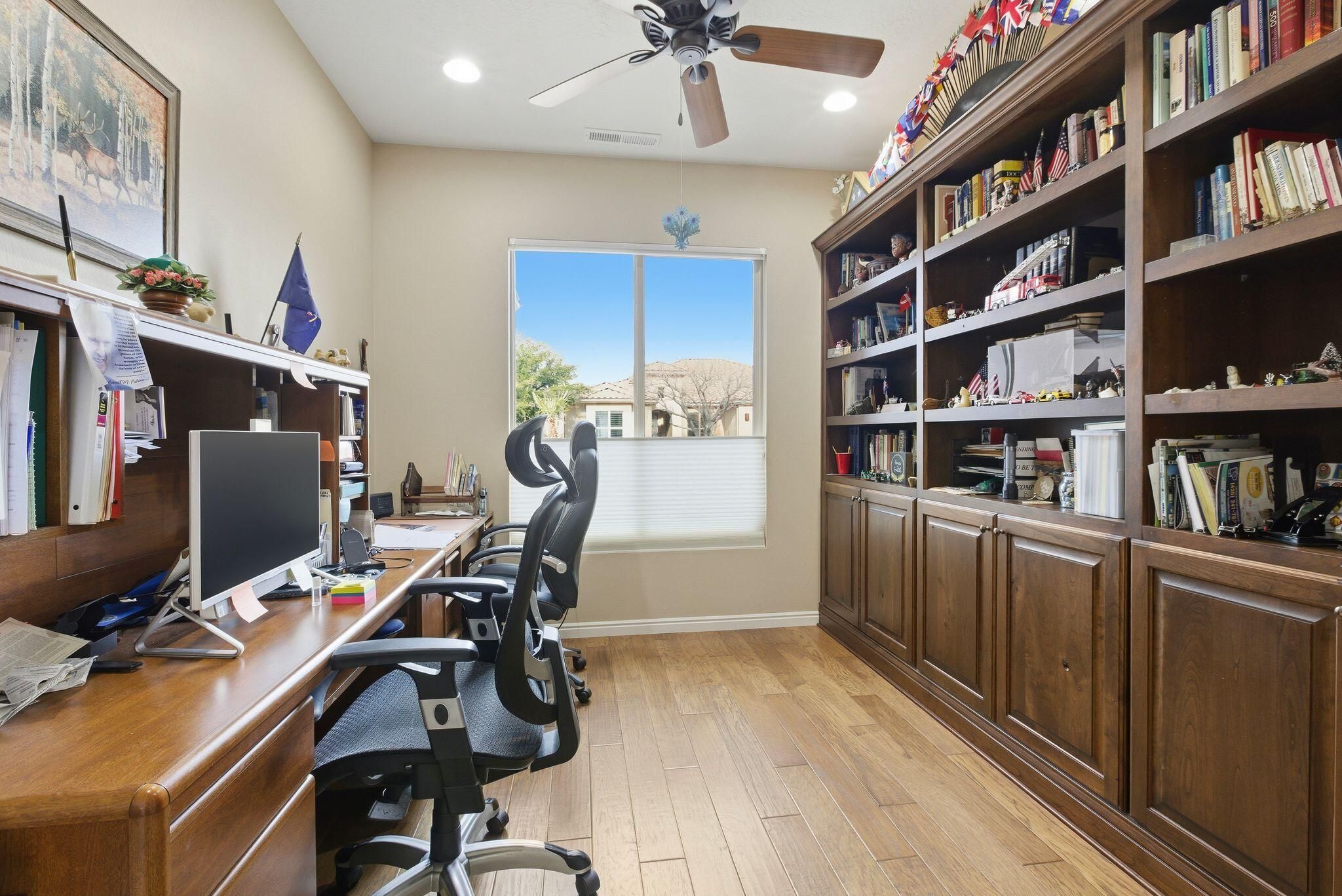 Welcome to SunRiver luxury living! This bright and airy home features a spacious front courtyard, an open-concept living area, built-ins, and a dedicated office. The kitchen features granite countertops and stainless steel appliances. Washer and dryer are included. The primary suite includes a walk-in shower and a generous walk-in closet. There is a large climate-controlled 4-car garage with a separate storage room and its own mini-split. Enjoy modern comforts, including top-down/bottom-up blinds and remote-controlled electric shades. The backyard opens to a common area, creating a sense of openness, privacy, and spaciousness. Perfect for relaxed desert living.