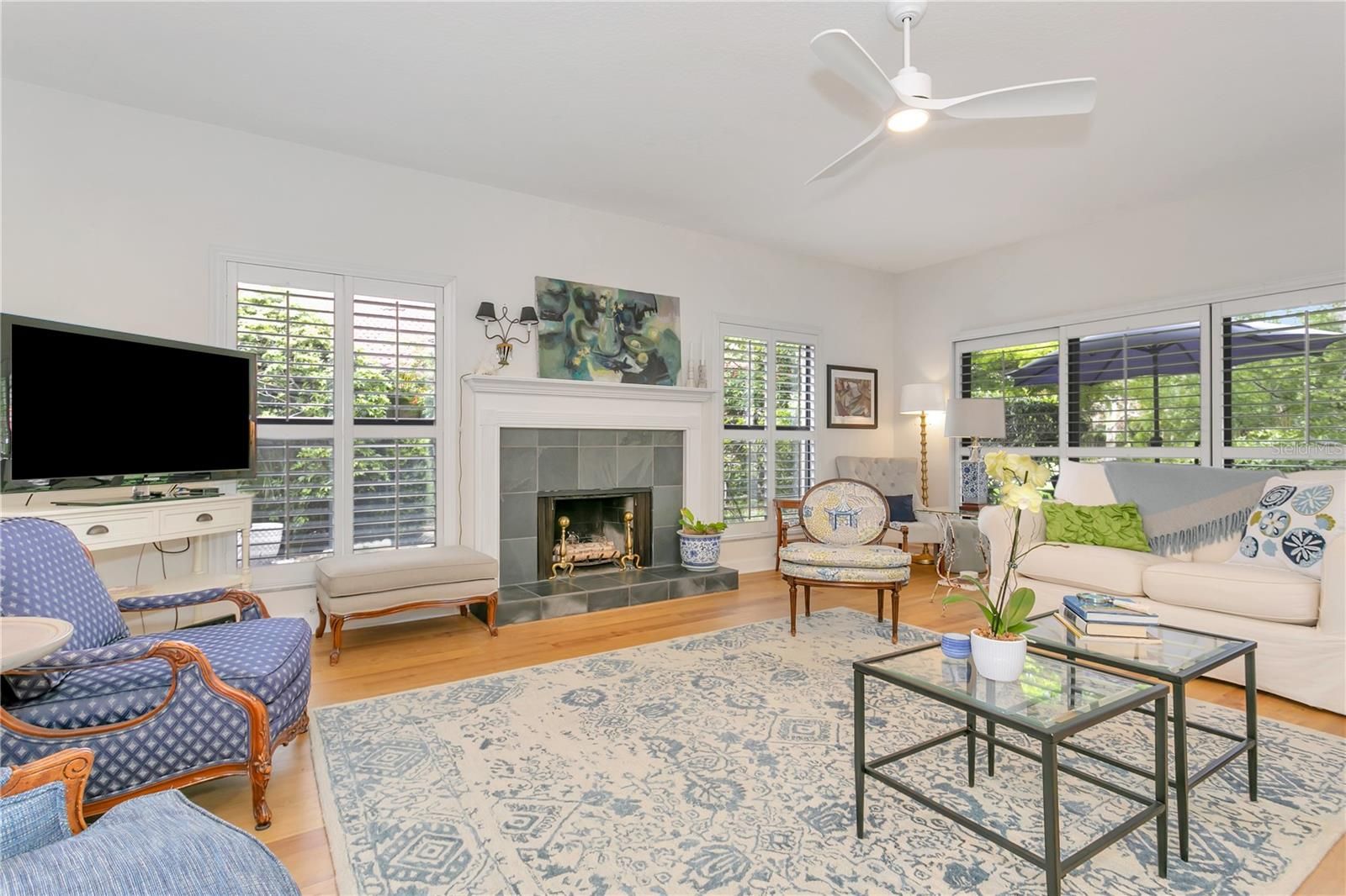 THIS RARELY AVAILABLE and highly sought-after Landings Carriage Home, nestled within mature landscaping and offering verdant vistas from every room, is ready for its next owner. This residence lives like a single-family home, featuring a charming living area with a wood-burning fireplace, custom mantle, glass-topped shelf divider, and LVT plank flooring. Abundant windows fill the home with natural light, while plantation shutters provide privacy and character. The surrounding landscaping includes hibiscus, palms, ferns, and flowering trees, supported by an irrigation system, creating a peaceful garden setting. A paver driveway and walkway enhance the welcoming curb appeal. The split floor plan offers privacy, with a spacious primary suite featuring a dressing-room-style closet. The updated primary bathroom includes a walk-in shower with travertine, stone vanity top, high ceilings, and mirrored and tiled accents. The suite also features a ceiling fan and access to a private patio. The guest bedroom offers two closets and a full patio door for natural light. The second bathroom includes a granite-top vanity and tub/shower combination. The dining area is highlighted by a coastal-style glass bead chandelier. A glass-enclosed lanai provides flexible space for an office, den, or guest area. The kitchen features newer stainless steel appliances, granite countertops, a breakfast area, and a patio door leading to a private walled courtyard with a ceramic tiled fountain—ideal for relaxing or outdoor dining. Residents of The Landings enjoy scenic nature trails leading to Roberts Bay, along with a private fishing gazebo and kayak launch. Conveniently located between the Siesta Key bridges and approximately seven miles to downtown Sarasota. THIS IS THE LOCATION!! New additional gutters (2025), new TPO lanai roof (2026), new barrel tile roof (2022 association maintained), tankless hot water heater, new GE stacked full size washer and dryer with wifi capability (2021), new stainless steel Kitchen Aid appliances (2023), new garbage disposal (2024), new wifi controlled thermostat (2022), newer A/C system, create a home for you to easily move right into. Landscaping and building exterior maintenance are included in the monthly fees, so you are free to take advantage of the ideal Landings location—strategically developed as one of Sarasota’s premier gated communities with optional Racquet Club membership with 8 Har-Tru tennis courts, pro shop, fitness center, meeting rooms, pool and spa. The Landings has a lush well maintained nature trail that leads to Roberts Bay with a private fishing gazebo and rental space to park your kayak. Midway between the two Siesta Key bridges and approximately 7 miles from downtown—this is THE LOCATION.”