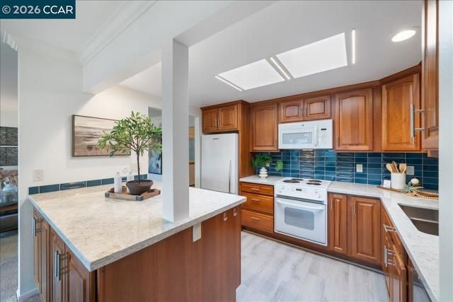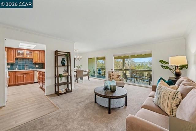 Set atop Oakmont Dr. sits a sophisticated Sequoia 2/1 co-op with stylish updates and a remodeled kitchen and bath in Rossmoor, the premier 55+ community. Peaceful hill and tree views from the open balcony, with morning sun and afternoon shade. Features include solid wood doors, dual pane windows and slider, plantation shutters, smooth ceilings, stacked laundry, step-in shower, crown molding, mirrored closet doors, LVP flooring in entry, kitchen & bath, updated cabinetry with soft close drawers and pull out shelves, finished kitchen skylight, plus lots of storage! Great location near Hillside Clubhouse, swimming, lawn bowling, bocce, & nearby Gateway Clubhouse with arts & crafts studios, movie theatre, library, and so much more! Welcome home!