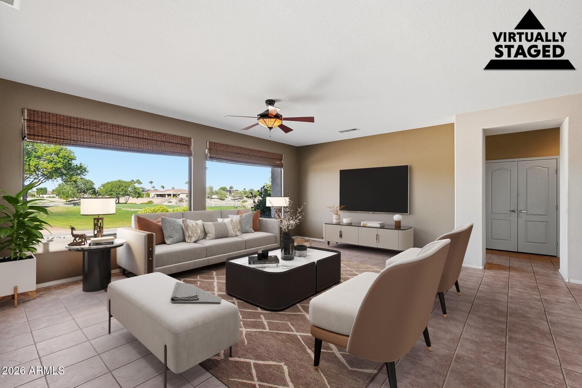 Location is everything and this home delivers it all. Perfectly situated on a golf course with peaceful lake views in one of Arizona's most desirable resort communities, this expanded Stonecrest model offers the ultimate escape to sunshine and serenity. Enjoy an open, light-filled layout with three spacious bedrooms and a relaxing primary suite with oversized bath. Step outside to warm desert evenings overlooking manicured fairways and water views. Residents experience true resort living with championship golf, pools, fitness centers, pickleball, tennis, and an active social scene. Just minutes from shopping, dining, and freeway access. This is where winter turns into paradise.