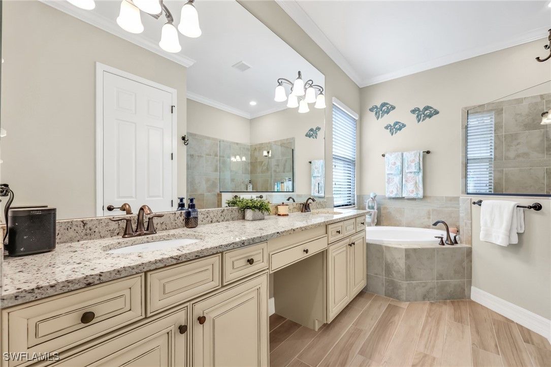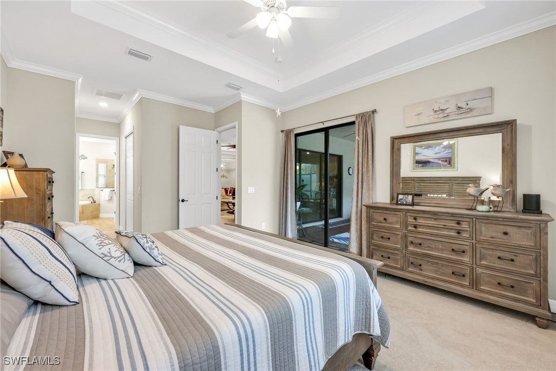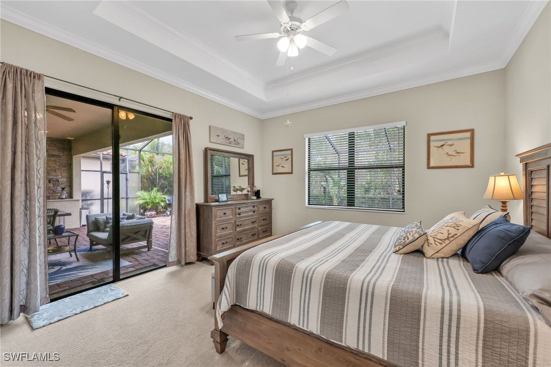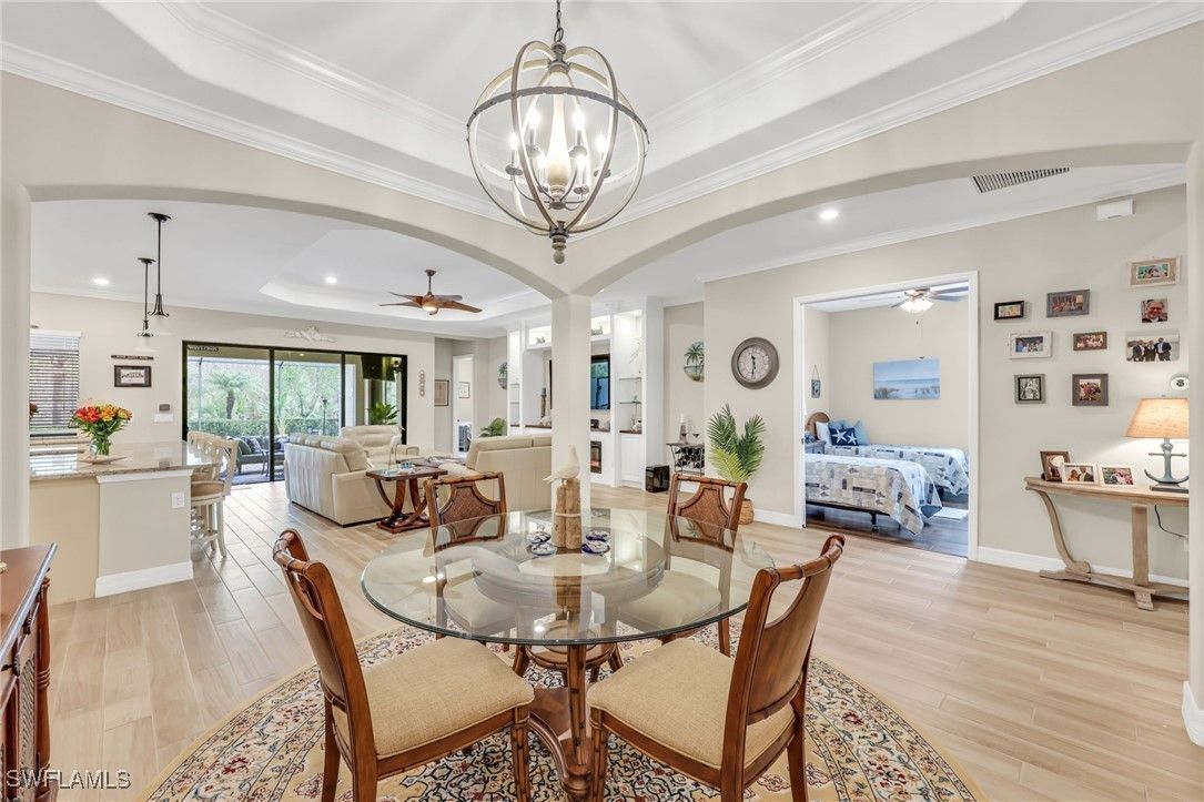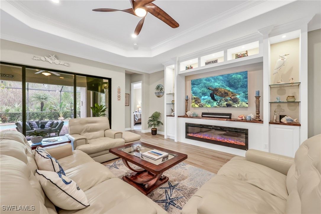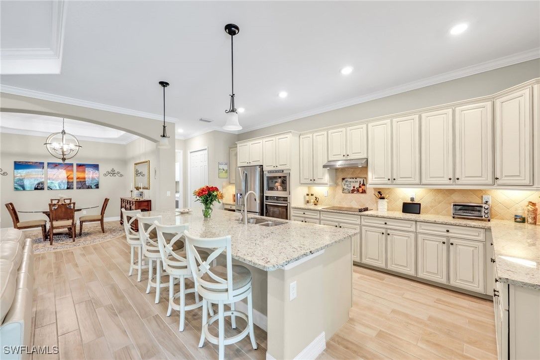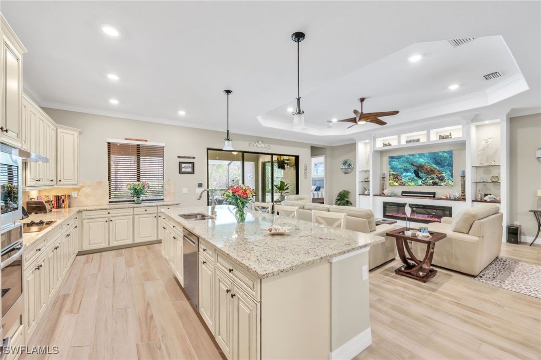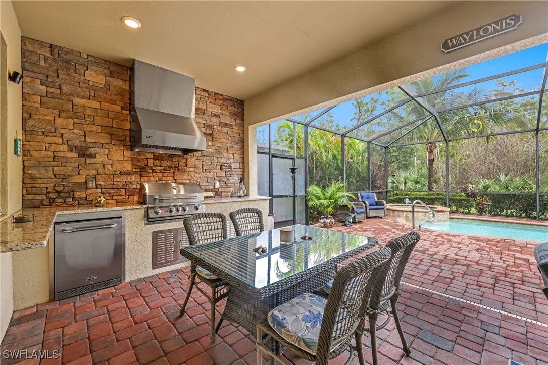 *SOCIAL MEMBERSHIP INCLUDED* Nestled on a peaceful preserve lot in the highly sought-after gated community of Bonita National Golf & Country Club, this meticulously maintained and thoughtfully upgraded 3-bedroom, 2-bath home offers the perfect blend of comfort, style, and convenience. The open-concept layout showcases plank tile flooring in the main living areas, soaring coffered ceilings, crown molding throughout, recessed lighting, and abundant natural light. The upgraded kitchen is a chef’s delight, featuring granite countertops, stainless steel appliances, a NEW dishwasher, walk-in pantry, spacious center island, and a refrigerator with instant hot water—ideal for both everyday living and entertaining. The expansive living room is enhanced by custom built-in shelving and a cozy fireplace, creating an inviting space to relax or host guests. Step outside to your private oasis—a spacious screened lanai with designated areas for both sunbathing and covered outdoor dining. Enjoy the fully equipped outdoor kitchen, sparkling saltwater pool (NEW PUMP 9/2025), and relaxing spa, all set against a serene preserve backdrop that ensures privacy and tranquility. This home is loaded with valuable upgrades, including impact-resistant windows and doors, solar panels for energy efficiency, and an epoxy-coated 2-car garage. The laundry room includes a utility sink and comes equipped with a washer and dryer for added convenience. Best of all, the property is located outside of a flood zone for added peace of mind. As a bonus, a social membership is included—no golf dues required. Enjoy resort-style amenities including a waterfall pool, tennis courts (pickleball coming soon), full-service spa, fitness center, and on-site dining at the elegant clubhouse. All just minutes from the Gulf beaches, fine dining, shopping, and entertainment. Additional recent care includes a professionally power-washed roof, keeping the home’s exterior looking fresh and well-maintained.