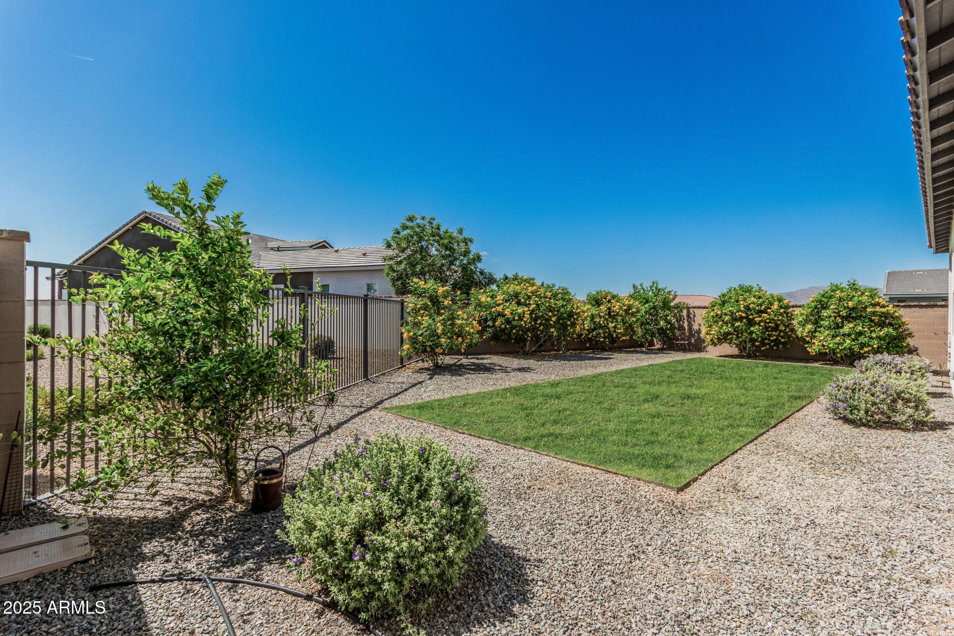 This rare secluded golf course (and oversized lot), gives you the golf course lot vibe with tons of privacy. This home boasts: North/South facing lot with sunrise and sunset views, sits on an oversized corner lot with mature fruit bearing trees, extended 3-car garage, upgraded tile and countertops throughout, double ovens and upgraded cabinetry and kitchen appliances, under cabinet recessed lighting, Sante Fe flat finish walls, 3rd bedroom with French doors, wide slat plantation shutters, 12 ft patio slider, water softener, and overhead garage storage. This single story gem features 10 ft ceilings and a HUGE great room. Perfect for entertaining. Sterling Grove Golf & Country Club is the West Valley's newest golf experience. The Golf Course is a world-class Nicklaus Design course, operated by the renowned Troon Golf Management Services and designed to be enjoyed by golf enthusiasts and newcomers alike. The state-of-the-art practice facilities are second to none. Hone your skills at the driving range, putting and chipping greens, or in the golf simulator. This home has first-class amenities and beautiful views of the White Tank Mountains, lakes, and ponds. You'll also enjoy the neighborhood greenery on your walks, jogs, bike rides!