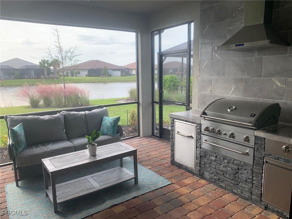 Look no further than this furnished villa with outdoor kitchen that over looks beautiful lake located in Esplanade Lake Club. Enjoy spectacular sunsets from your lanai. This home as many builder upgrades, which include wood look tile in every room, along with additional upgrades after closing. Home has been roughed in for pool if you would decide to add. Perfect location, close to 1-75, airport, shopping restaurants and only a short drive to our beautiful beaches. You will absolutely love living in the resort style community with all the amenities if has to offer, including the fitness center, resort style pool and spa, Bahama bar and restaurant with views of lake and pool area, white sand beach area, tennis and pickleball courts, dog park, community boat launch and the list goes on....