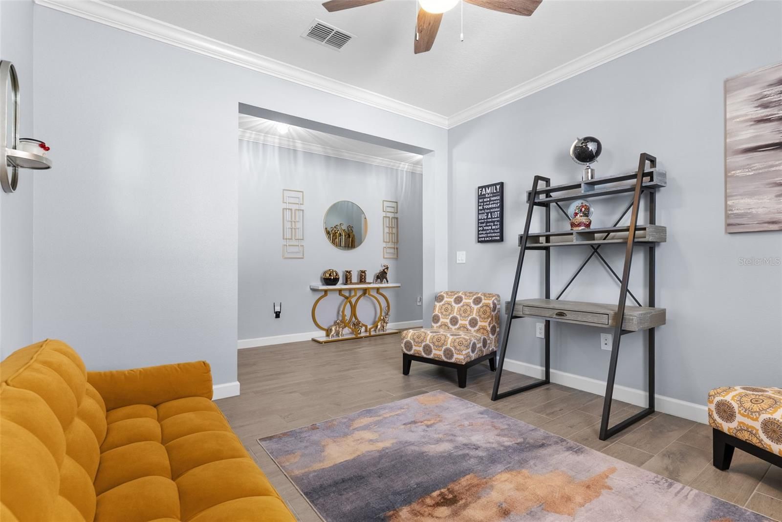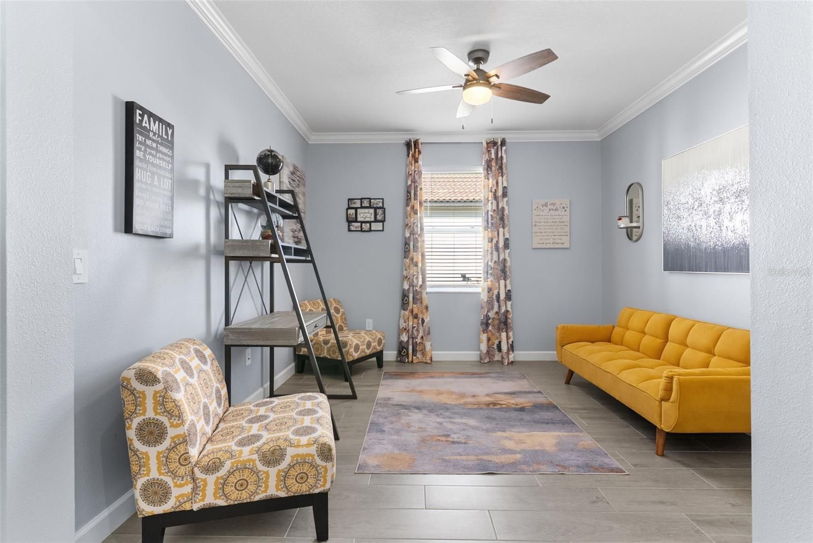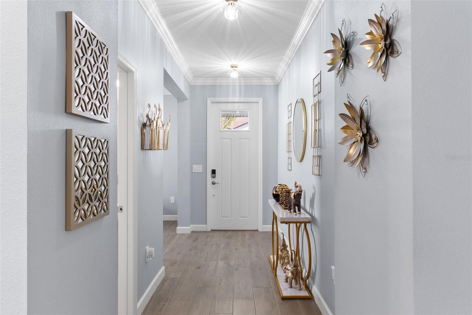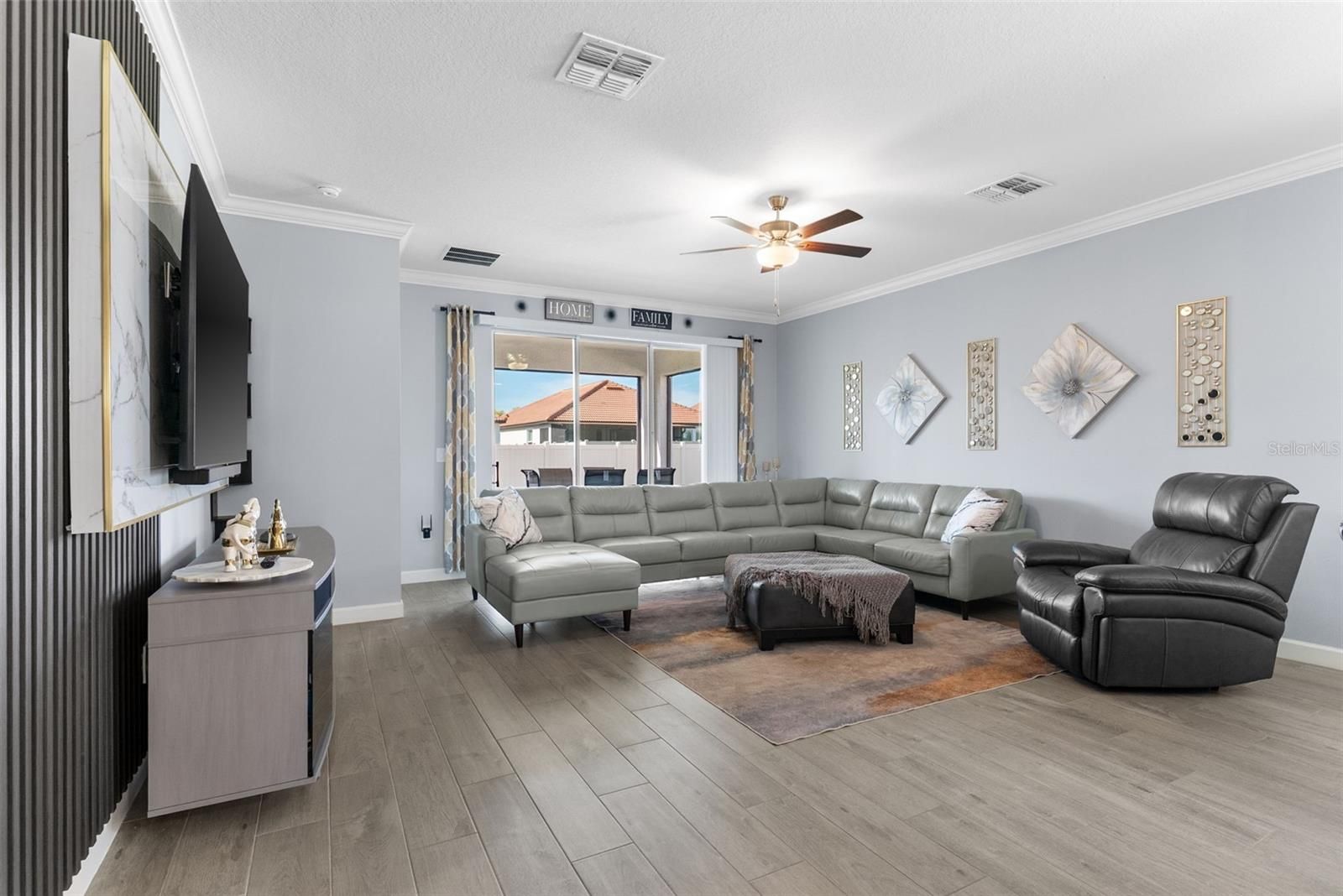 - Ceiling Fan(s), Crown Molding, Eat-in Kitchen, High Ceilings, Open Floorplan, Solid Surface Counters, Stone Counters, Walk-In Closet(s), Window Treatments