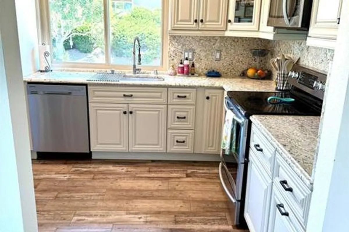 The Italian Villa at 17337 Plaza Maria has a one of a kind westward facing view of the Cuyamaca Mountains surrounding Lake Hodges that is reminiscent of a view in Tuscany. Vaulted ceilings and $65,000 in custom improvements include complete renovation of the kitchen & bathrooms, new double pane windows & zebra window coverings, new water pressure regulator valve, soft water system, new appliances, LVP flooring throughout & custom pebble rock entry and master bath floors, custom fixtures, ceiling fans & accents, new HVAC system, and more. Detailed list of renovation and improvement costs available on request. Oaks North is a wonderfully welcoming and well-managed 55+ community with HOAs that keep the clubhouse and the grounds in excellent condition. Clubhouse HOA annual fee of $500 includes unlimited use of pool, spa, sauna, tennis & pickleball courts, lawn bowling, ceramics studio, billiard & fitness rooms, and library. Monthly condo HOA fee of $530 includes internet, cable, water, sewage, trash, and immaculate maintenance of grounds. Walkable distance to Bernardo Winery , Manzanita Roastery/Coffee, Icarus Creative Arts, Talavera Art and Pottery, Rancho Bernardo Farmers Market, The Salon At The Vineyard hair salon, and more. Come, enjoy a glass of wine on the balcony and experience all the Italian Villa has to offer!