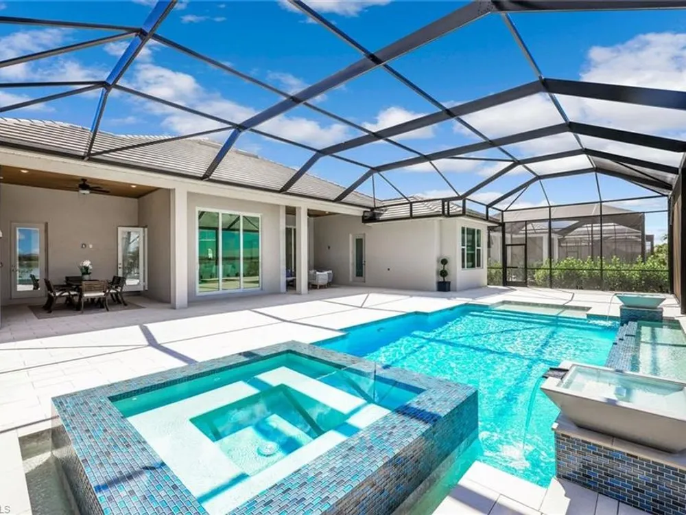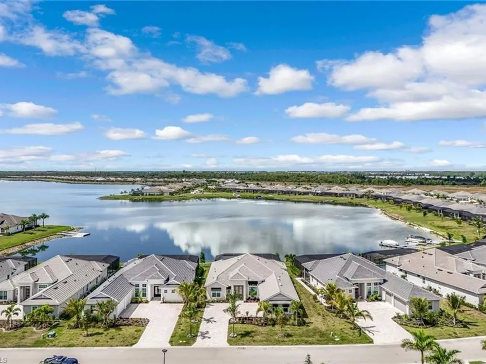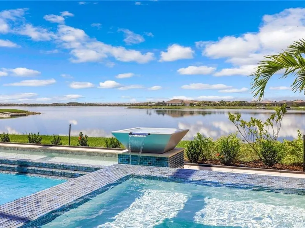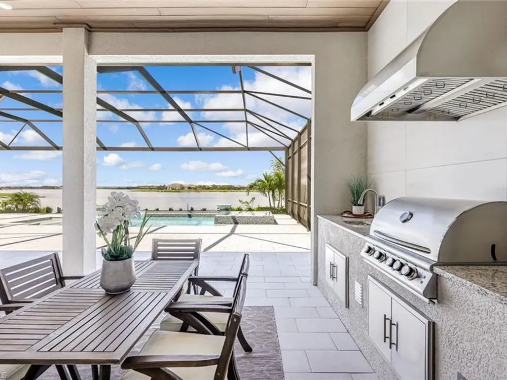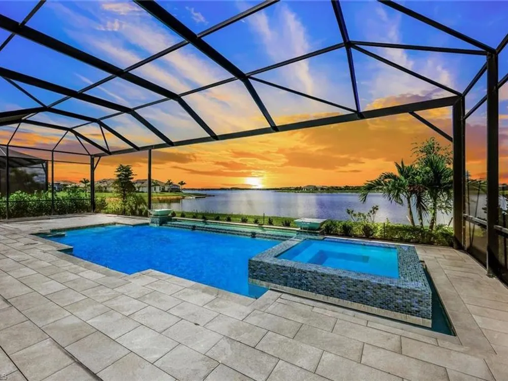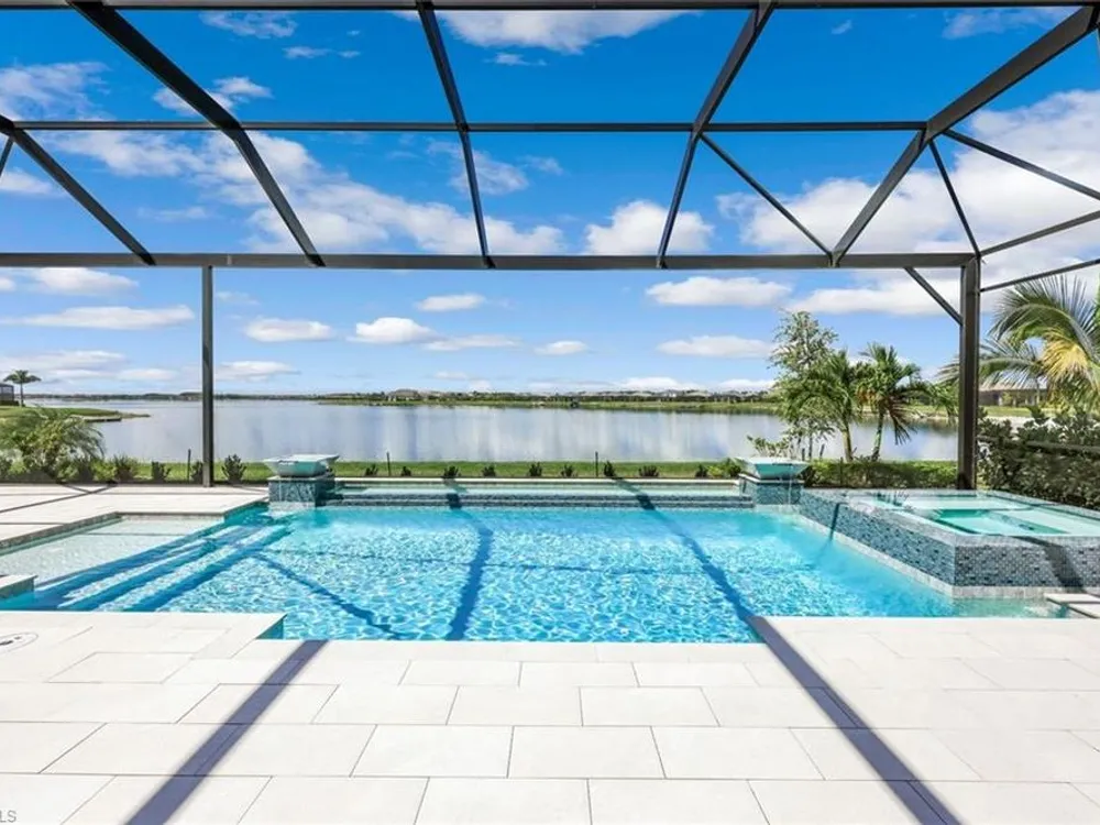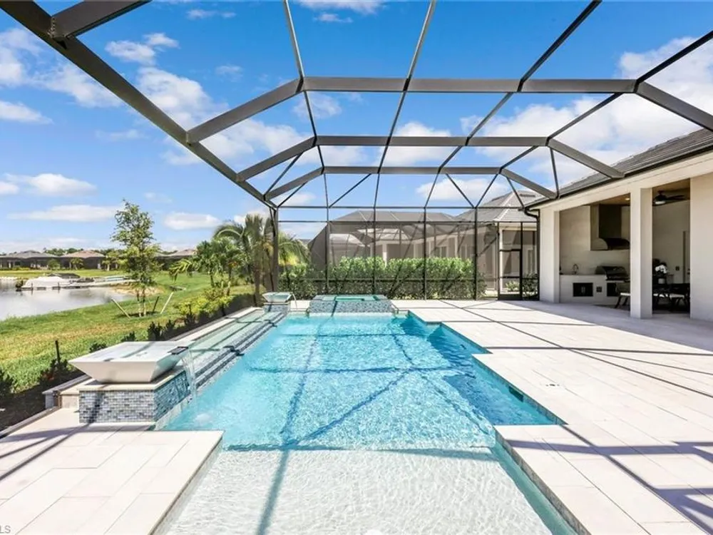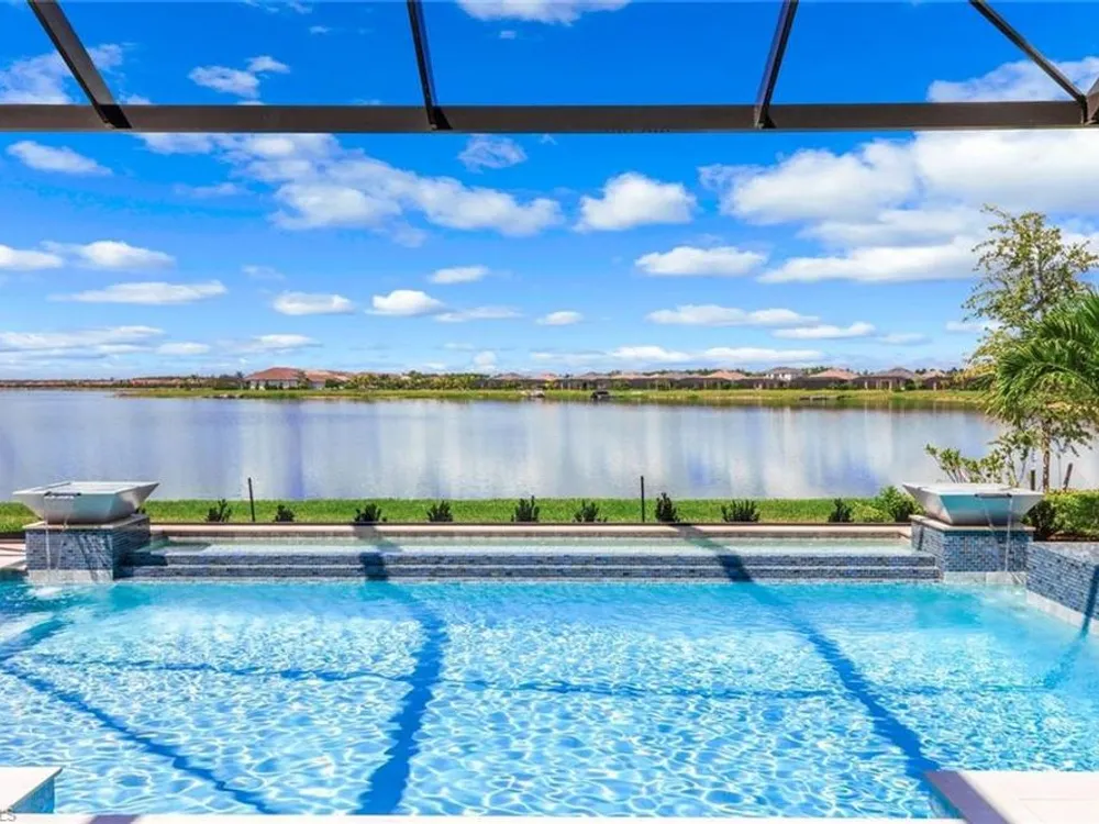Discover refined waterfront living in this New, Never-Lived-In, 3,178 sq. ft. 4-bedroom, 3.5-bath estate home, perfectly situated on the shimmering shores of WildBlue’s 450 - acre boatable lake - the largest in the community. This residence is the best-selling Baneberry floorplan, WCI’s largest single-story home built in WildBlue, offering the perfect balance of space, elegance, and function in one of Southwest Florida’s most coveted addresses. Set on a quiet, dead-end street within the community, the home enjoys a peaceful location with minimal through traffic, offering added privacy and safety. From the back, you’ll love the incredible lake view, the perfect backdrop for relaxing evenings or entertaining friends and family. No detail has been overlooked in the $250,000+ in upgrades showcased throughout. The home welcomes you with soaring 12-foot ceilings, impact windows and doors, and solid core interior doors that reflect both craftsmanship and quality. The spacious open layout is anchored by a custom built-in feature wall in the living room, enhancing both beauty and function. Step outside to your private oasis: an extended lanai with outdoor kitchen, saltwater pool with striking spillover bowls, and a beautifully upgraded landscape design complete with professional uplighting. Whether entertaining or simply relaxing lakeside, the outdoor living space is designed for year-round enjoyment. Additional highlights include: Natural gas cooking, Custom outdoor living area built-in, Impact windows and doors throughout, Quartz countertops and many other luxury finishes throughout. WildBlue offers world-class amenities, including resort-style pools, a private clubhouse, multiple dining options, fitness center, tennis, pickleball, and direct access to a boatable lake lifestyle - making every day feel like a vacation. This is more than a home; it’s a lifestyle. Schedule your private tour of 17338 Blue Sapphire Drive today and experience WildBlue lakefront luxury at its finest.