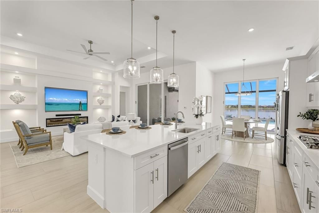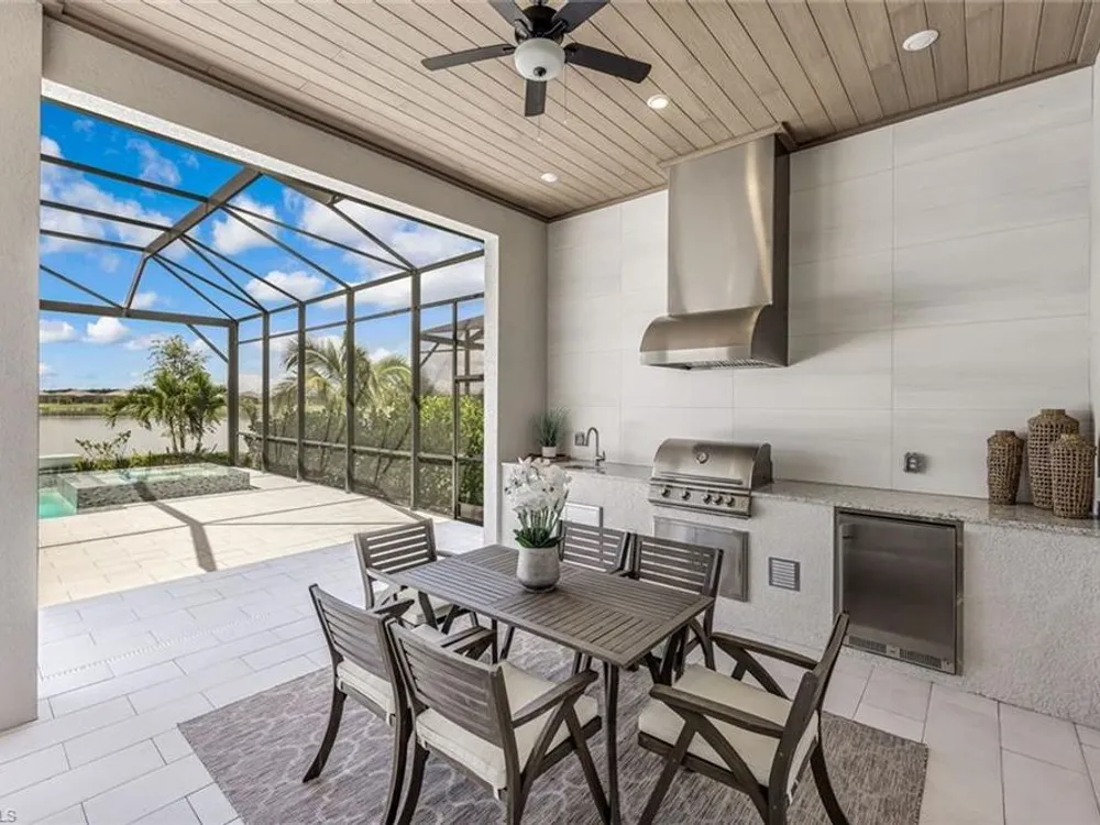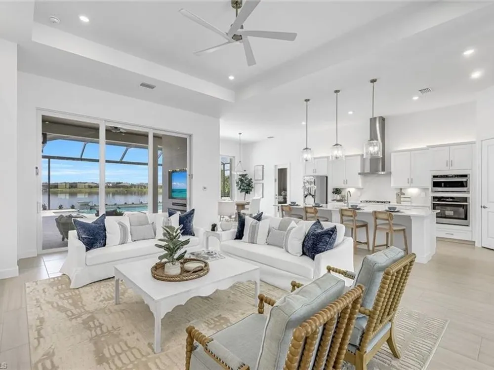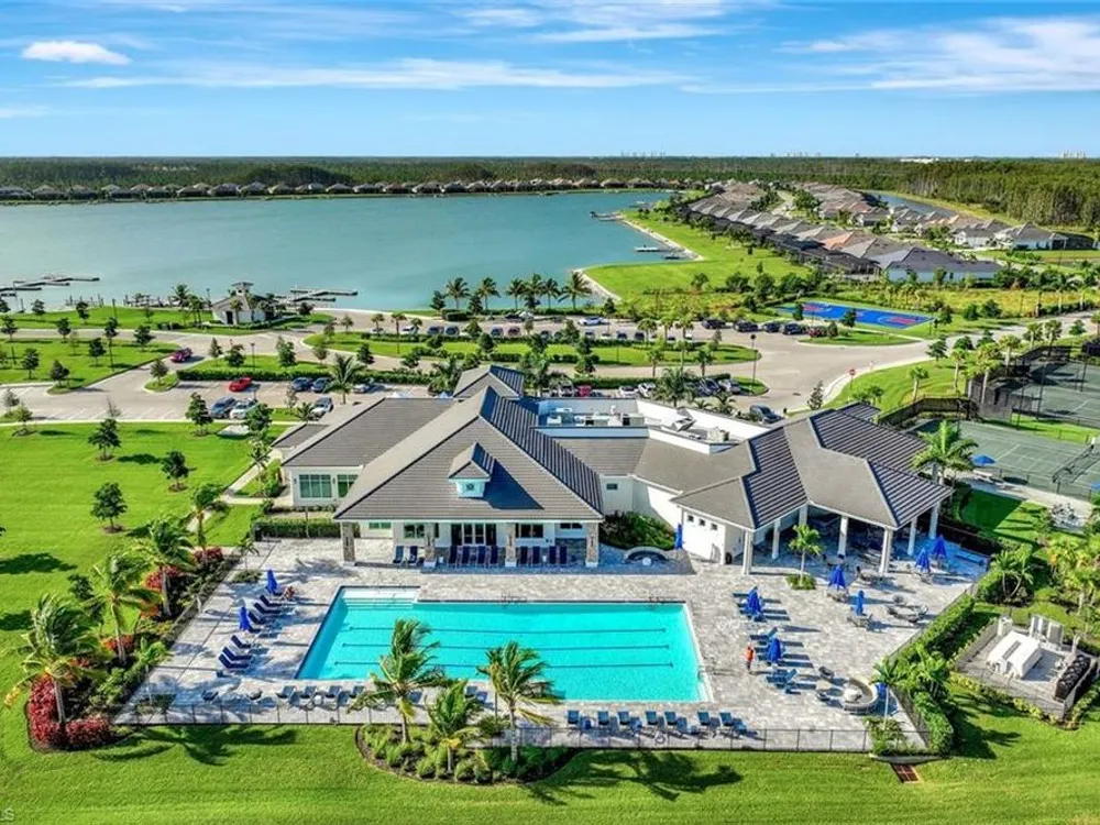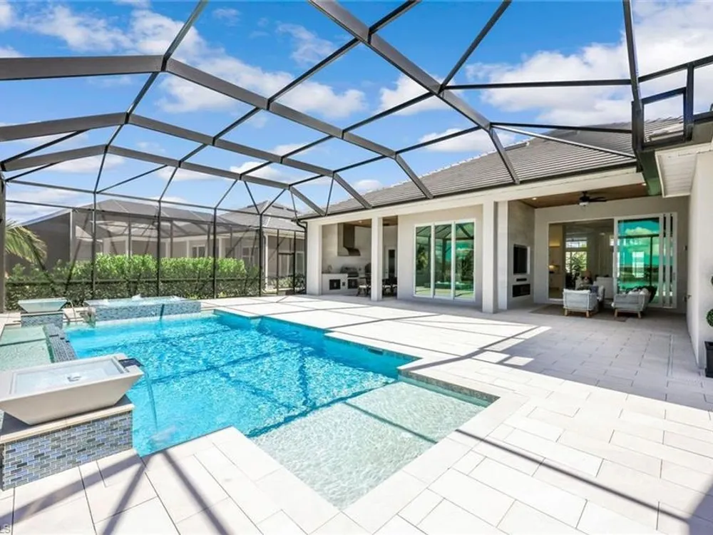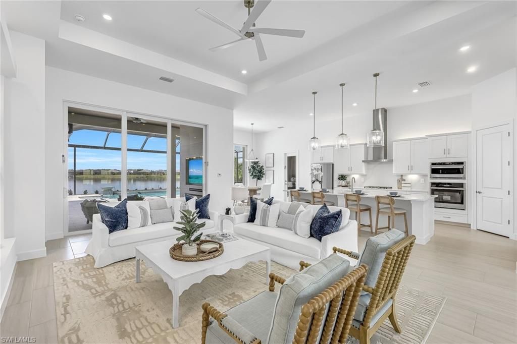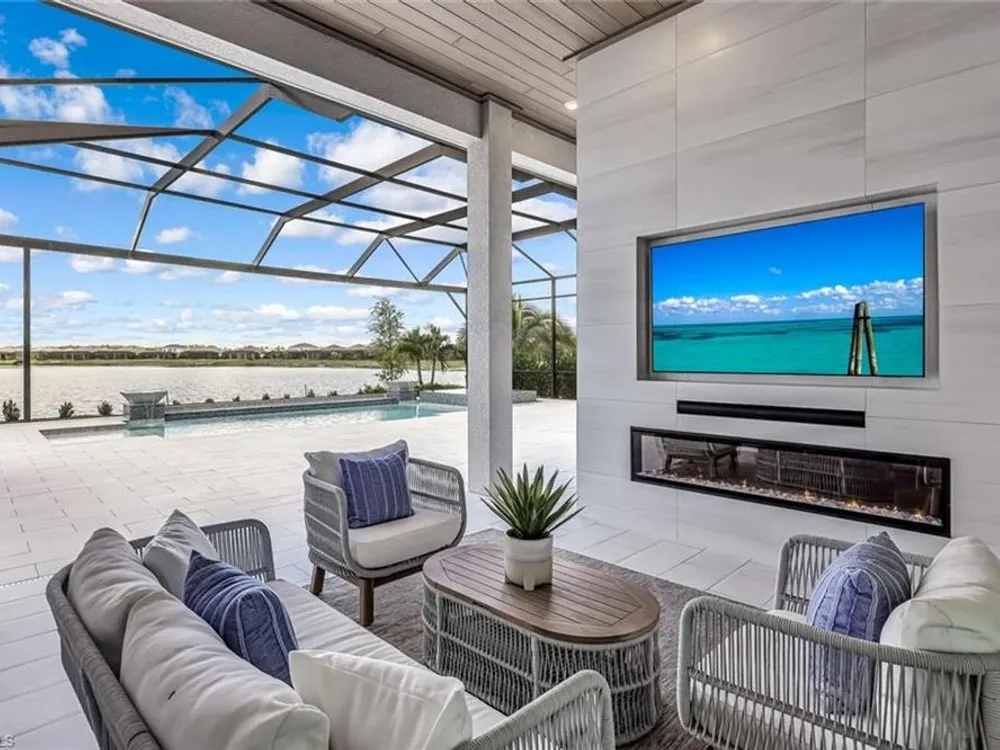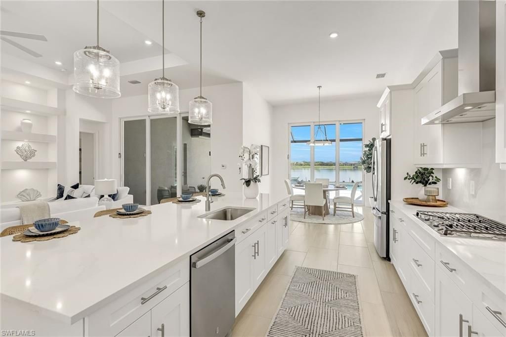 Discover refined waterfront living in this New, Never-Lived-In, 3,178 sq. ft. 4-bedroom, 3.5-bath estate home, perfectly situated on the shimmering shores of WildBlue’s 450 - acre boatable lake - the largest in the community. This residence is the best-selling Baneberry floorplan, WCI’s largest single-story home built in WildBlue, offering the perfect balance of space, elegance, and function in one of Southwest Florida’s most coveted addresses. Set on a quiet, dead-end street within the community, the home enjoys a peaceful location with minimal through traffic, offering added privacy and safety. From the back, you’ll love the incredible lake view, the perfect backdrop for relaxing evenings or entertaining friends and family. No detail has been overlooked in the $250,000+ in upgrades showcased throughout. The home welcomes you with soaring 12-foot ceilings, impact windows and doors, and solid core interior doors that reflect both craftsmanship and quality. The spacious open layout is anchored by a custom built-in feature wall in the living room, enhancing both beauty and function. Step outside to your private oasis: an extended lanai with outdoor kitchen, saltwater pool with striking spillover bowls, and a beautifully upgraded landscape design complete with professional uplighting. Whether entertaining or simply relaxing lakeside, the outdoor living space is designed for year-round enjoyment. Additional highlights include: Natural gas cooking, Custom outdoor living area built-in, Impact windows and doors throughout, Quartz countertops and many other luxury finishes throughout. WildBlue offers world-class amenities, including resort-style pools, a private clubhouse, multiple dining options, fitness center, tennis, pickleball, and direct access to a boatable lake lifestyle - making every day feel like a vacation. This is more than a home; it’s a lifestyle. Schedule your private tour of 17338 Blue Sapphire Drive today and experience WildBlue lakefront luxury at its finest.