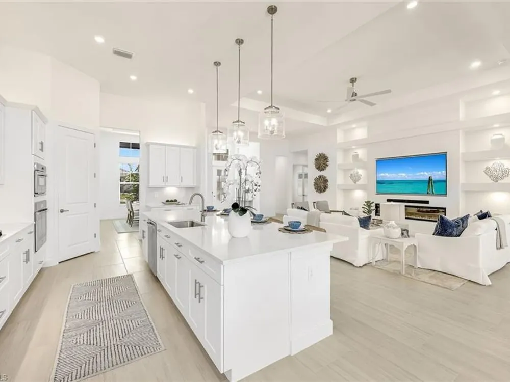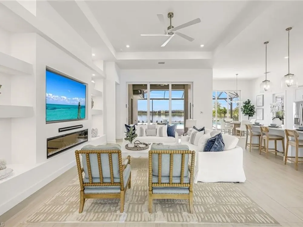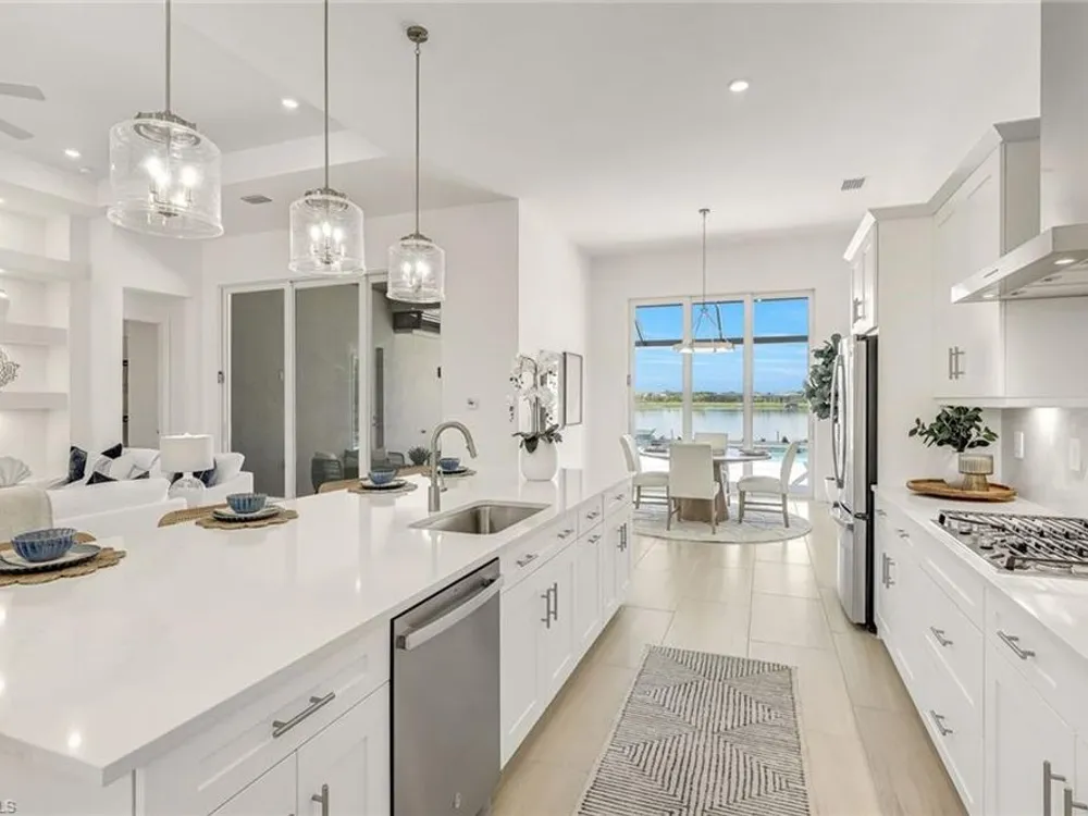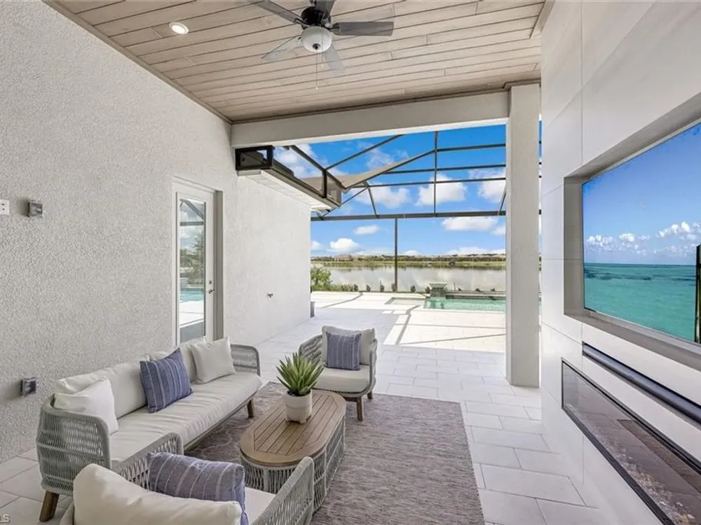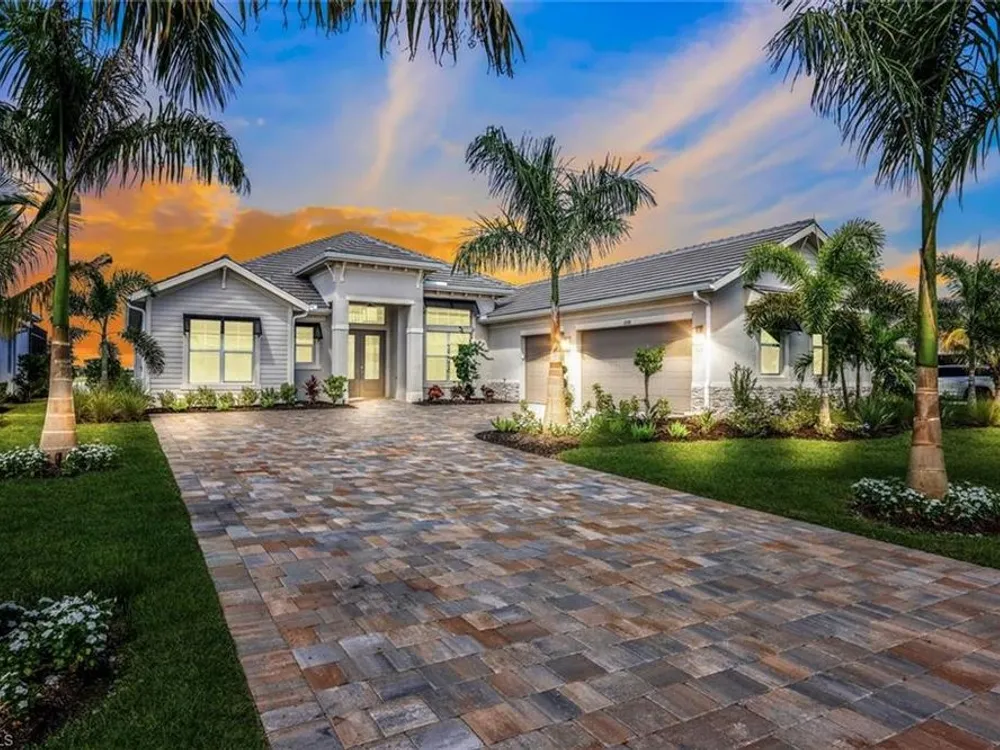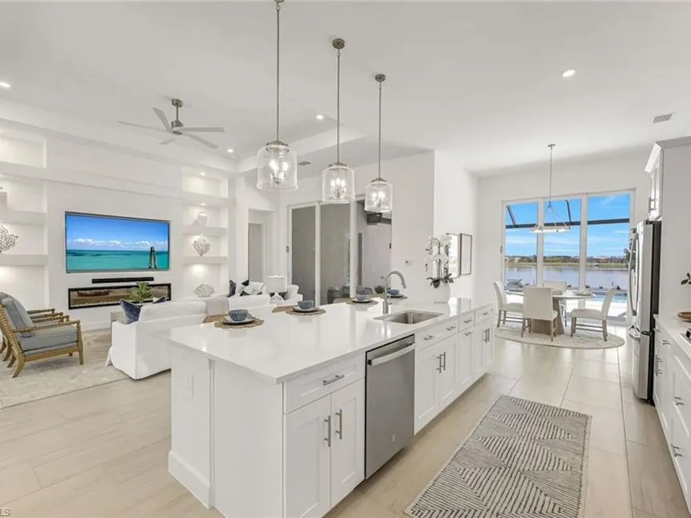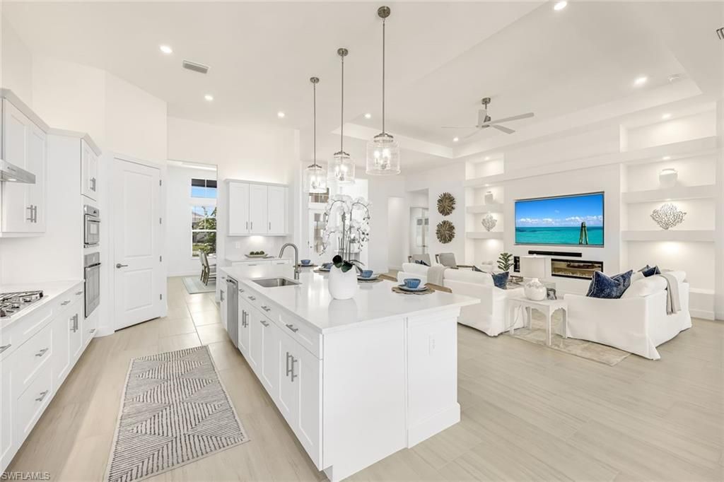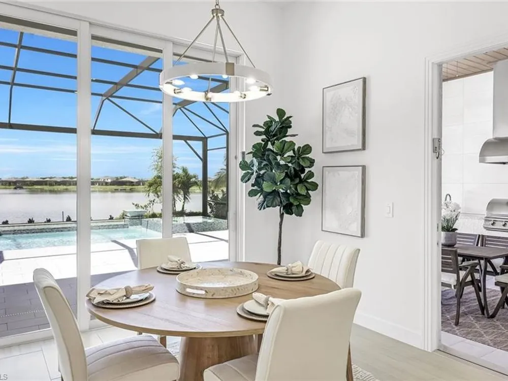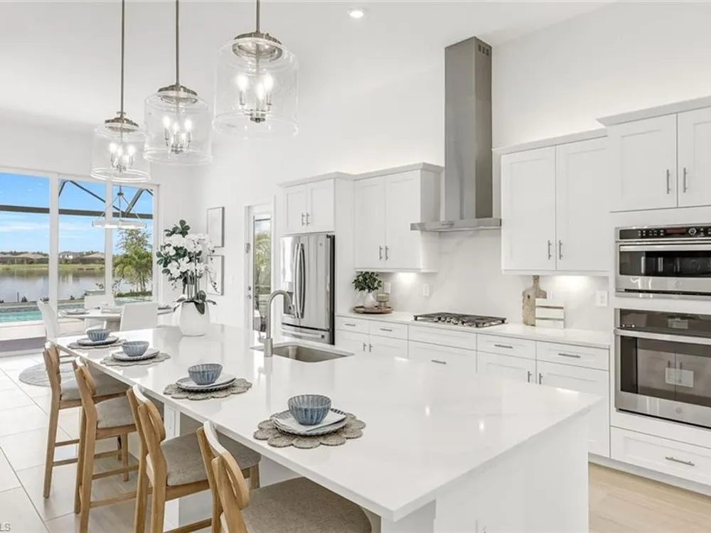 Discover refined waterfront living in this New, Never-Lived-In, 3,178 sq. ft. 4-bedroom, 3.5-bath estate home, perfectly situated on the shimmering shores of WildBlue’s 450 - acre boatable lake - the largest in the community. This residence is the best-selling Baneberry floorplan, WCI’s largest single-story home built in WildBlue, offering the perfect balance of space, elegance, and function in one of Southwest Florida’s most coveted addresses. Set on a quiet, dead-end street within the community, the home enjoys a peaceful location with minimal through traffic, offering added privacy and safety. From the back, you’ll love the incredible lake view, the perfect backdrop for relaxing evenings or entertaining friends and family. No detail has been overlooked in the $250,000+ in upgrades showcased throughout. The home welcomes you with soaring 12-foot ceilings, impact windows and doors, and solid core interior doors that reflect both craftsmanship and quality. The spacious open layout is anchored by a custom built-in feature wall in the living room, enhancing both beauty and function. Step outside to your private oasis: an extended lanai with outdoor kitchen, saltwater pool with striking spillover bowls, and a beautifully upgraded landscape design complete with professional uplighting. Whether entertaining or simply relaxing lakeside, the outdoor living space is designed for year-round enjoyment. Additional highlights include: Natural gas cooking, Custom outdoor living area built-in, Impact windows and doors throughout, Quartz countertops and many other luxury finishes throughout. WildBlue offers world-class amenities, including resort-style pools, a private clubhouse, multiple dining options, fitness center, tennis, pickleball, and direct access to a boatable lake lifestyle - making every day feel like a vacation. This is more than a home; it’s a lifestyle. Schedule your private tour of 17338 Blue Sapphire Drive today and experience WildBlue lakefront luxury at its finest.