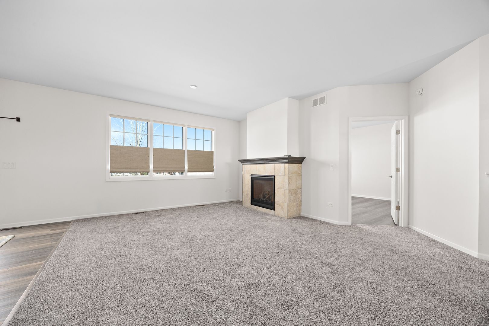 Never before on the market located in a quiet cul-de-sac with mature trees, and beautiful landscaping. Enjoy single-level living with an open layout, high ceilings, and abundant natural light throughout. The spacious kitchen features rich cabinetry, ample counter space, pantry storage, and a convenient breakfast bar overlooking the dining area with serene backyard views. The adjoining family room offers a cozy fireplace and large windows framing the picturesque outdoor setting. The primary suite is generously sized with a walk-in closet and private bath offering dual sinks, a soaking tub, and step-in shower. A second bedroom and full bathroom provide comfortable space for guests or a home office. A major bonus is the full deep-pour look out basement with rough-in for bathroom- offering endless storage or future finishing potential. Main-level laundry adds ease and convenience. Step outside to peaceful water views and open green space - the perfect spot for morning coffee or evening sunsets. The backyard feels private and natural, with no neighbors directly behind you. New Anderson sliding glass door installed in 2025. Lago Vista residents in this guard gate 55+ community enjoy resort-style living with clubhouse amenities including indoor & outdoor pools, fitness center, walking paths, social activities, and more - all close to shopping, dining, and transportation. Move-in ready, beautifully cared for, and perfectly located - welcome home!