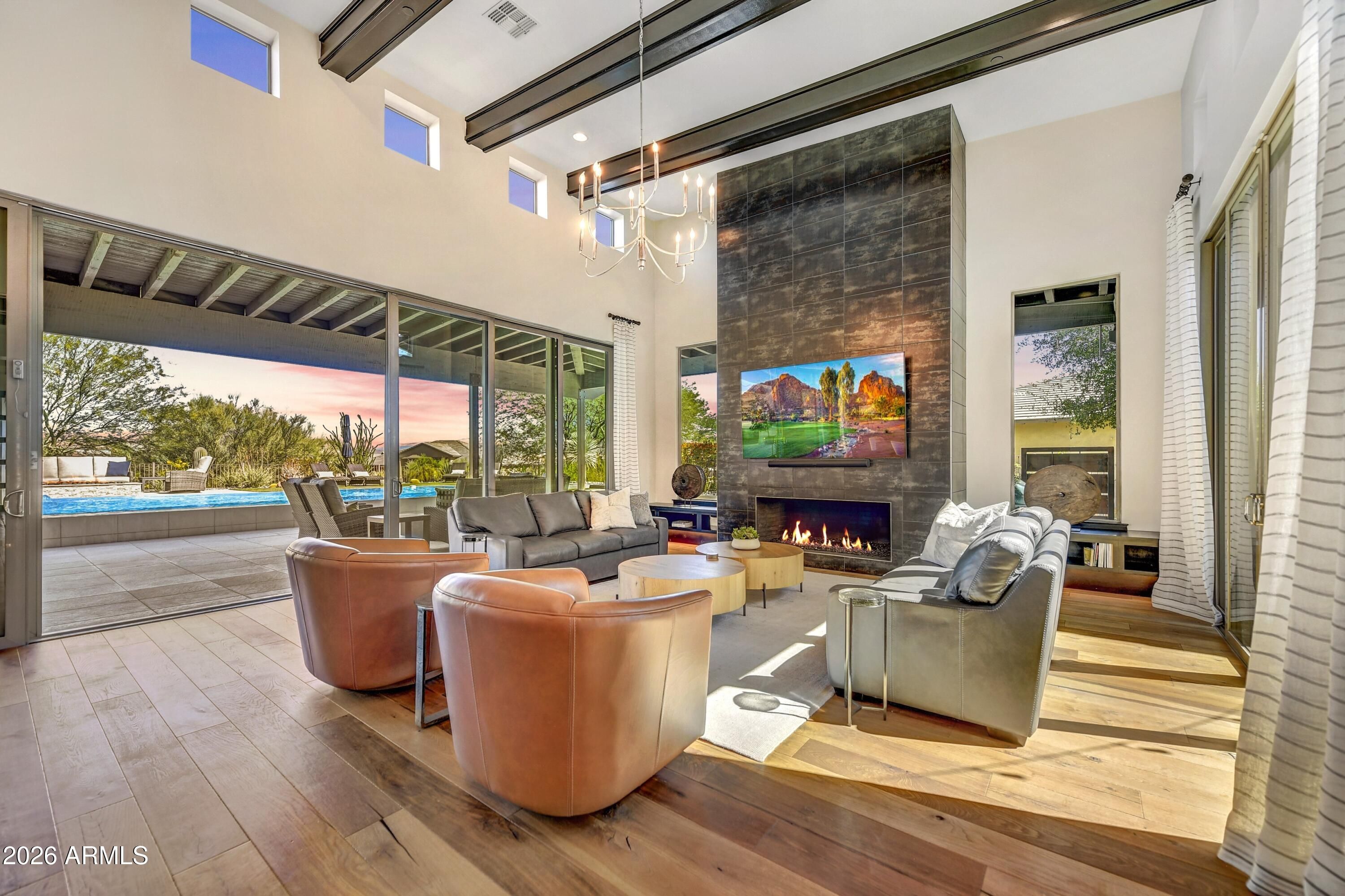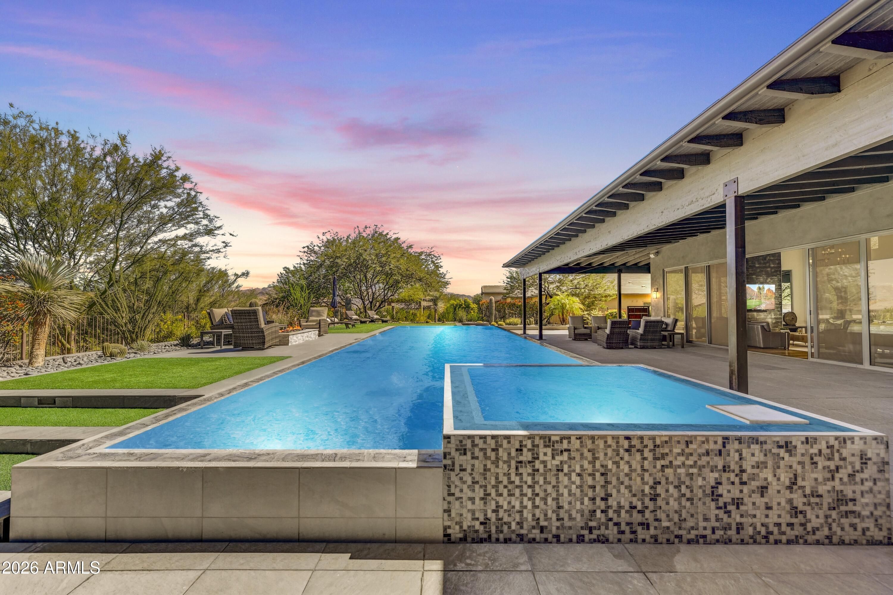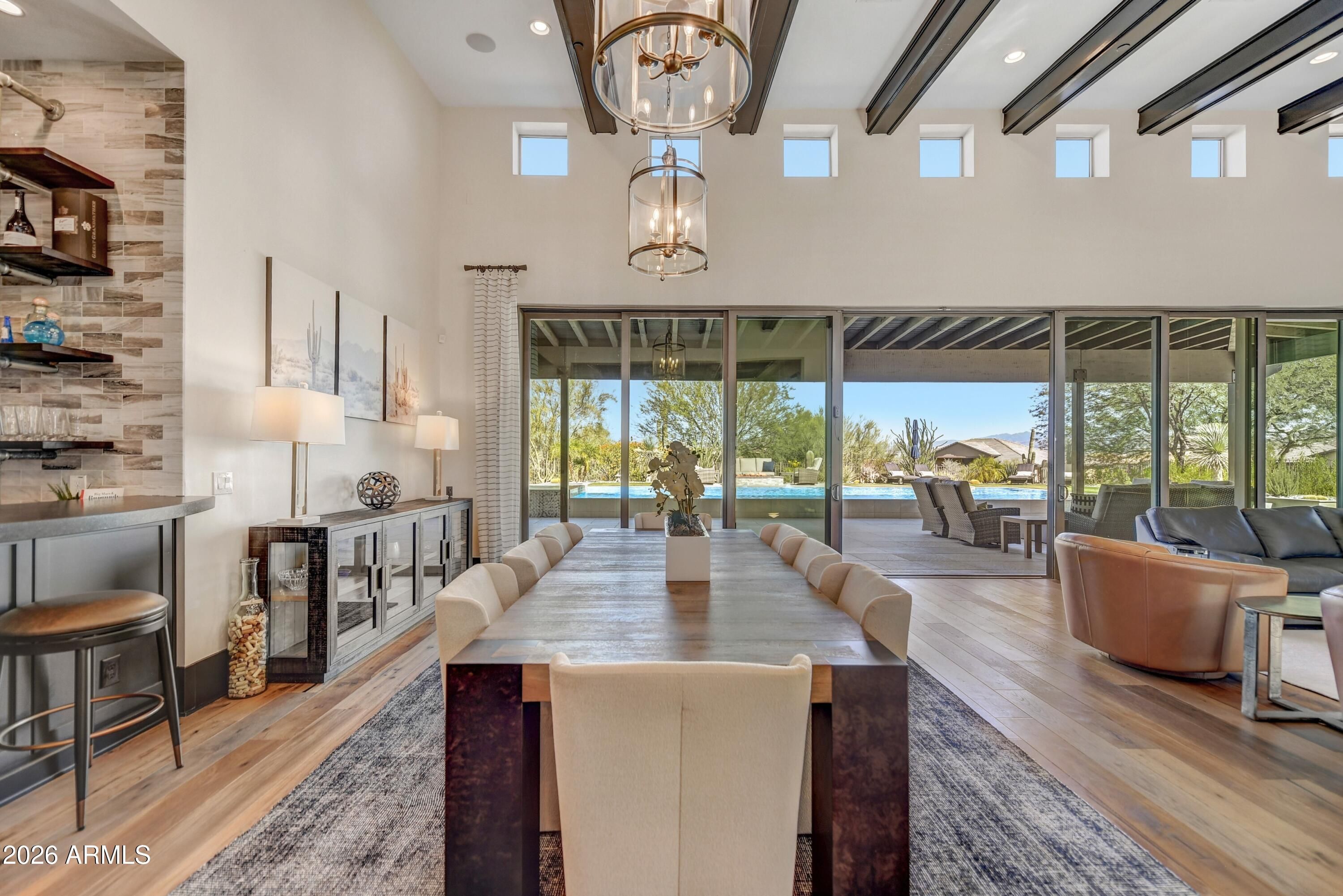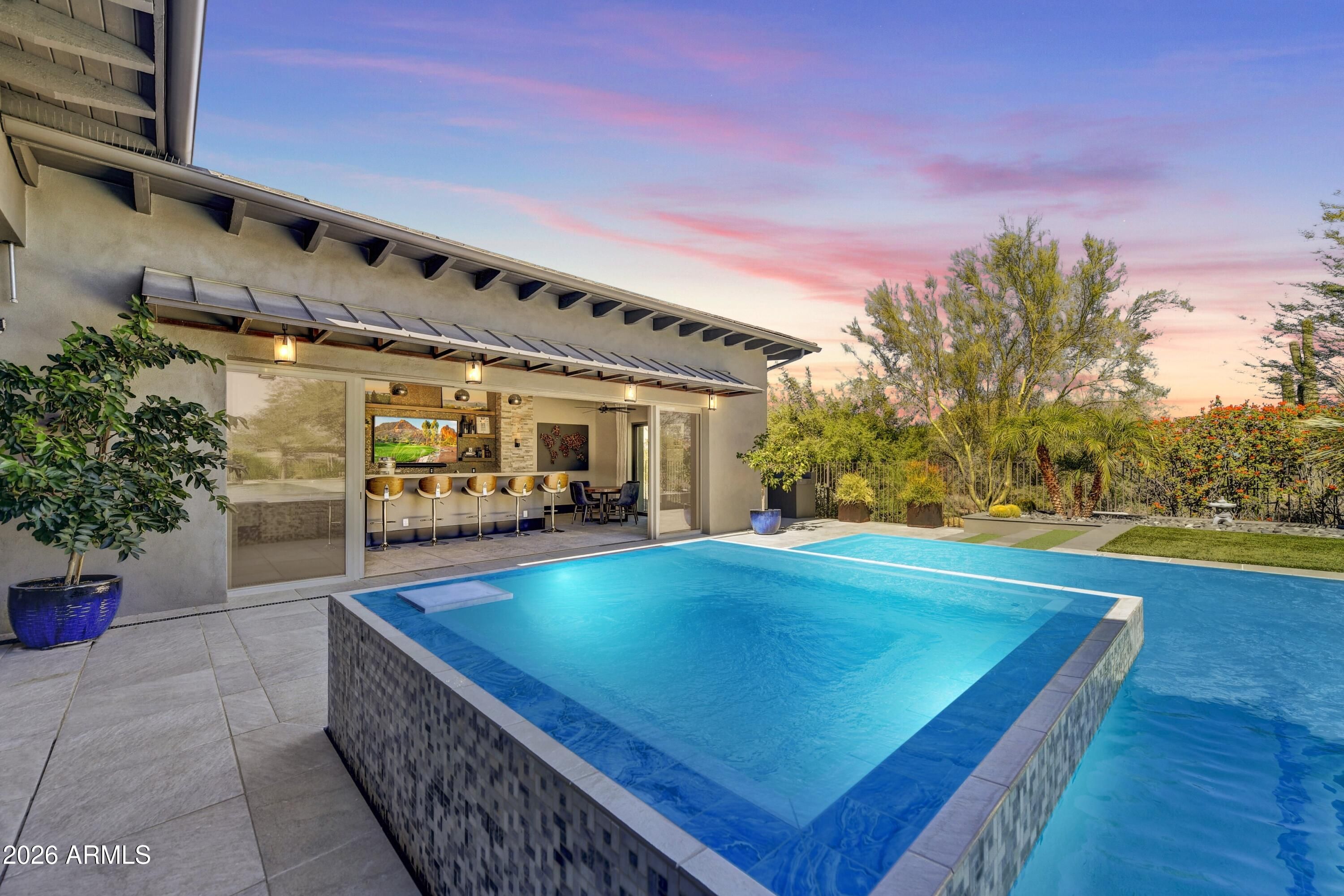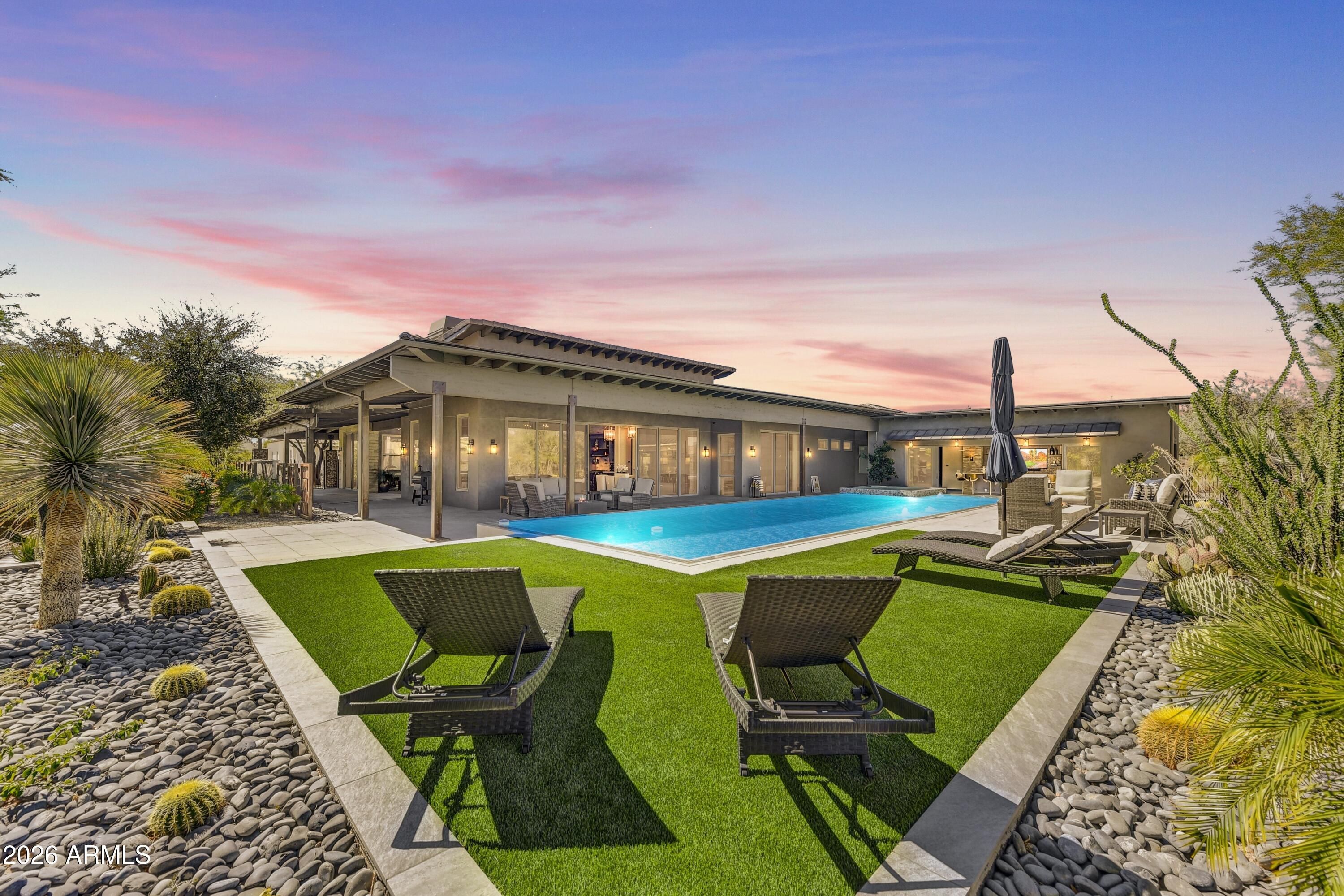 This iconic former Monterey Model Home sits majestically on an elevated homesite in the prestigious Trilogy at Verde River. Featured in a number of Architectural and Interior design publications, this Valencia Plus model is designed with timeless high-end finishes and a floor plan perfect for entertaining family and friends. The home offers 5216 sq ft of luxury living including 5 Bedrooms, 5.5 baths, den/office, Game Day Mancave with beverage center and kegerator, two bedroom attached Casita with separate entrance, and a spectacular party ready Pool Cabana. No detail, either in the floor plan, amenities or quality of finishes has been overlooked. The spacious home is thoughtfully laid out with a split floor plan featuring all ensuite Bedrooms and walk-in closets, a 30 foot Glass Wall that opens the great room to the stunning pool and view, as well as 10ft multi panel doors in the owner's suite, kitchen, office and living room that bring the outdoor areas inside to this spectacular home. The outdoor living space is magnificent with 2000+ sq ft of covered patio, zero edge spa and pool, complete with swim jets, and two separate outdoor kitchen/grilling areas which all provides the year-round outdoor living you're looking for in Arizona. Exquisite finish details include beautiful wood beams, wood floors, 17ft ceilings, 8 inch baseboards, and a satin and suede bi-level kitchen counter in a Chef's dream kitchen with upgraded appliances. The expansive primary suite features a cozy sitting area, a large ensuite master bath with wet room, custom closet with plenty of storage and calming views of the pool. Other noteworthy features of this extraordinary home include a large hobby/laundry room, wet bar adjacent to great room, large custom pantry, and outdoor dining nook and grill area with direct access to kitchen.