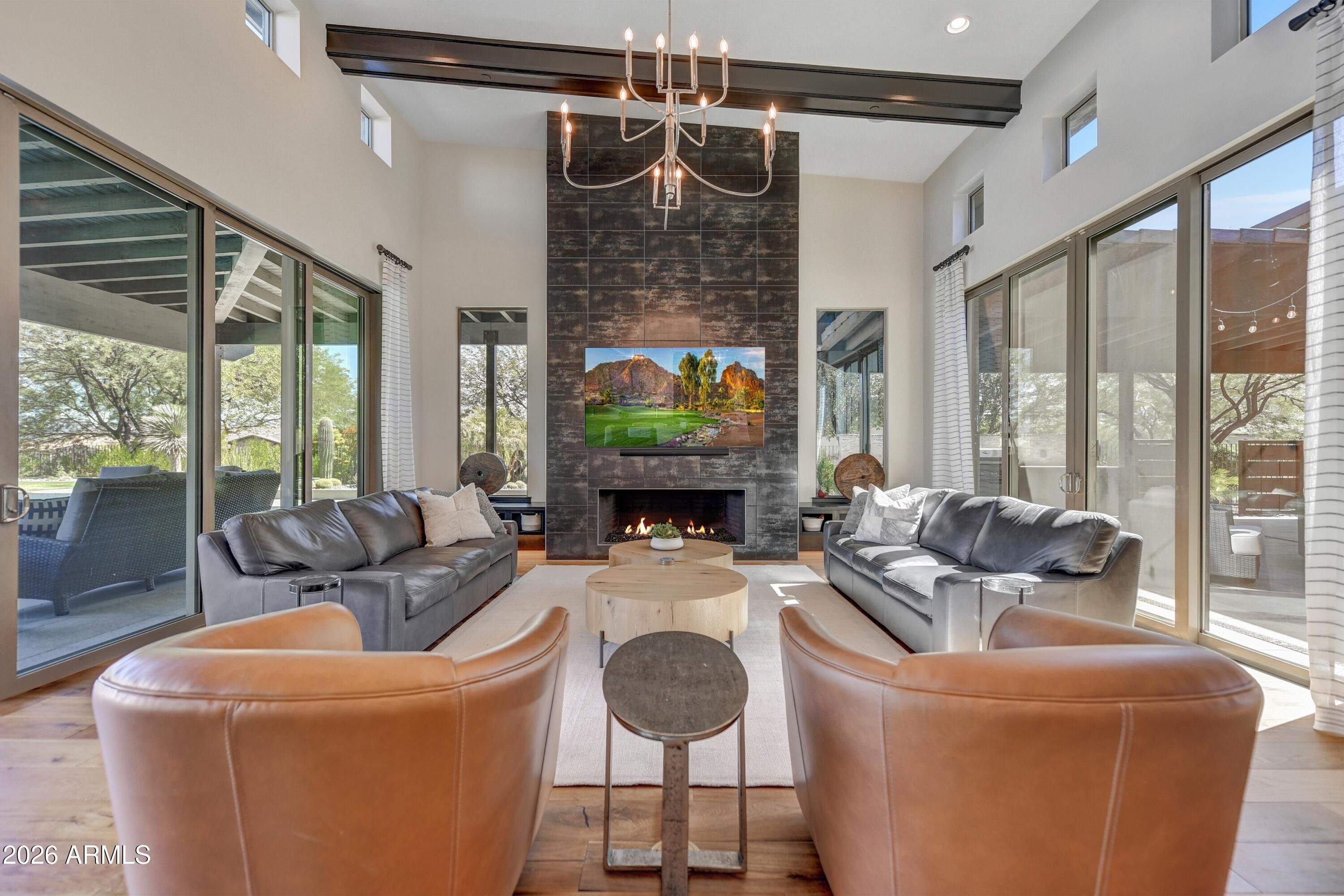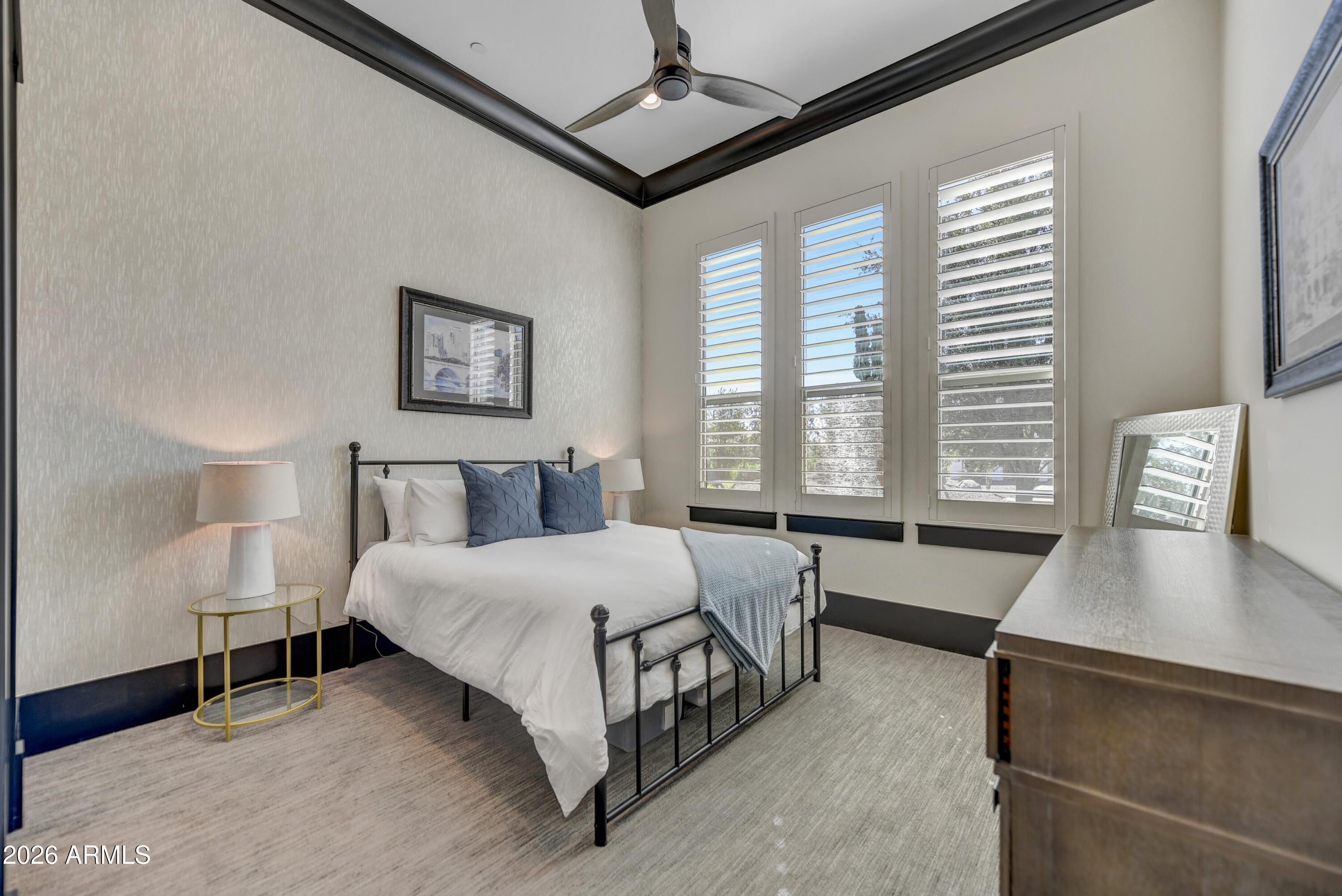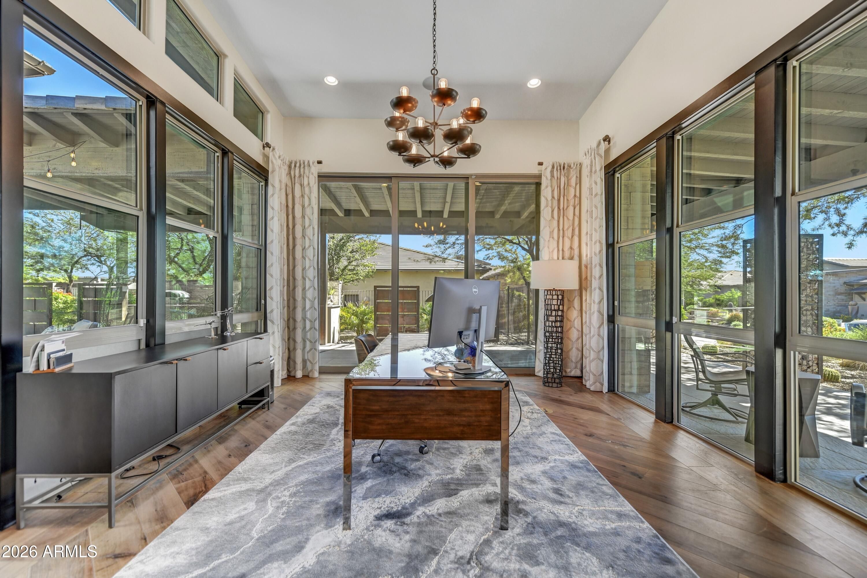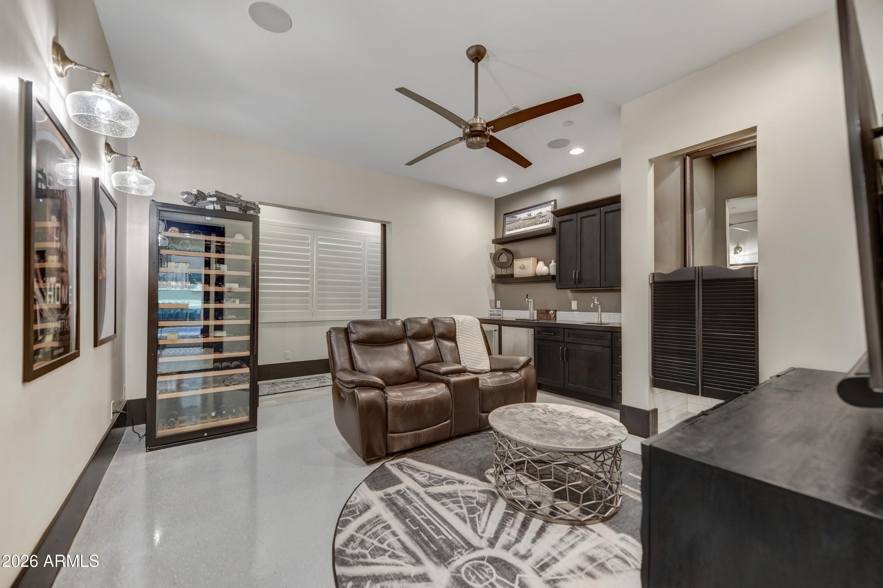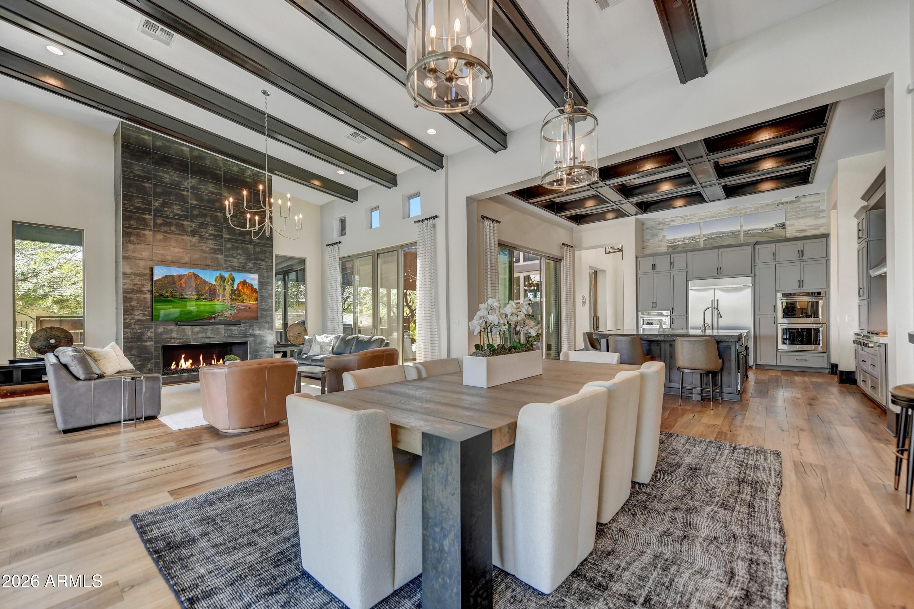 This iconic former Monterey Model Home sits majestically on an elevated homesite in the prestigious Trilogy at Verde River. Featured in a number of Architectural and Interior design publications, this Valencia Plus model is designed with timeless high-end finishes and a floor plan perfect for entertaining family and friends. The home offers 5216 sq ft of luxury living including 5 Bedrooms, 5.5 baths, den/office, Game Day Mancave with beverage center and kegerator, two bedroom attached Casita with separate entrance, and a spectacular party ready Pool Cabana. No detail, either in the floor plan, amenities or quality of finishes has been overlooked. The spacious home is thoughtfully laid out with a split floor plan featuring all ensuite Bedrooms and walk-in closets, a 30 foot Glass Wall that opens the great room to the stunning pool and view, as well as 10ft multi panel doors in the owner's suite, kitchen, office and living room that bring the outdoor areas inside to this spectacular home. The outdoor living space is magnificent with 2000+ sq ft of covered patio, zero edge spa and pool, complete with swim jets, and two separate outdoor kitchen/grilling areas which all provides the year-round outdoor living you're looking for in Arizona. Exquisite finish details include beautiful wood beams, wood floors, 17ft ceilings, 8 inch baseboards, and a satin and suede bi-level kitchen counter in a Chef's dream kitchen with upgraded appliances. The expansive primary suite features a cozy sitting area, a large ensuite master bath with wet room, custom closet with plenty of storage and calming views of the pool. Other noteworthy features of this extraordinary home include a large hobby/laundry room, wet bar adjacent to great room, large custom pantry, and outdoor dining nook and grill area with direct access to kitchen.
