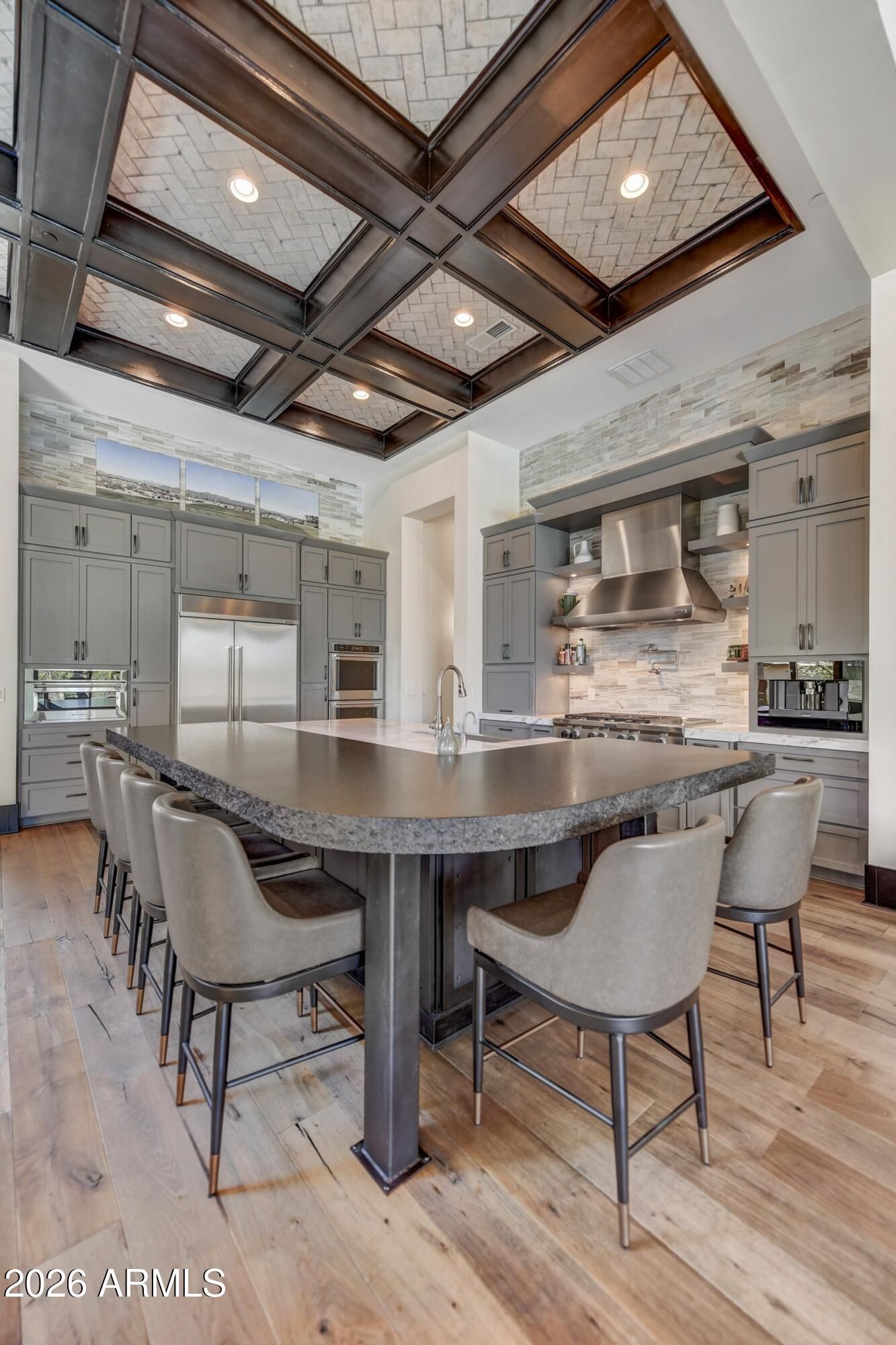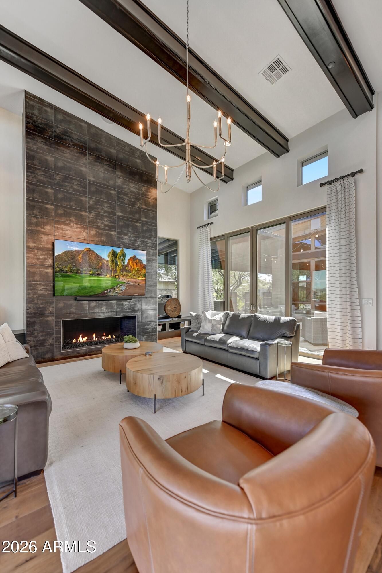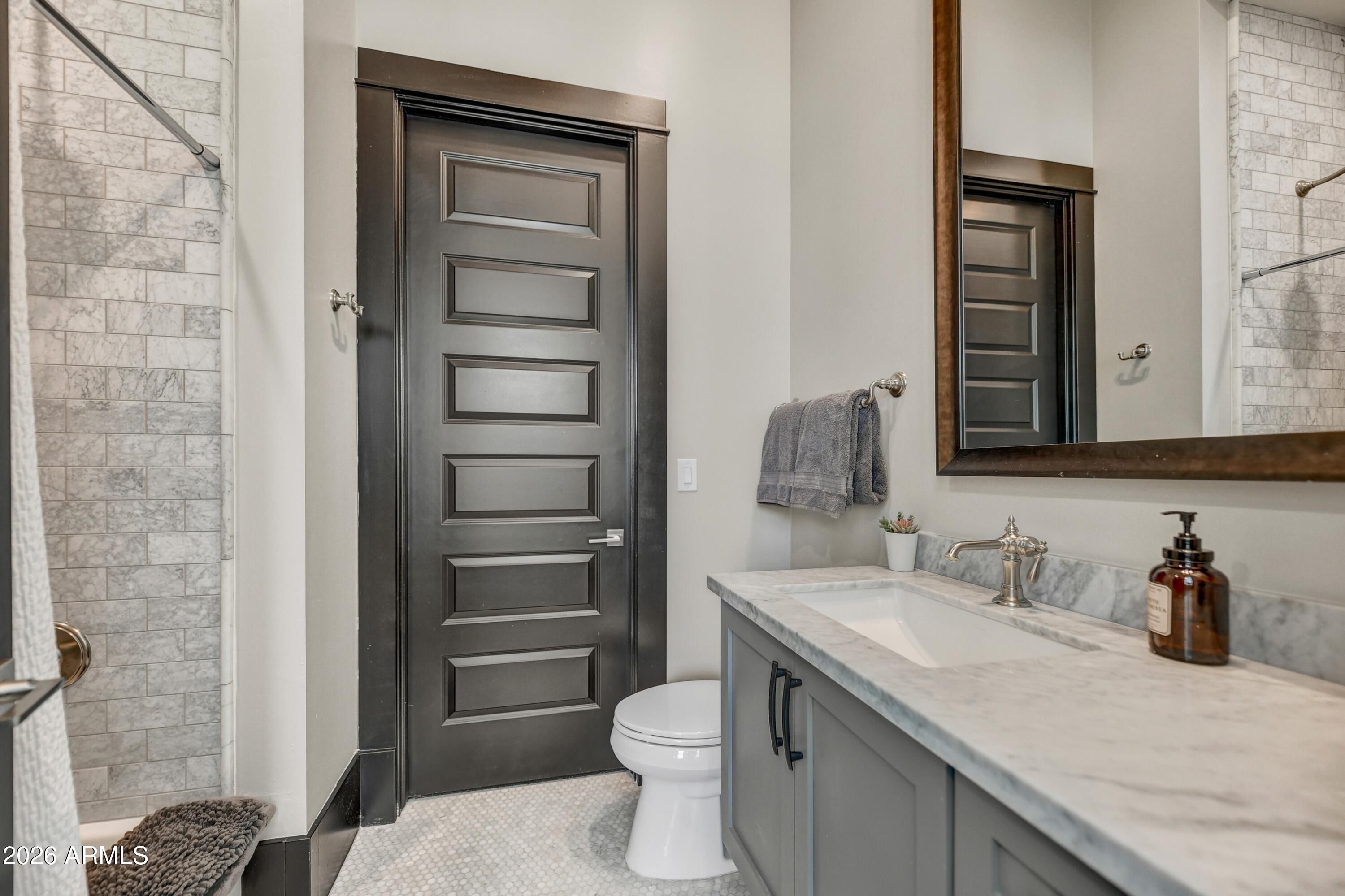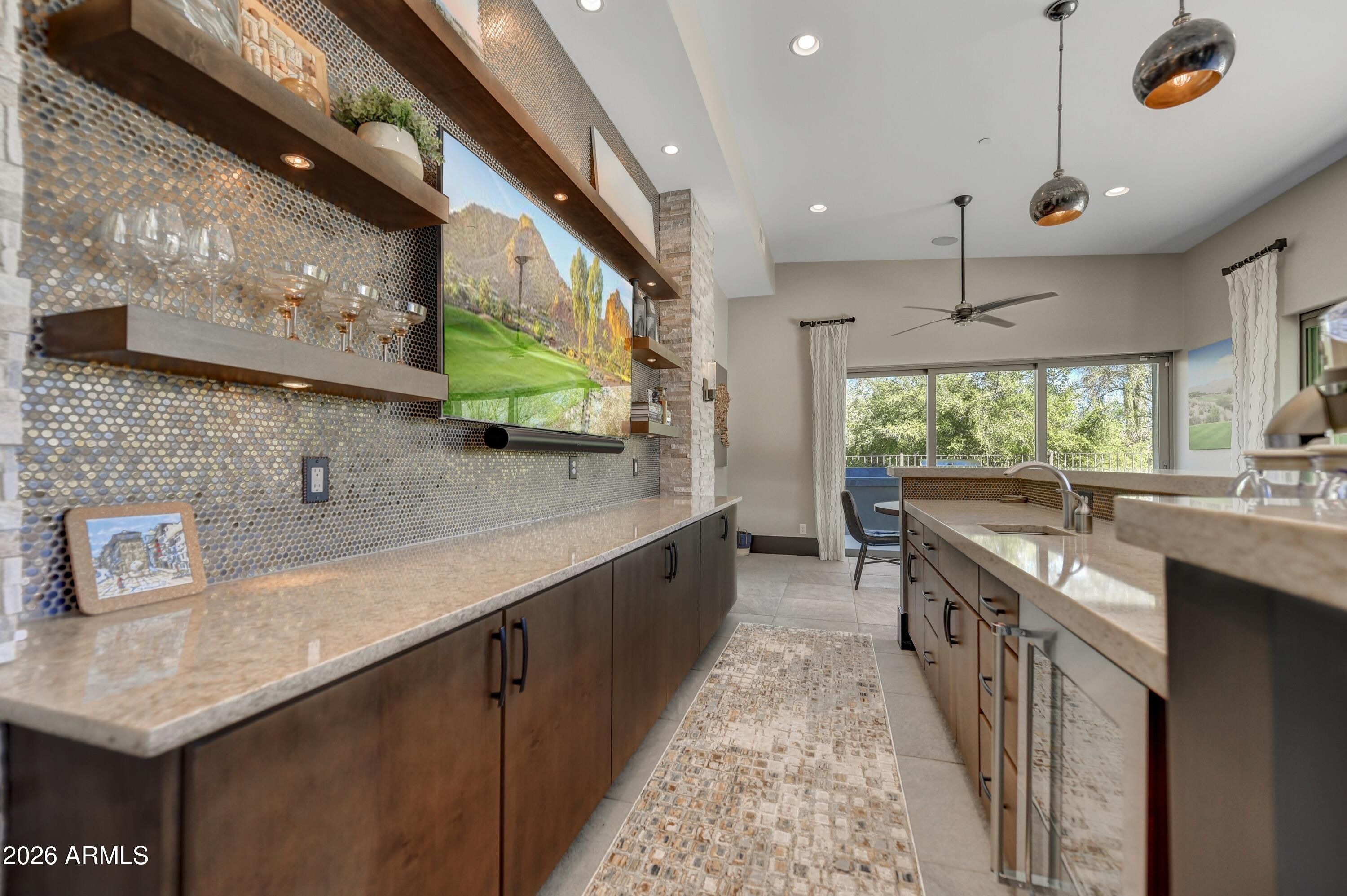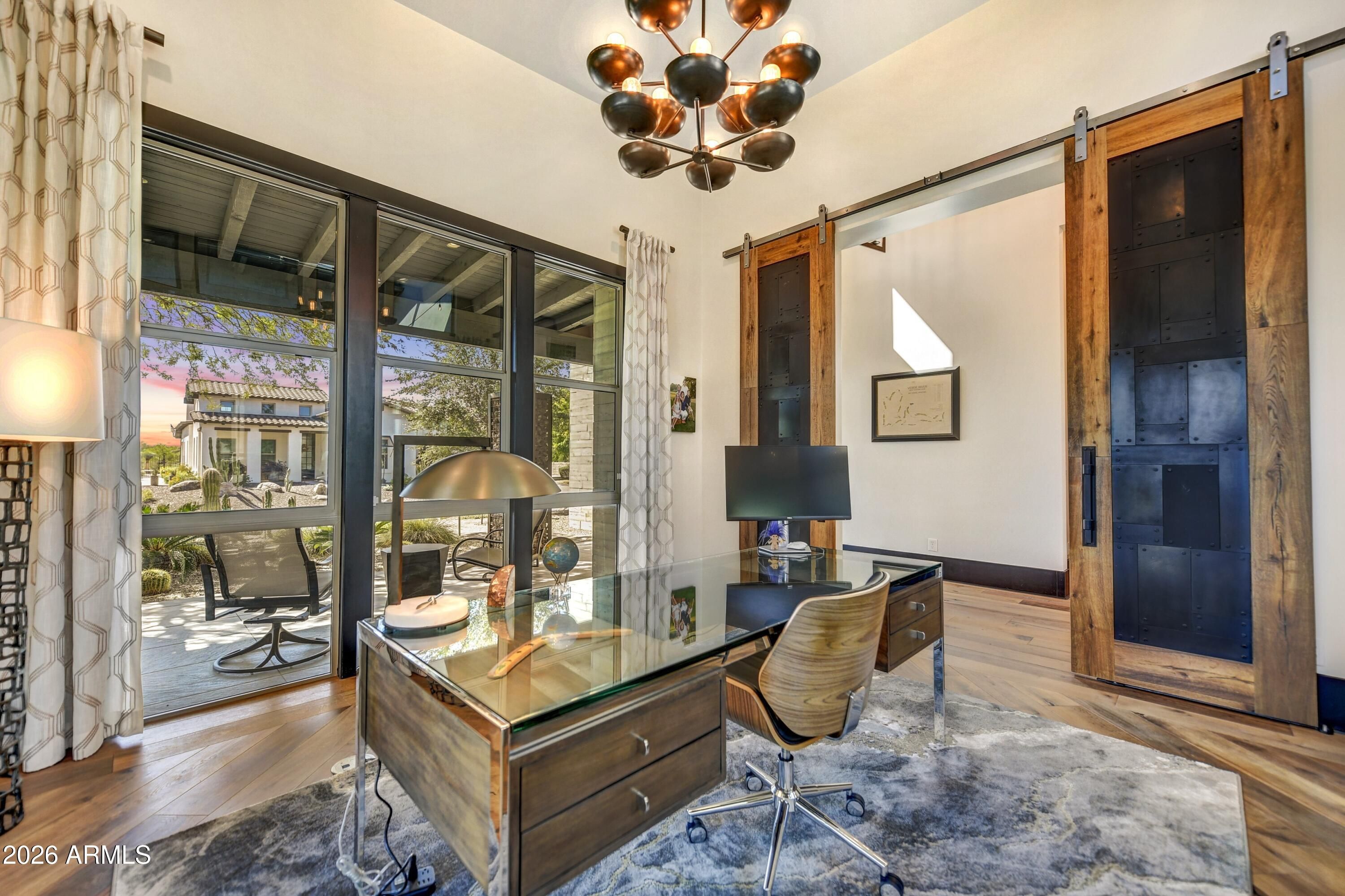 This iconic former Monterey Model Home sits majestically on an elevated homesite in the prestigious Trilogy at Verde River. Featured in a number of Architectural and Interior design publications, this Valencia Plus model is designed with timeless high-end finishes and a floor plan perfect for entertaining family and friends. The home offers 5216 sq ft of luxury living including 5 Bedrooms, 5.5 baths, den/office, Game Day Mancave with beverage center and kegerator, two bedroom attached Casita with separate entrance, and a spectacular party ready Pool Cabana. No detail, either in the floor plan, amenities or quality of finishes has been overlooked. The spacious home is thoughtfully laid out with a split floor plan featuring all ensuite Bedrooms and walk-in closets, a 30 foot Glass Wall that opens the great room to the stunning pool and view, as well as 10ft multi panel doors in the owner's suite, kitchen, office and living room that bring the outdoor areas inside to this spectacular home. The outdoor living space is magnificent with 2000+ sq ft of covered patio, zero edge spa and pool, complete with swim jets, and two separate outdoor kitchen/grilling areas which all provides the year-round outdoor living you're looking for in Arizona. Exquisite finish details include beautiful wood beams, wood floors, 17ft ceilings, 8 inch baseboards, and a satin and suede bi-level kitchen counter in a Chef's dream kitchen with upgraded appliances. The expansive primary suite features a cozy sitting area, a large ensuite master bath with wet room, custom closet with plenty of storage and calming views of the pool. Other noteworthy features of this extraordinary home include a large hobby/laundry room, wet bar adjacent to great room, large custom pantry, and outdoor dining nook and grill area with direct access to kitchen.