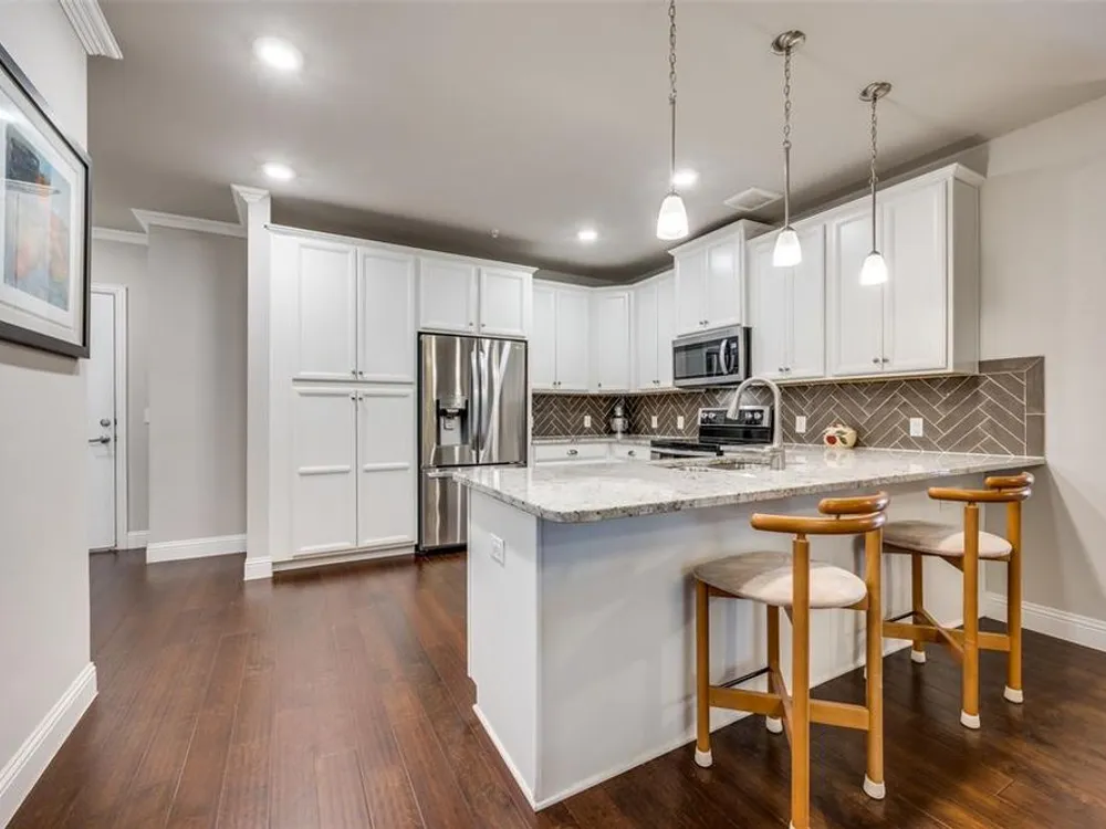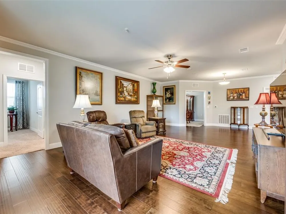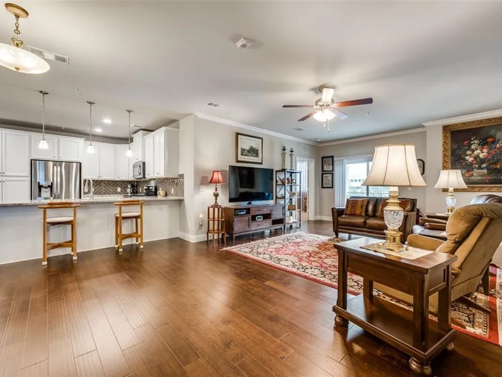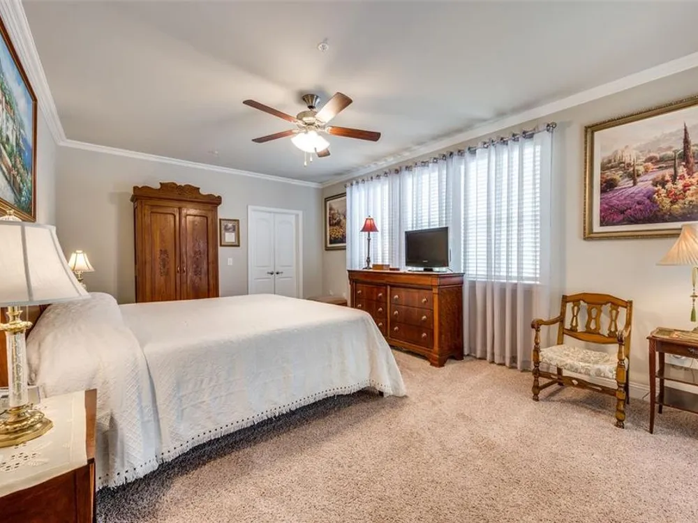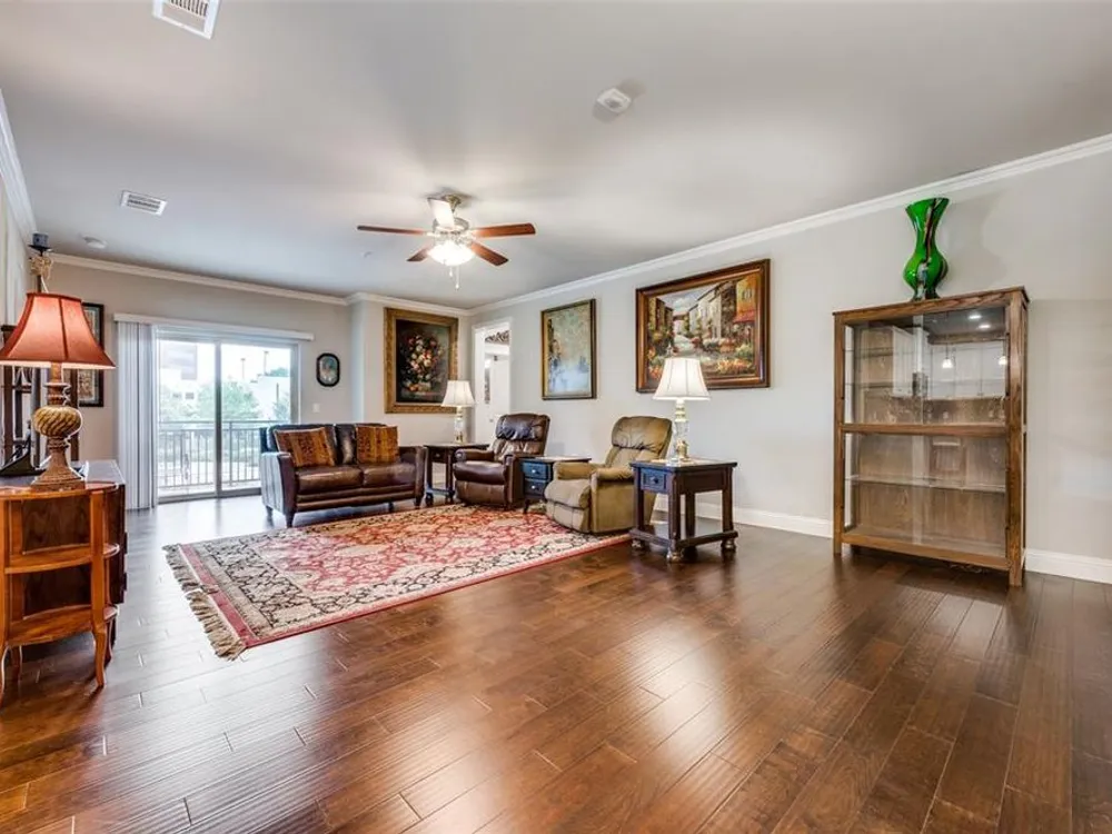 Experience effortless living in this stunning second-floor condo at The Gatherings at Mercer Crossing—a premier 55+ community just minutes from Las Colinas. With only three buildings and about 80 residences, this intimate neighborhood offers a warm, connected feel along with top-notch amenities including multiple fitness centers, a sparkling pool, clubhouse, and social activities. Inside, you'll love the open-concept design filled with natural light and elevated by luxury finishes—quartz countertops, rich hardwood flooring, and designer lighting throughout. The spacious layout includes a dedicated laundry room with room for full sized washer and dryer, abundant storage, and a private balcony complete with storage closet and water heater enclosure. The serene primary suite boasts a custom walk-in closet and a beautifully designed, wheelchair-accessible bath with a large shower and built-in vanity. Enjoy the convenience of garage parking with space for shelving and additional storage. Take in the community’s peaceful ambiance with lakeside walking trails, pocket parks, outdoor grilling areas, and even a greenhouse. This is low-maintenance luxury living at its finest. The garage is on the west side of the building.