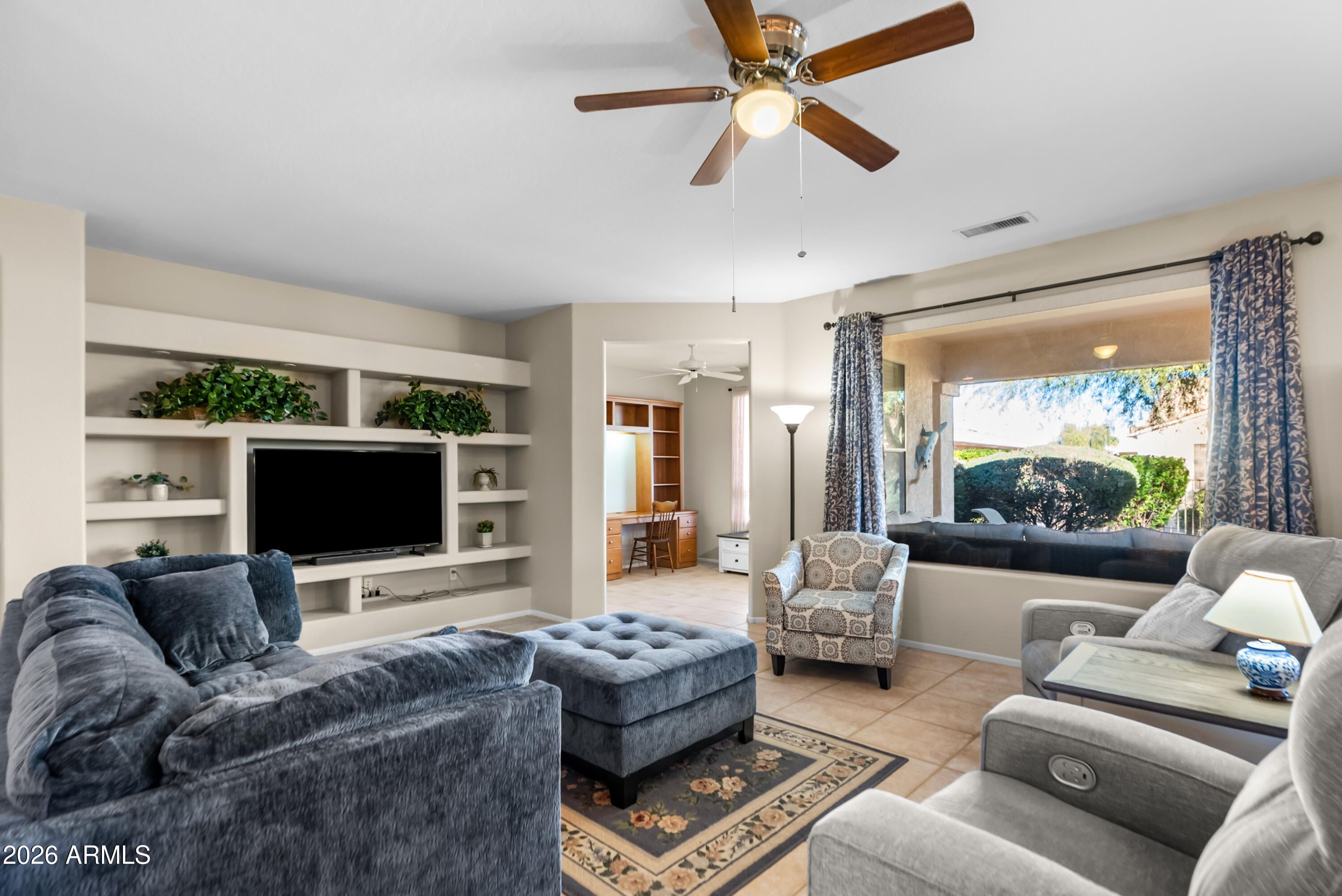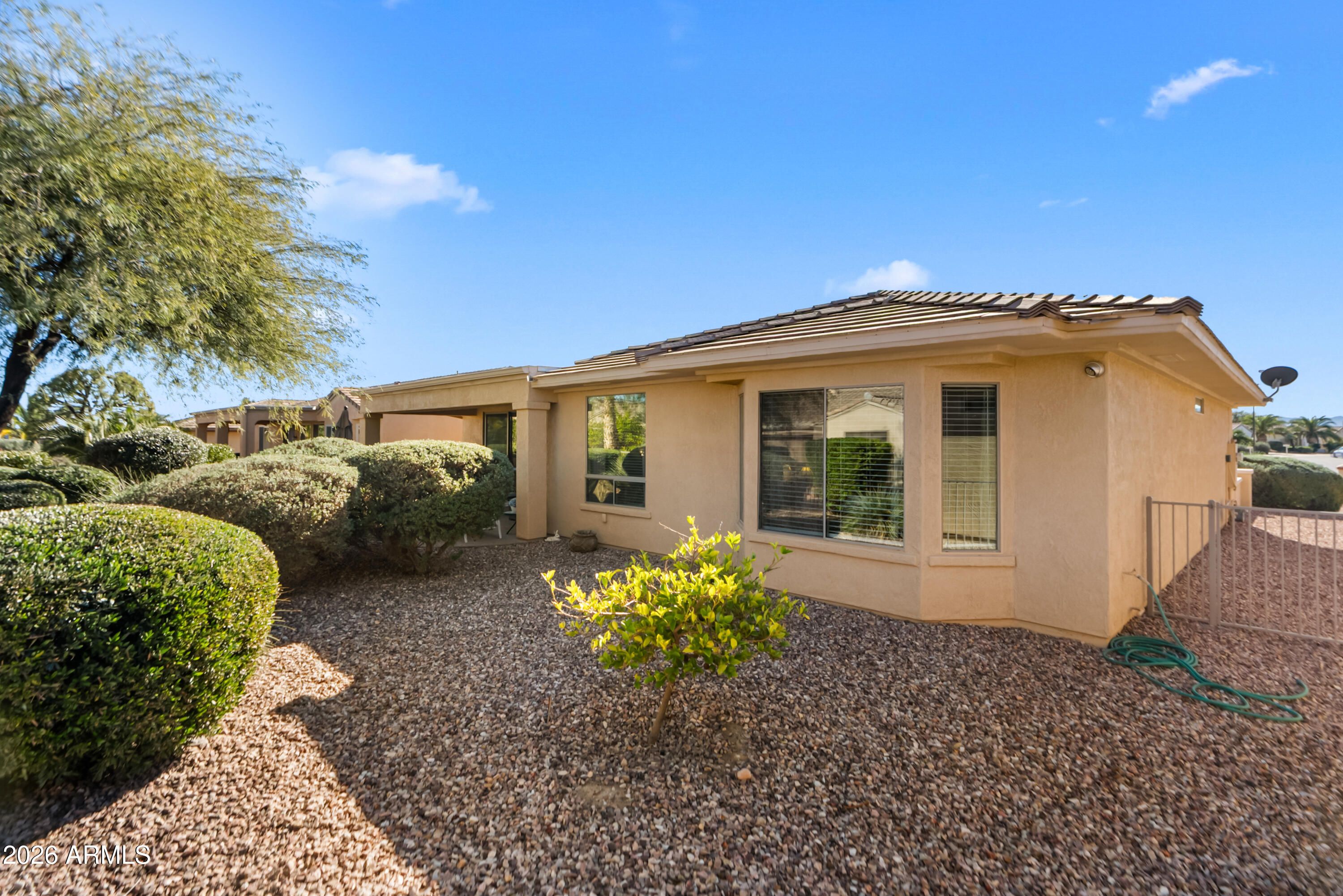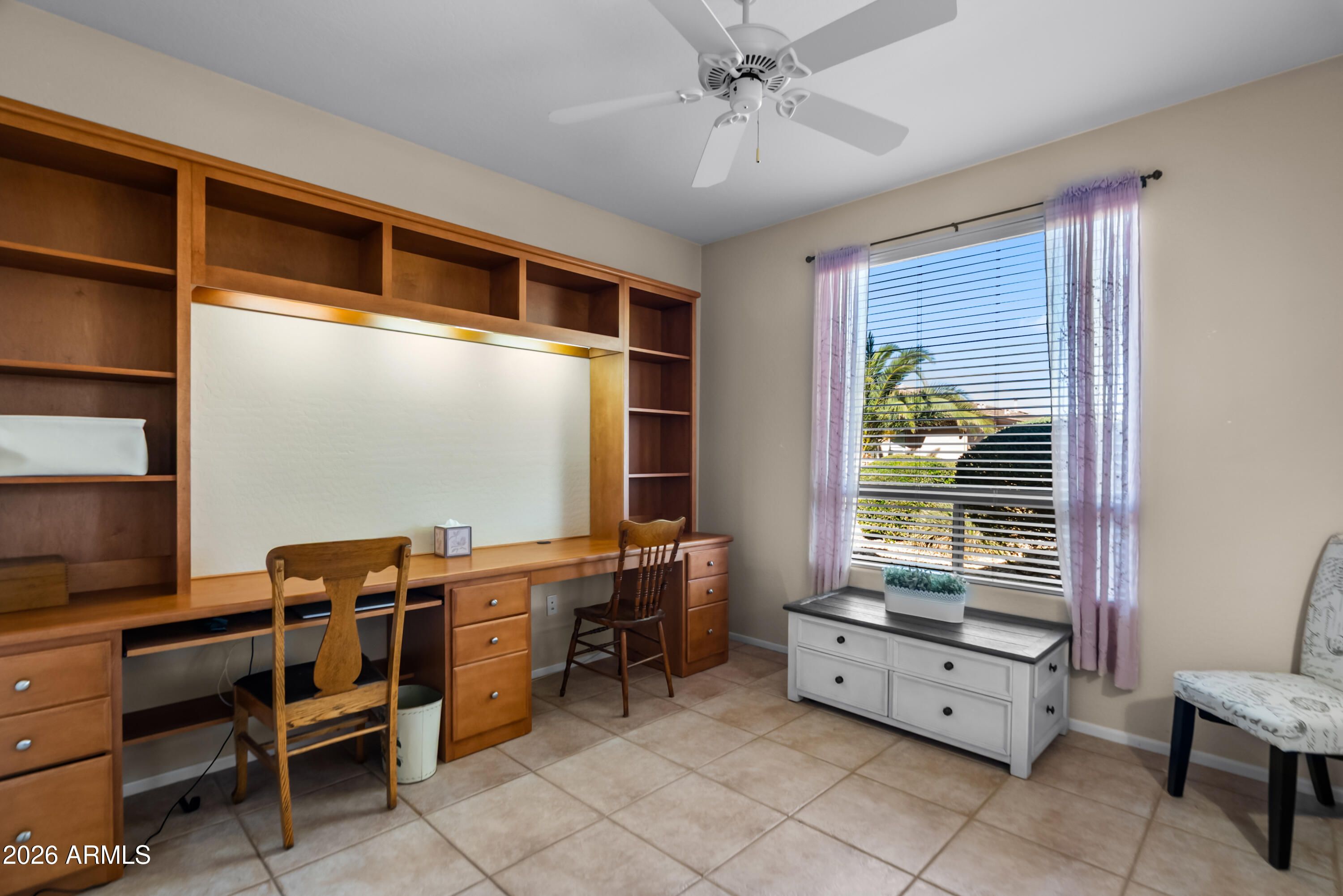 This is the one! Enjoy resort-style living in this beautifully updated Valencia II in the active adult community of Sun City Grand. This popular split-bedroom layout features 2 bedrooms, 2 baths, and a den/office with custom built-ins. The open-concept great room flows with 18'' tile, fresh GRANITE countertops, new sink and lighting, and convenient lower pull-out drawers. The primary suite includes a bay window and customized walk-in closet. Major updates include newer HVAC (2021), exterior paint (2023), programmable thermostat, soft water system, and garage storage with sink and workbench. Relax in the private backyard with NEW view fencing.
