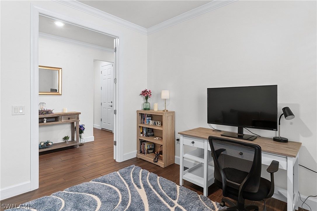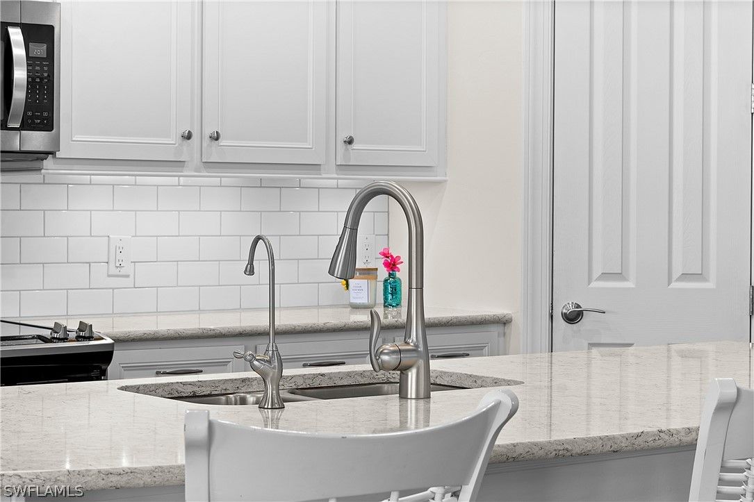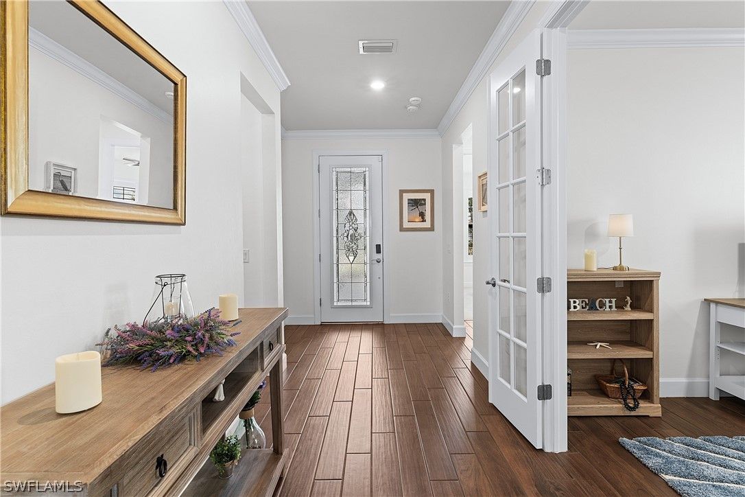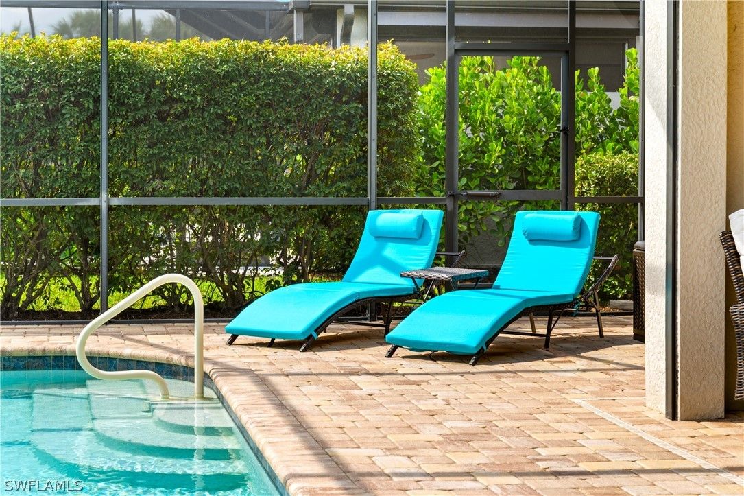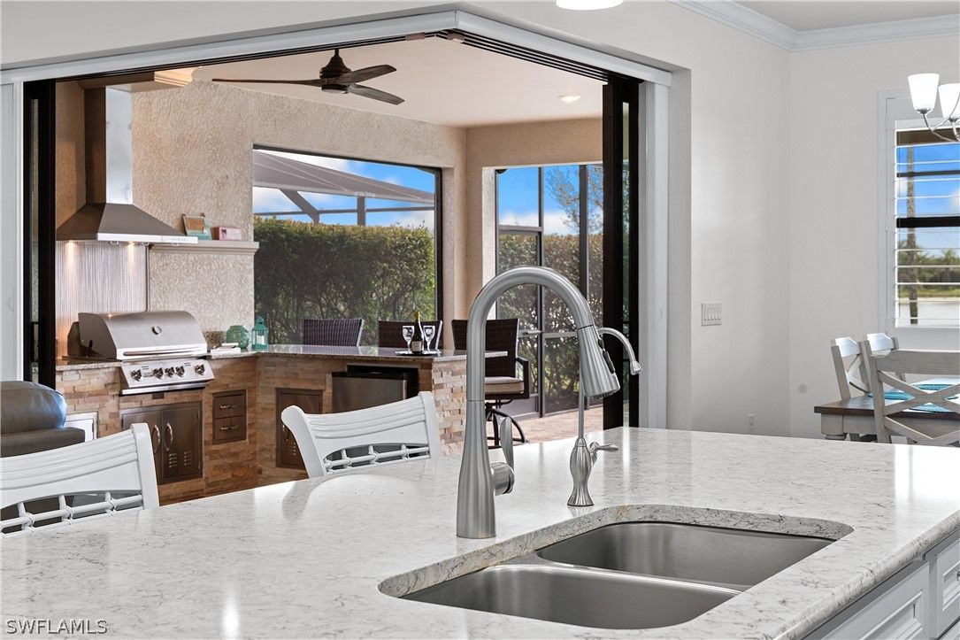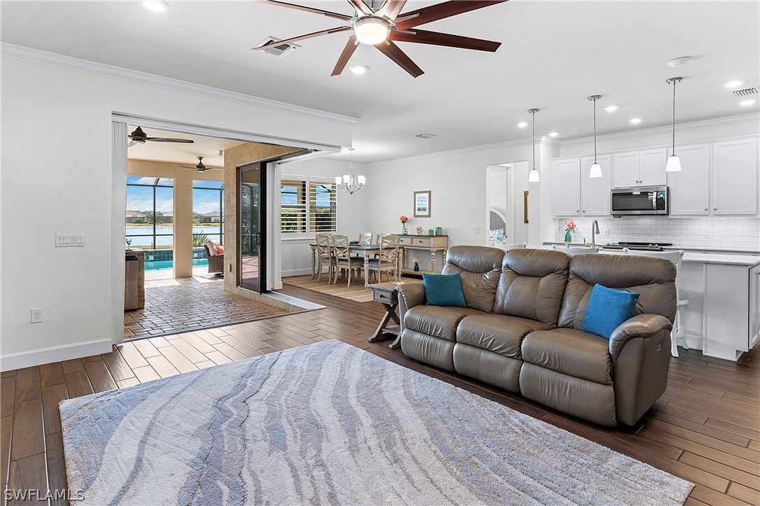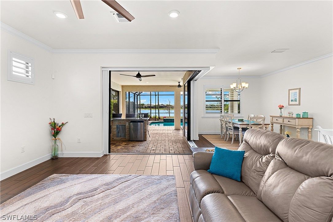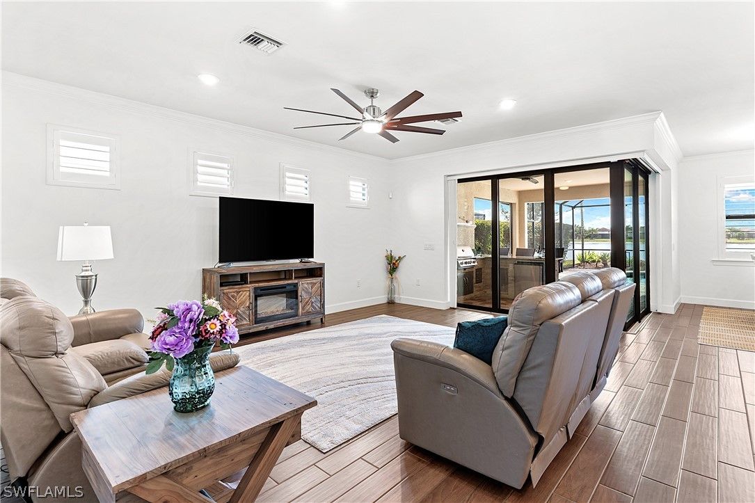 ENJOY SPARKLING LAKEFRONT WATER VIEWS FROM THIS STUNNING POOL HOME IN THE PLACE AT CORKSCREW! Built by Pulte Homes in 2018, this “Summerwood” floorplan offers 3 Bedrooms + Den (with Double Glass Door Entry), 2 Full Baths, 2 Car Garage with 4' GARAGE EXTENSION, 2,000sf living area. The OPEN CONCEPT floorplan features a Greatroom accented by CROWN MOLDING, Upscale Lighting and HUNTER DOUGLAS VERTIGLIDE BLINDS. The ZERO CORNER POCKETING SLIDERS create the INDOOR/OUTDOOR LIVING SPACE that everyone dreams of! The SPACIOUS LANAI wraps around the back of the home providing two separate areas for dining and relaxing which showcase a CUSTOM OUTDOOR KITCHEN with grill, vented hood, storage, and refrigeration along with ELECTRIC HURRICANE SCREENS & SHUTTER. No Florida home is complete without a screened and sealed paver pool deck with a BEAUTIFUL HEATED SALTWATER CUSTOM POOL with RAISED FEATURE WALL and a SHEER DECENT WATERFALL. This Southwest Rear Exposure homesite provides SUN ON THE POOL ALL DAY and plenty of room to add a fence beyond the pool enclosure for your kids and pets to play. This residence is accented by Rich Brown Porcelain Plank Tile in the main areas, PLANTATION SHUTTERS, upgraded ceiling fans, FLOOR TO CEILING TILE IN BOTH BATHROOMS, and a DESIGNER GLASS DOOR INSERT. The Kitchen showcases White Cabinetry, STAINLESS STEEL APPLIANCES, QUARTZ Countertops, REVERSE OSMOSIS at the sink, White subway tile BACKSPLASH illuminated by UNDERCABINET LIGHTING, WALK-IN PANTRY and an EXTENDED KITCHEN ISLAND with end caps for additional storage. The Dining area and Greatroom join the Kitchen creating an inviting space for dining and entertaining. Take in the water vistas from your bedside in the Primary Suite. The Primary Bath boasts QUARTZ COUNTERTOPS, double sinks, SOAKING TUB, separate ENCLOSED SHOWER, Linen Closet and a private water closet joined by an OVERSIZED WALK IN CLOSET. The Guest bedrooms are secluded to create a private setting for your guests. The laundry room and Garage are both outfitted with cabinetry. This home is equipped with ADT SECURITY SYSTEM WITH MOUNTED CAMERAS, WHOLE HOME WATER FILTRATION and IMPACT RESISTANT WINDOWS & DOORS. THIS PROPERTY IS HIGH AND DRY AND LOCATED IN FLOOD ZONE X... NO FLOOD INSURANCE REQUIRED! The amenities at The Place at Corkscrew are second to none!... Resort Pool w/100' Waterslide & Spa, Indoor Restaurant and Bourbon Bar, Cafe, Outdoor Bar, Fitness Center, Movement Studio, Tennis, Pickleball, Bocce, Basketball, Playground, Dog Park, Childwatch, Spa Services, 2 Entry Gates. Just Minutes to Schools, Shopping, Restaurants, Airport, Beaches. For GOLF ENTHUSIASTS, the highly rated Jack Nicklaus designed OLD CORKSCREW GOLF CLUB is open to the public and located across the street from the community! PUBLIX GROCERY STORE PLAZA, JUST 1.4 MILES AWAY! OTHER TENANTS INCLUDE DUNKIN DONUTS, UPS STORE, LEGNO ITALIAN RESTAURANT, NAIL SALON, DENTAL OFFICE, AND MORE!