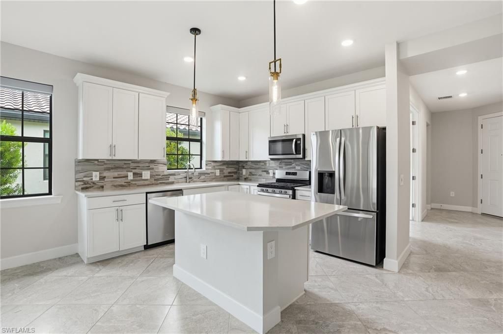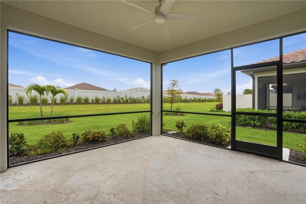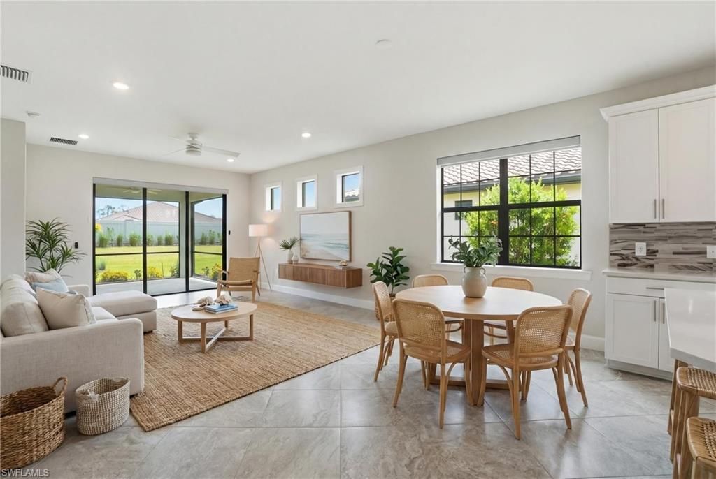 One or more photo(s) has been virtually staged, AI generated or rendered. Welcome to your sun-drenched sanctuary in one of Fort Myers’ most sought-after lifestyle communities. This bright and cheerful 2-bedroom + den villa blends thoughtful upgrades with effortless Florida living, where every day feels like a vacation. Step inside to an open, airy layout filled with natural light reflecting off tile floors throughout. The kitchen is both stylish and functional, featuring sleek quartz countertops, a designer backsplash, a 24" counter-depth LG refrigerator, and extended-height pantry cabinetry for a polished, elevated feel. The dining and living area make a statement with a custom feature wall, complemented by electric shades and dimmer switches to set the perfect ambiance. The spacious primary suite offers a relaxing retreat with a tray ceiling and custom shades, while the versatile den—enclosed with glass French doors—works beautifully as an office, guest space, or cozy lounge. A welcoming guest bedroom with plantation shutters and an upgraded secondary bath continue the home’s attention to detail. Convenience is woven throughout with a WiFi-enabled thermostat, whole-home water filtration system, generous interior storage, and a standout garage featuring an epoxy floor and insulated door. Step outside to your private tiled lanai, complete with sealed shell stone flooring and no-see-um screens—perfect for enjoying peaceful mornings or relaxed evenings with seamless indoor-outdoor living year-round. As a resident of Esplanade Lake Club, you’ll enjoy a true resort-style experience with a lakeside beach, kayaking and paddleboarding, a full-service spa, fitness center, pickleball and tennis courts, dog parks, and a vibrant social calendar. Waterfront dining, fireside lounges, and endless sunshine complete the lifestyle. This isn’t just a home—it’s your opportunity to live like you’re on vacation every day.