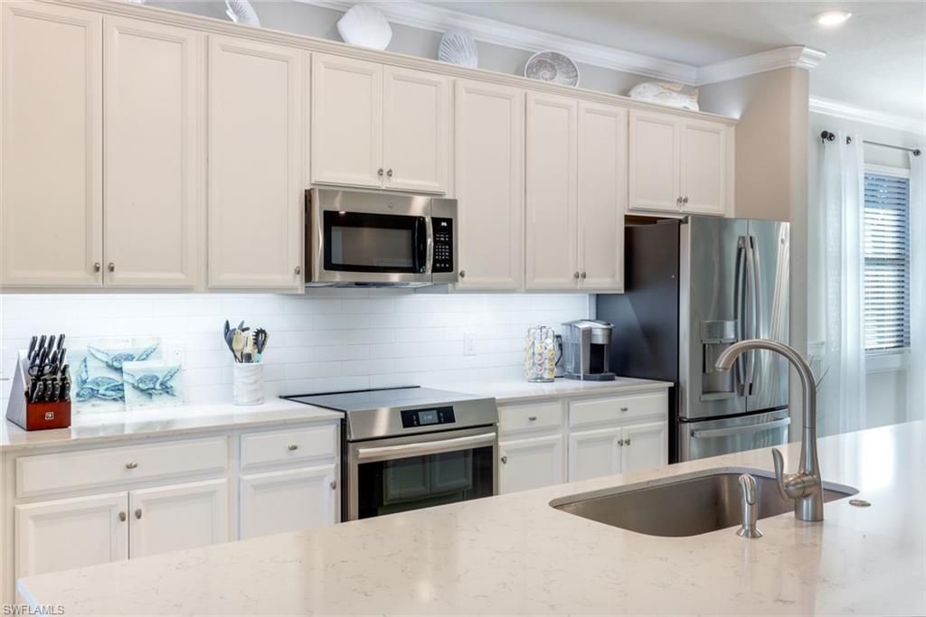 Social Membership is included with this stunning, second-floor coastal coach home, offering breathtaking morning views over the lake from your spacious screened lanai and Great Room. This is the perfect year-round or seasonal residence, featuring a desirable split-bedroom layout. The primary suite is a true retreat with two walk-in closets and a spa-inspired bathroom boasting a large walk-in shower and dual vanities. The Great Room is ideal for entertaining, highlighted by a large center island in the kitchen—perfect for gathering while you prepare culinary delights. Enter through a grand foyer on the first floor, with direct access to your attached two-and-a-half-car garage. Enjoy numerous upgrades, including custom woodworking, a tiled lanai, and beautiful, quality furnishings. As a social member, you'll have access to the lagoon pool with a waterfall and lap lane, spa, salon, full fitness and exercise rooms, a gorgeous clubhouse with game and meeting rooms, and dining options ranging from formal to the poolside bar and grill with cabanas. Enjoy a resort lifestyle at Bonita National, centrally located near sandy Gulf beaches, Naples, RSW Airport, and the River District in Fort Myers. Dining, shopping, arts, and nature are all just moments away!