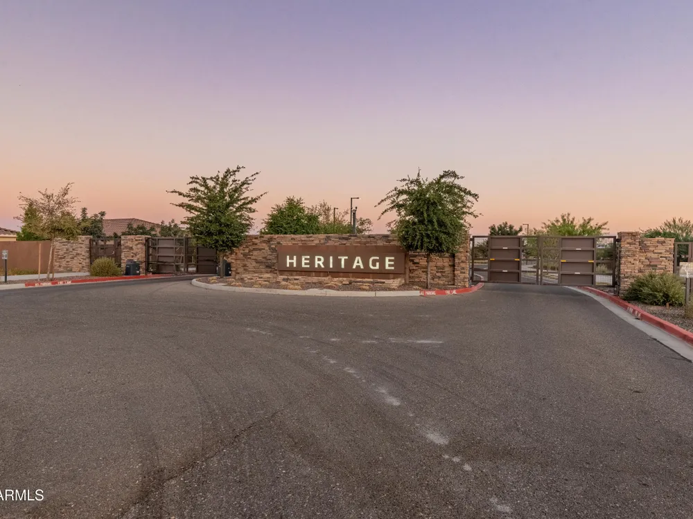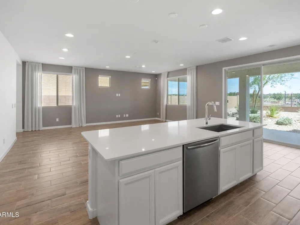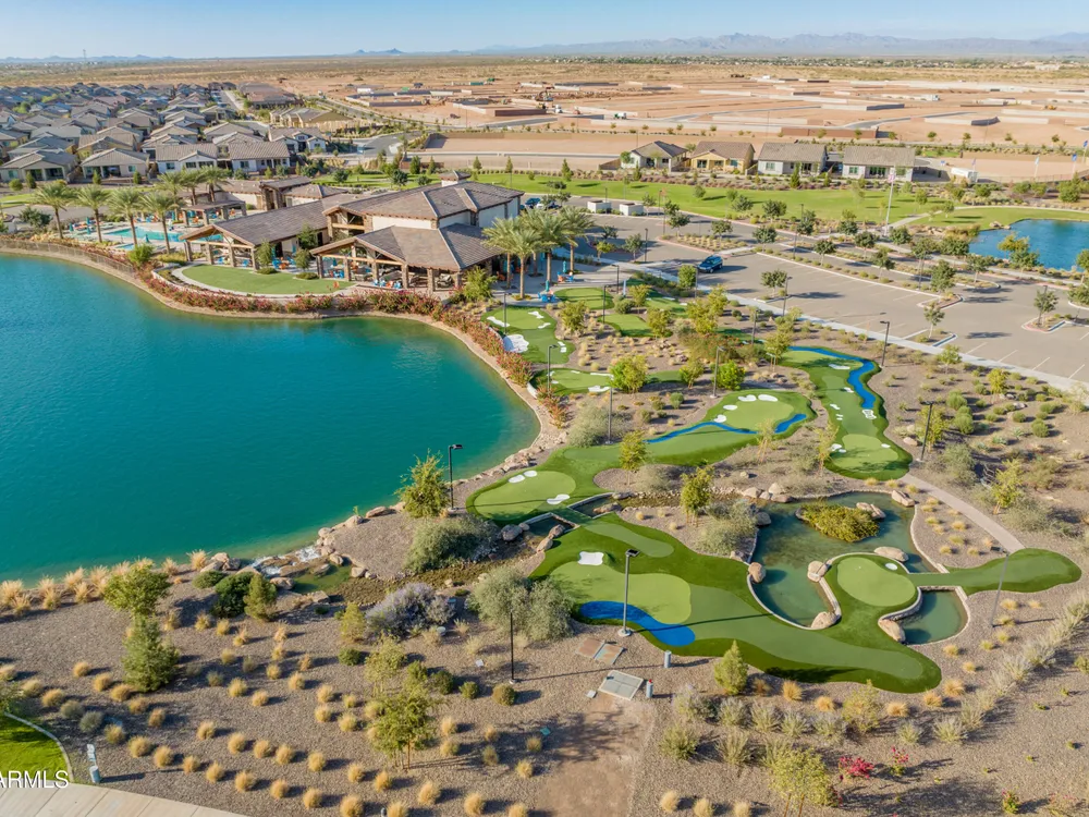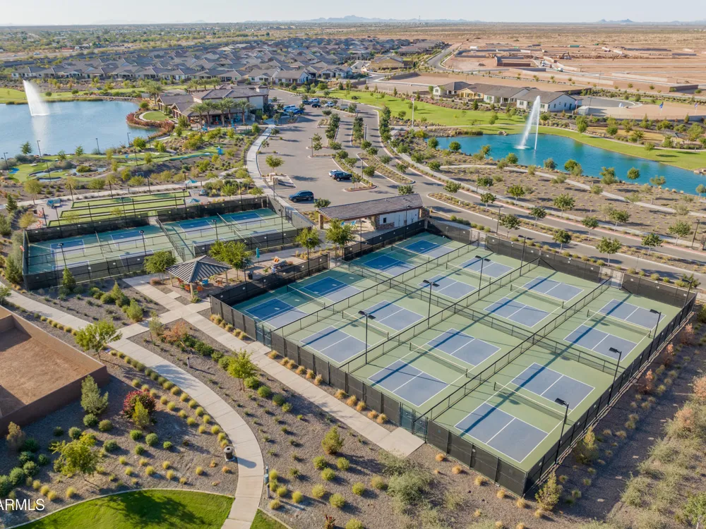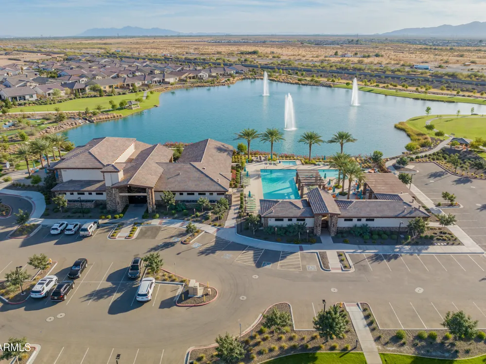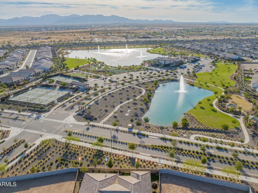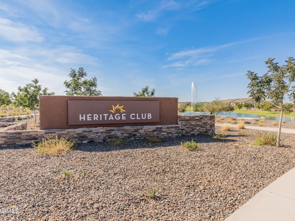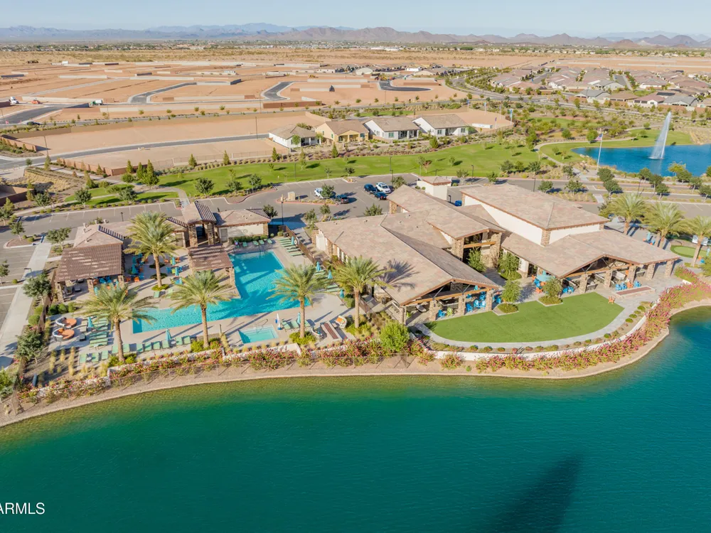 Former Lennar Model—Never Lived In! This stunning 2-bedroom, 2-bathroom home in the vibrant 55+ gated community of Heritage at Asante offers designer finishes and a prime premium lot with scenic views of the greenbelt, lake, and clubhouse—the perfect spot to enjoy Arizona sunsets. Step inside to find wood-look plank tile flooring throughout, creating a warm, modern aesthetic with easy maintenance. The spacious great room flows seamlessly into a bright, stylish kitchen featuring white cabinets, white quartz countertops, stainless steel appliances, and an open layout ideal for entertaining. The primary suite offers a peaceful retreat with a large walk-in closet, double sinks, and a walk-in shower. A standout feature of this model is the laundry room's direct access to (see supplements) to the primary closeta convenient upgrade that's no longer available from the builder. Outside, enjoy low-maintenance desert landscaping, a covered patio, and view fencing that opens to expansive views. Living in Heritage means enjoying resort-style amenities: multiple swimming pools, a full fitness center, pickleball courts, dog parks, a vibrant clubhouse, and a wide range of community events. This move-in-ready home offers not just luxury and comfortbut an active lifestyle in one of the West Valley's most desirable 55+ communities.