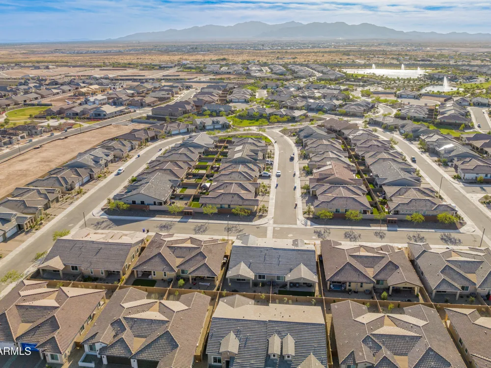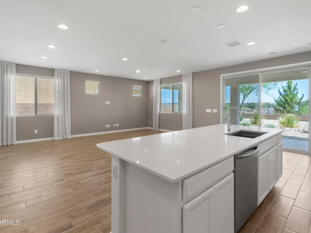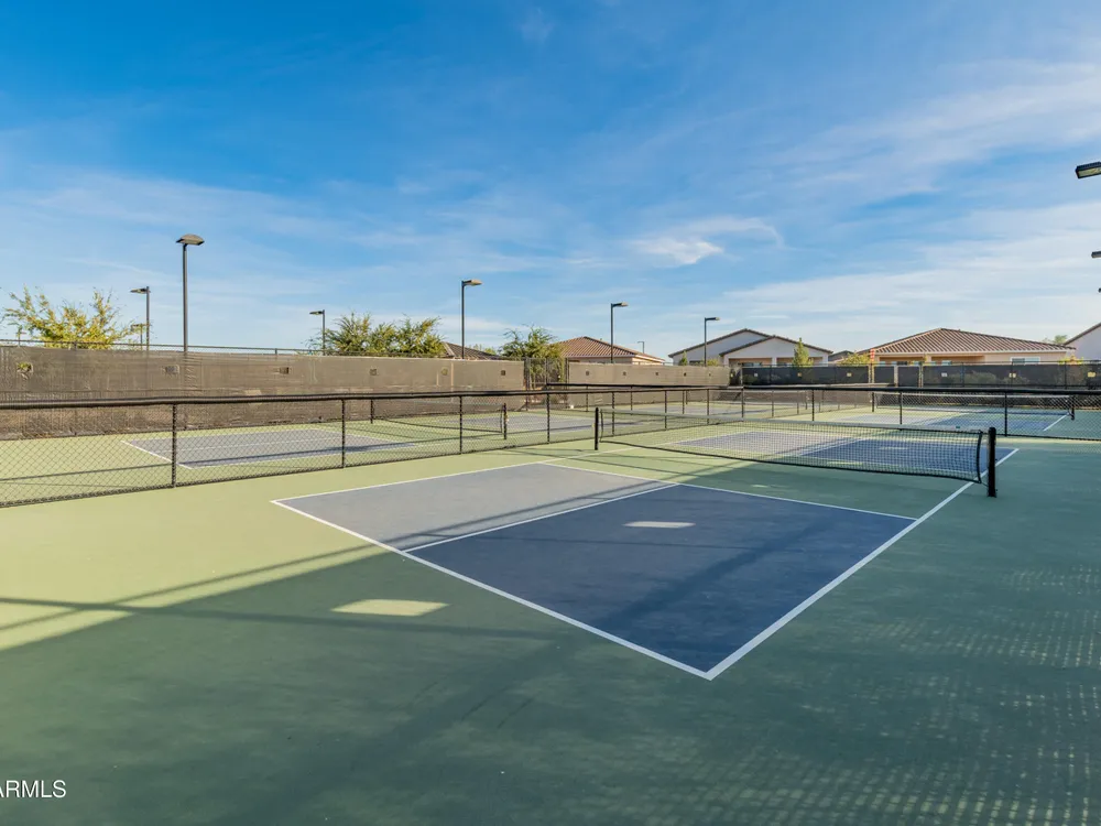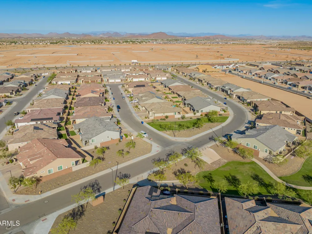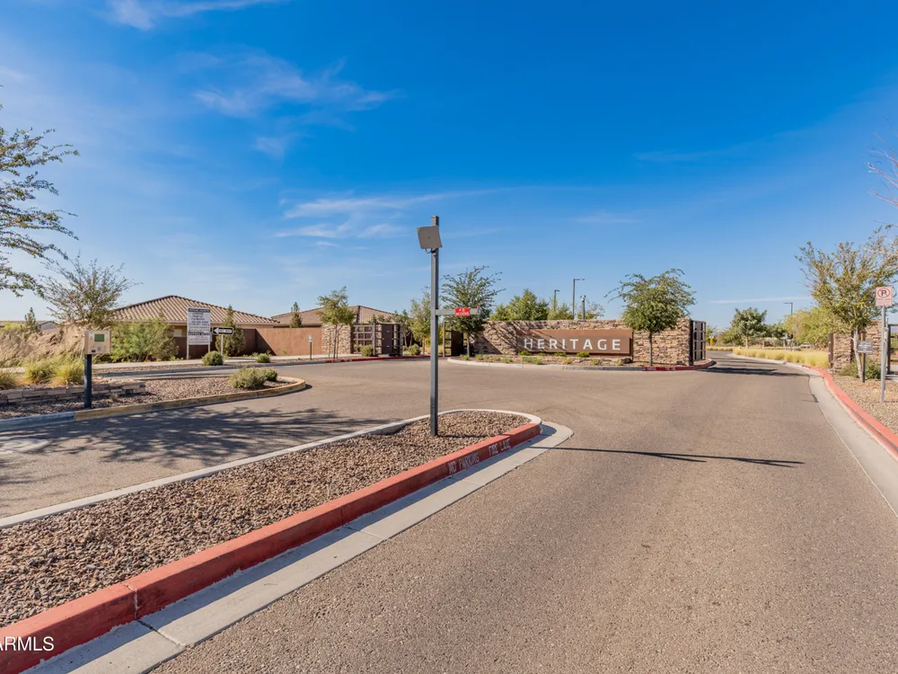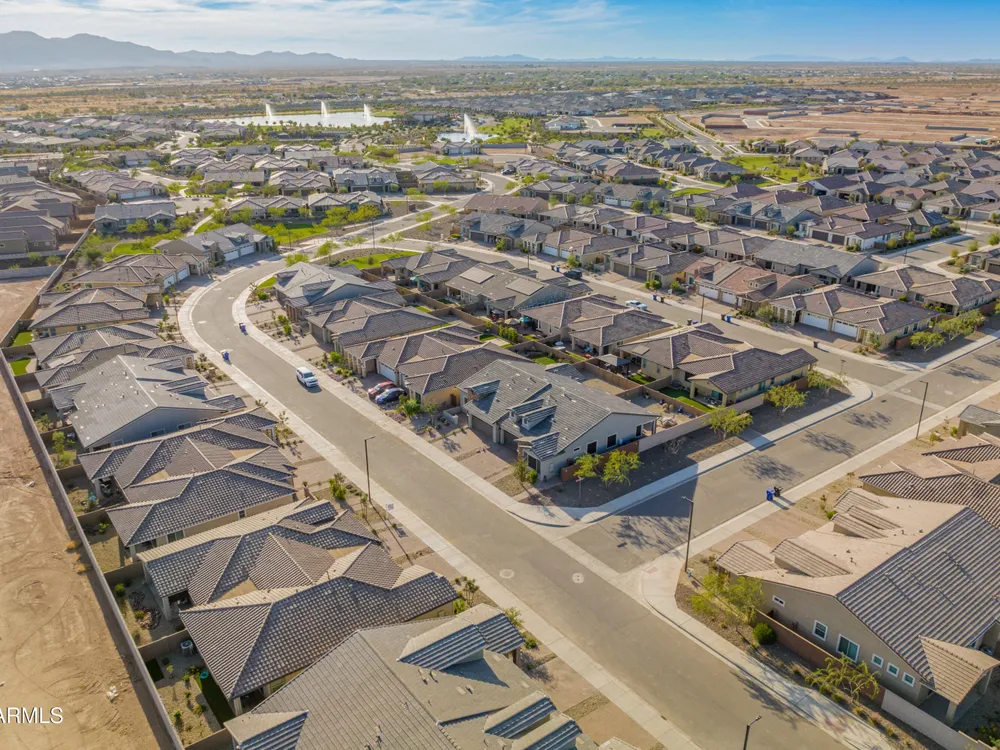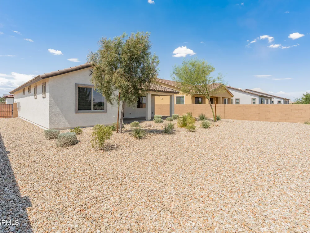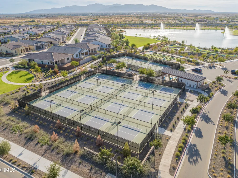 Former Lennar Model—Never Lived In! This stunning 2-bedroom, 2-bathroom home in the vibrant 55+ gated community of Heritage at Asante offers designer finishes and a prime premium lot with scenic views of the greenbelt, lake, and clubhouse—the perfect spot to enjoy Arizona sunsets. Step inside to find wood-look plank tile flooring throughout, creating a warm, modern aesthetic with easy maintenance. The spacious great room flows seamlessly into a bright, stylish kitchen featuring white cabinets, white quartz countertops, stainless steel appliances, and an open layout ideal for entertaining. The primary suite offers a peaceful retreat with a large walk-in closet, double sinks, and a walk-in shower. A standout feature of this model is the laundry room's direct access to (see supplements) to the primary closeta convenient upgrade that's no longer available from the builder. Outside, enjoy low-maintenance desert landscaping, a covered patio, and view fencing that opens to expansive views. Living in Heritage means enjoying resort-style amenities: multiple swimming pools, a full fitness center, pickleball courts, dog parks, a vibrant clubhouse, and a wide range of community events. This move-in-ready home offers not just luxury and comfortbut an active lifestyle in one of the West Valley's most desirable 55+ communities.