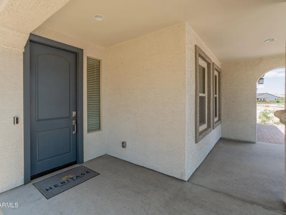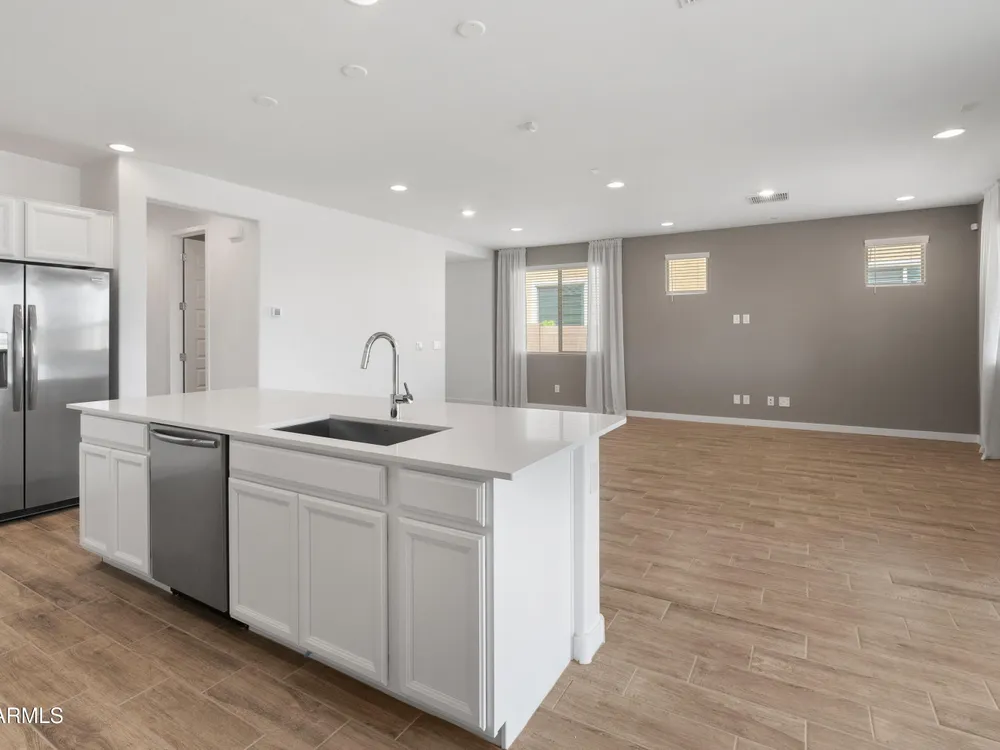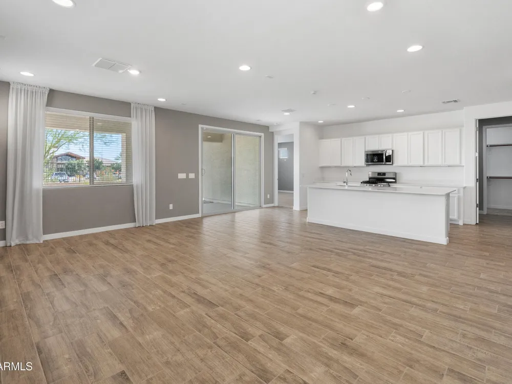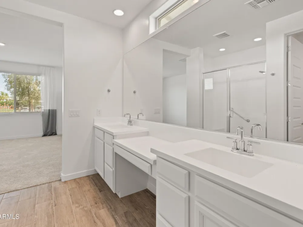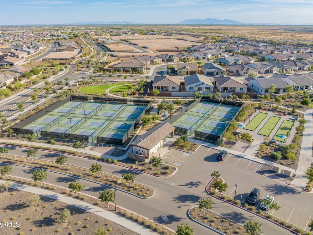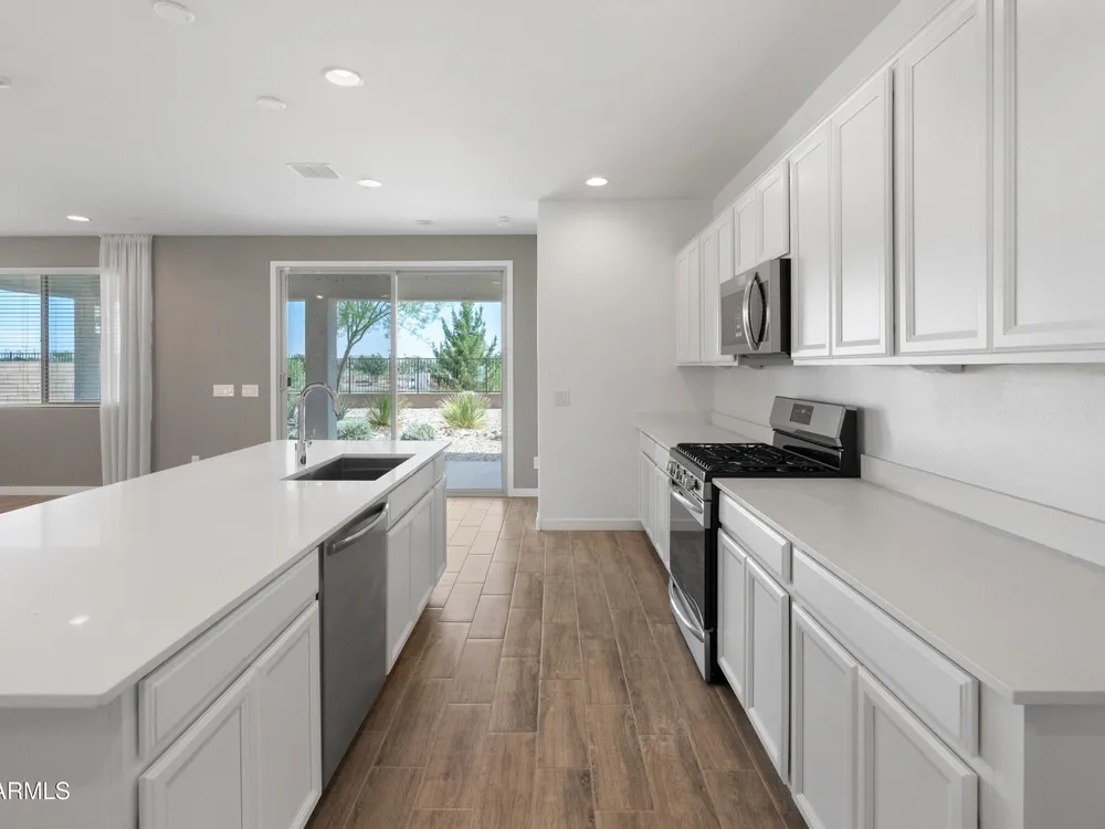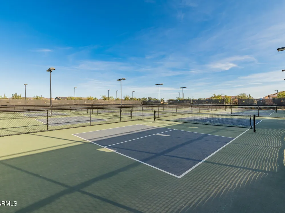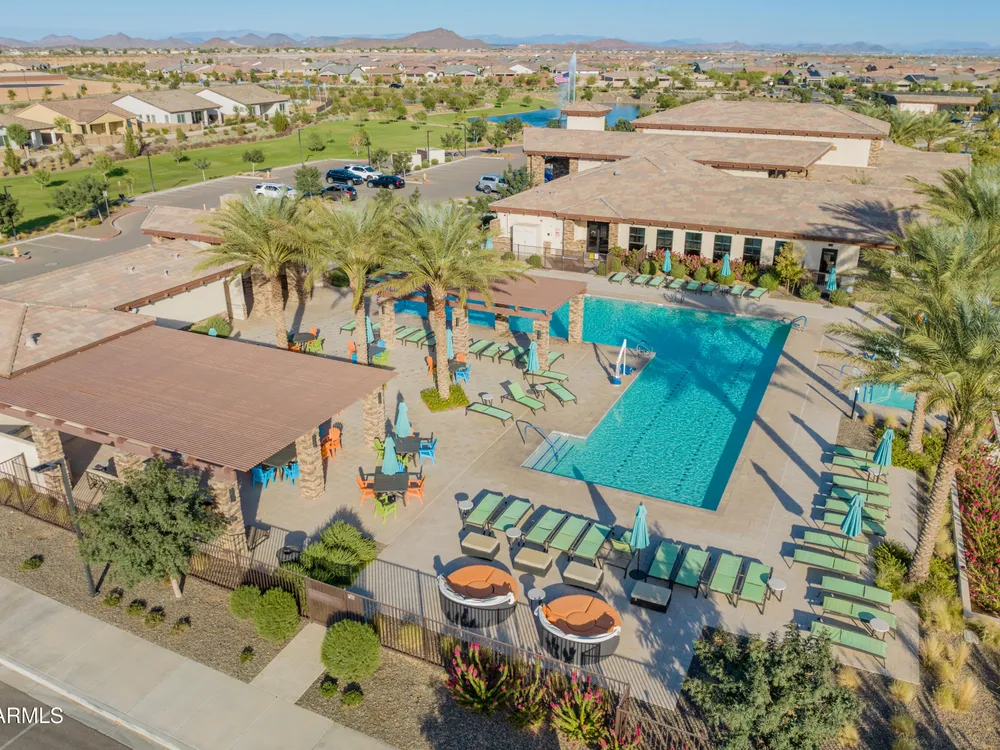 Former Lennar Model—Never Lived In! This stunning 2-bedroom, 2-bathroom home in the vibrant 55+ gated community of Heritage at Asante offers designer finishes and a prime premium lot with scenic views of the greenbelt, lake, and clubhouse—the perfect spot to enjoy Arizona sunsets. Step inside to find wood-look plank tile flooring throughout, creating a warm, modern aesthetic with easy maintenance. The spacious great room flows seamlessly into a bright, stylish kitchen featuring white cabinets, white quartz countertops, stainless steel appliances, and an open layout ideal for entertaining. The primary suite offers a peaceful retreat with a large walk-in closet, double sinks, and a walk-in shower. A standout feature of this model is the laundry room's direct access to (see supplements) to the primary closeta convenient upgrade that's no longer available from the builder. Outside, enjoy low-maintenance desert landscaping, a covered patio, and view fencing that opens to expansive views. Living in Heritage means enjoying resort-style amenities: multiple swimming pools, a full fitness center, pickleball courts, dog parks, a vibrant clubhouse, and a wide range of community events. This move-in-ready home offers not just luxury and comfortbut an active lifestyle in one of the West Valley's most desirable 55+ communities.