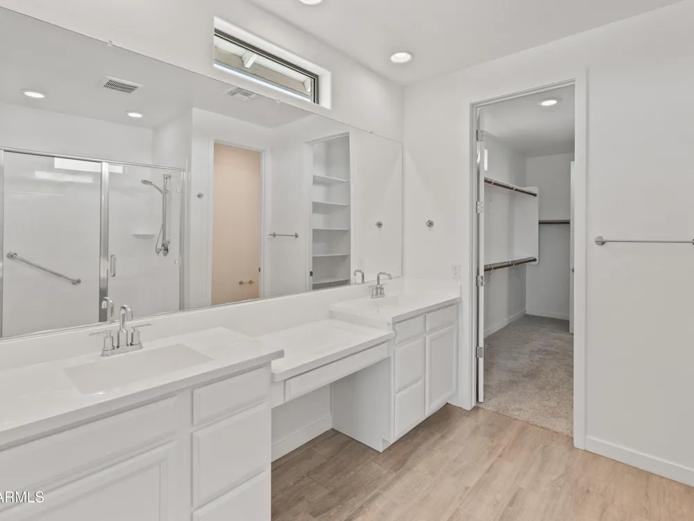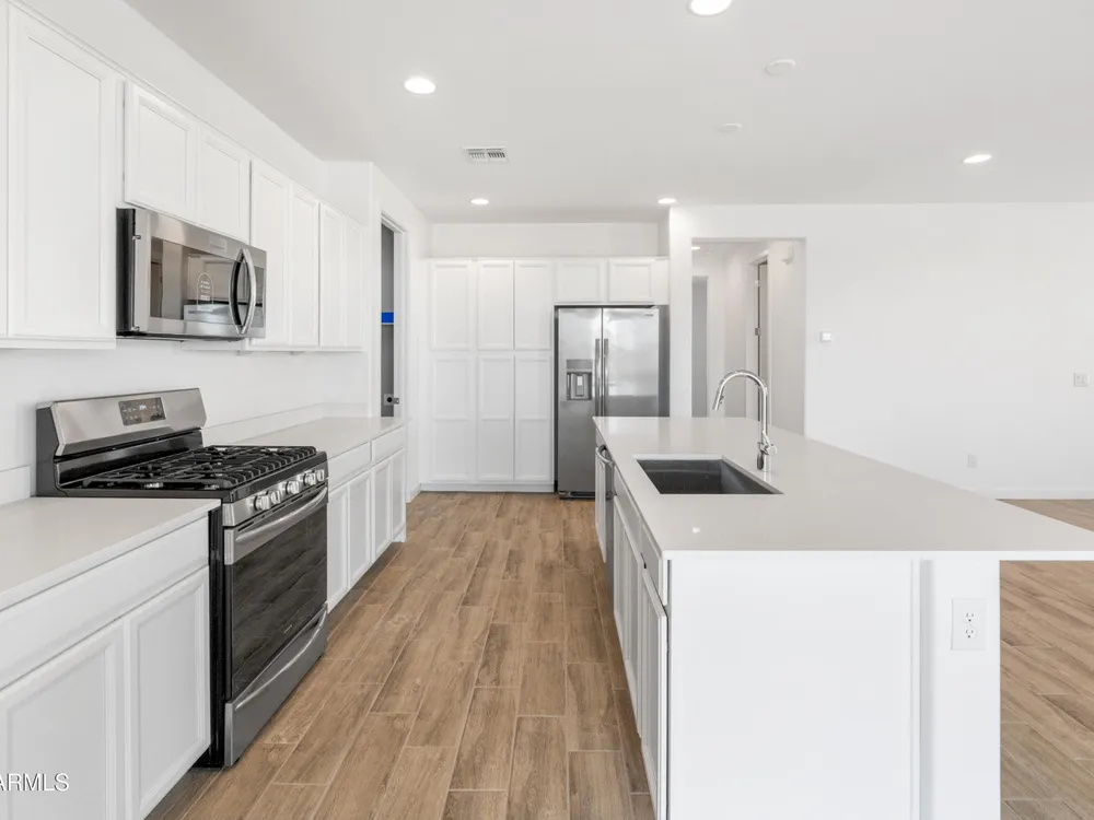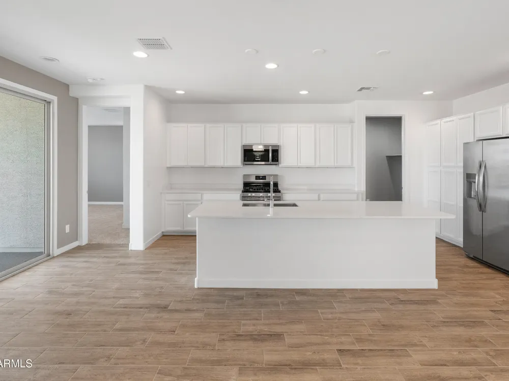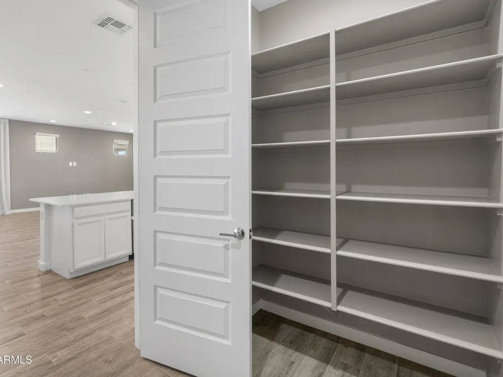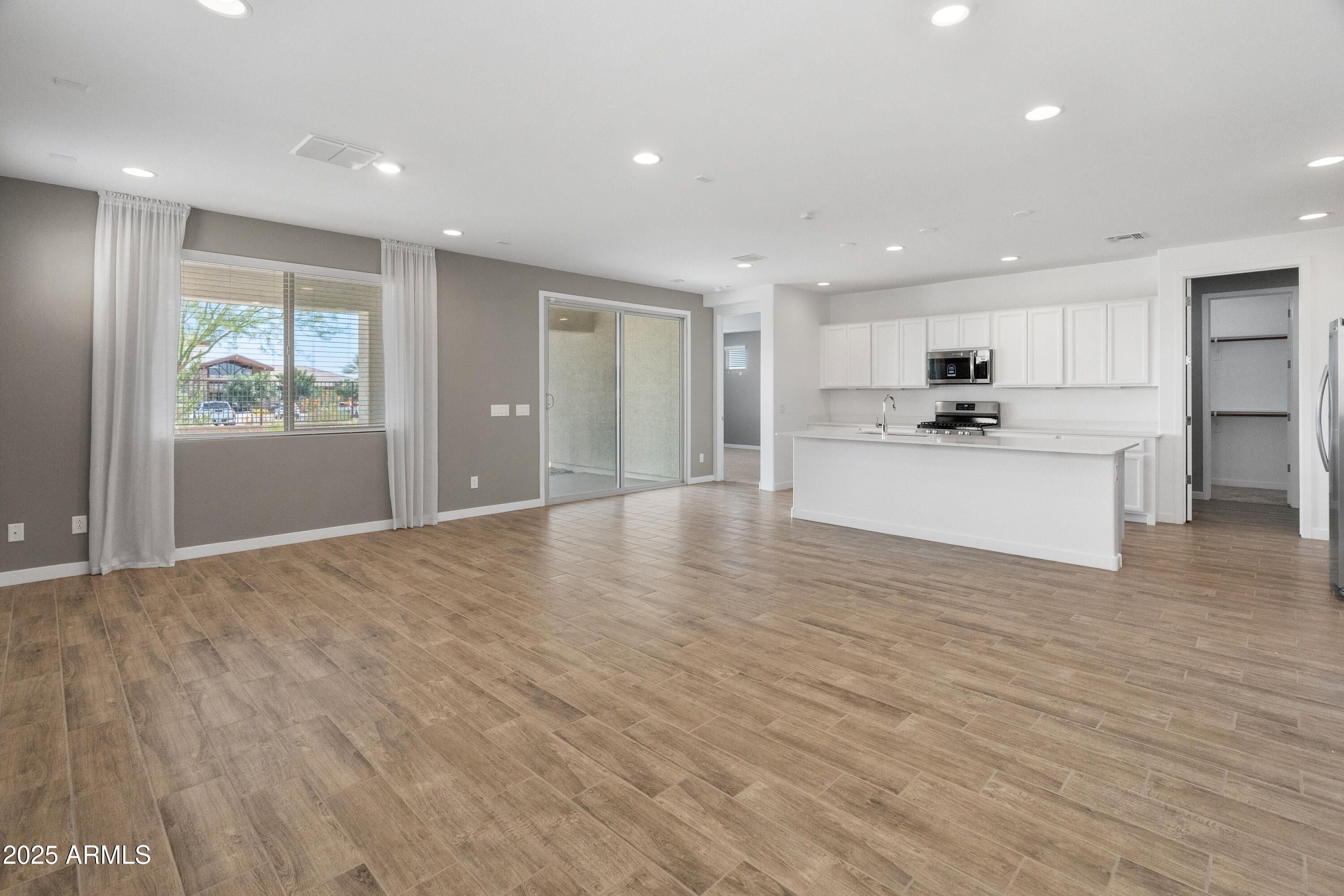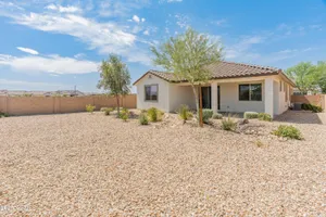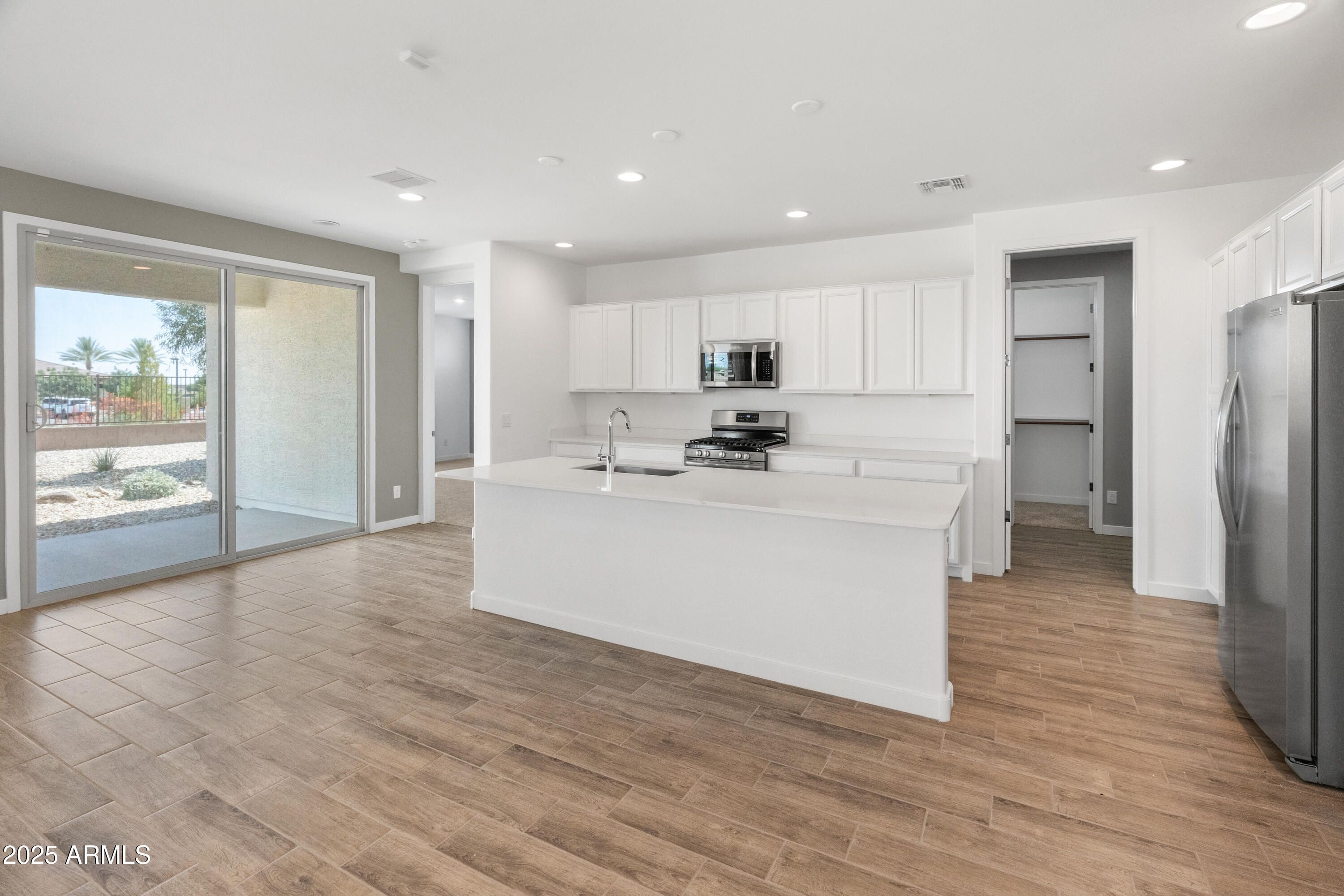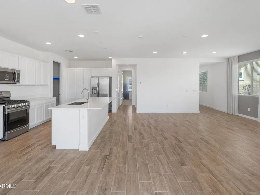 Former Lennar Model—Never Lived In! This stunning 2-bedroom, 2-bathroom home in the vibrant 55+ gated community of Heritage at Asante offers designer finishes and a prime premium lot with scenic views of the greenbelt, lake, and clubhouse—the perfect spot to enjoy Arizona sunsets. Step inside to find wood-look plank tile flooring throughout, creating a warm, modern aesthetic with easy maintenance. The spacious great room flows seamlessly into a bright, stylish kitchen featuring white cabinets, white quartz countertops, stainless steel appliances, and an open layout ideal for entertaining. The primary suite offers a peaceful retreat with a large walk-in closet, double sinks, and a walk-in shower. A standout feature of this model is the laundry room's direct access to (see supplements) to the primary closeta convenient upgrade that's no longer available from the builder. Outside, enjoy low-maintenance desert landscaping, a covered patio, and view fencing that opens to expansive views. Living in Heritage means enjoying resort-style amenities: multiple swimming pools, a full fitness center, pickleball courts, dog parks, a vibrant clubhouse, and a wide range of community events. This move-in-ready home offers not just luxury and comfortbut an active lifestyle in one of the West Valley's most desirable 55+ communities.