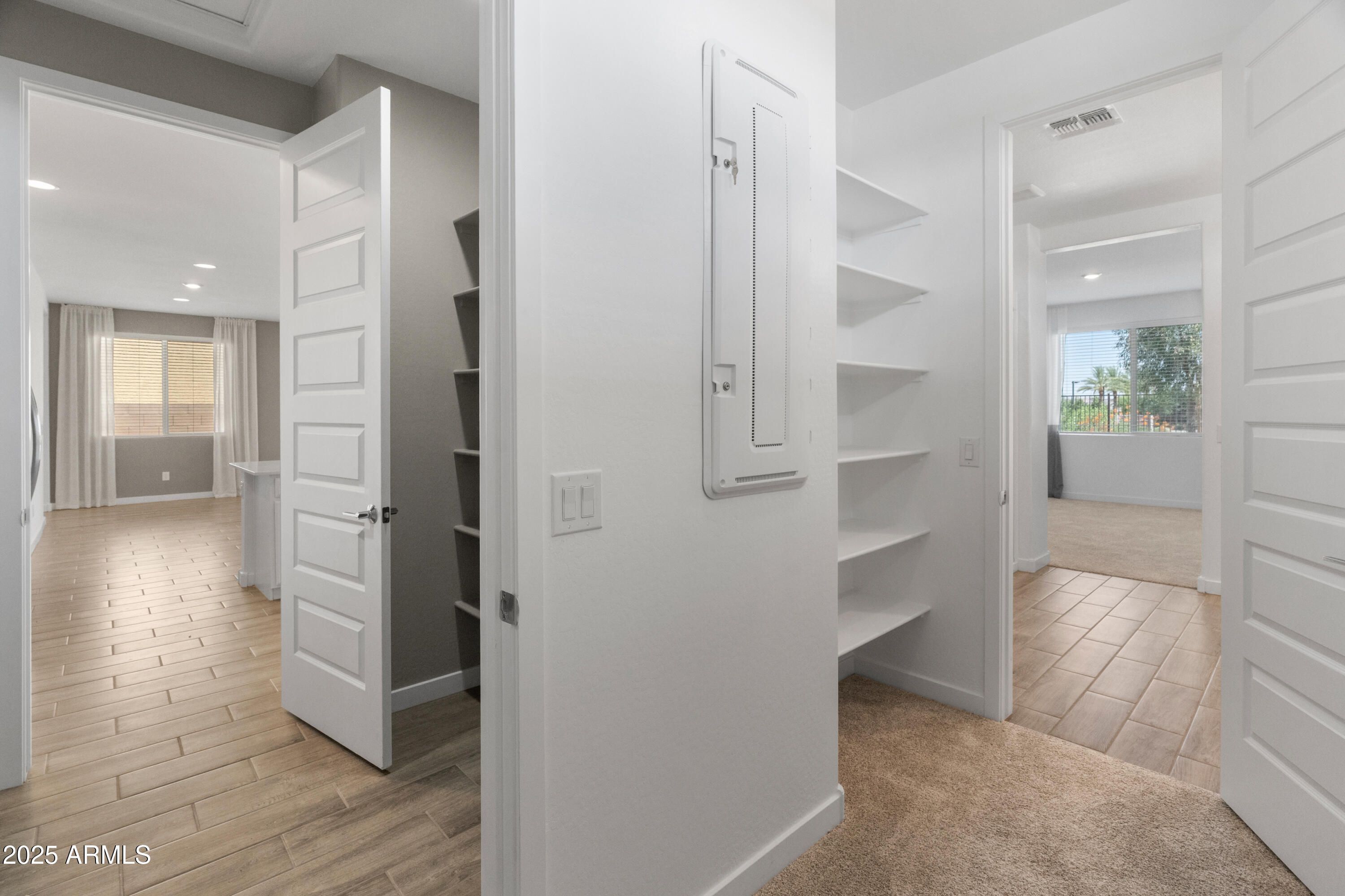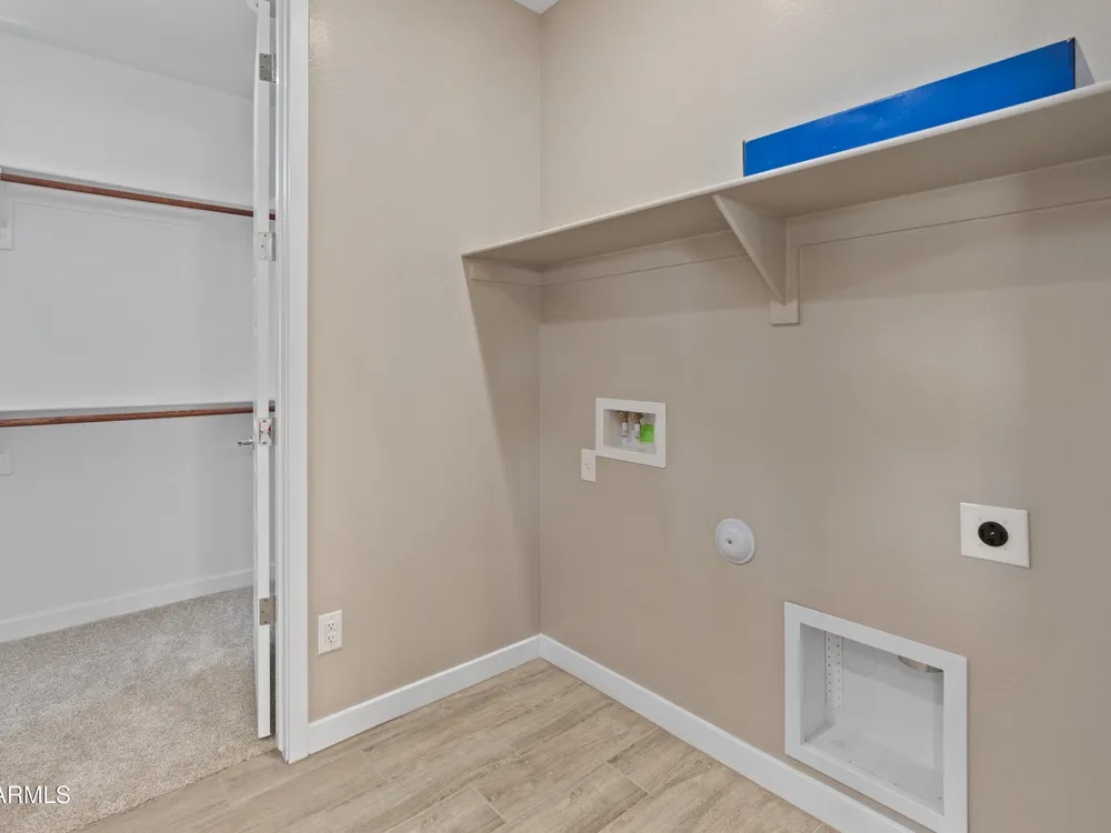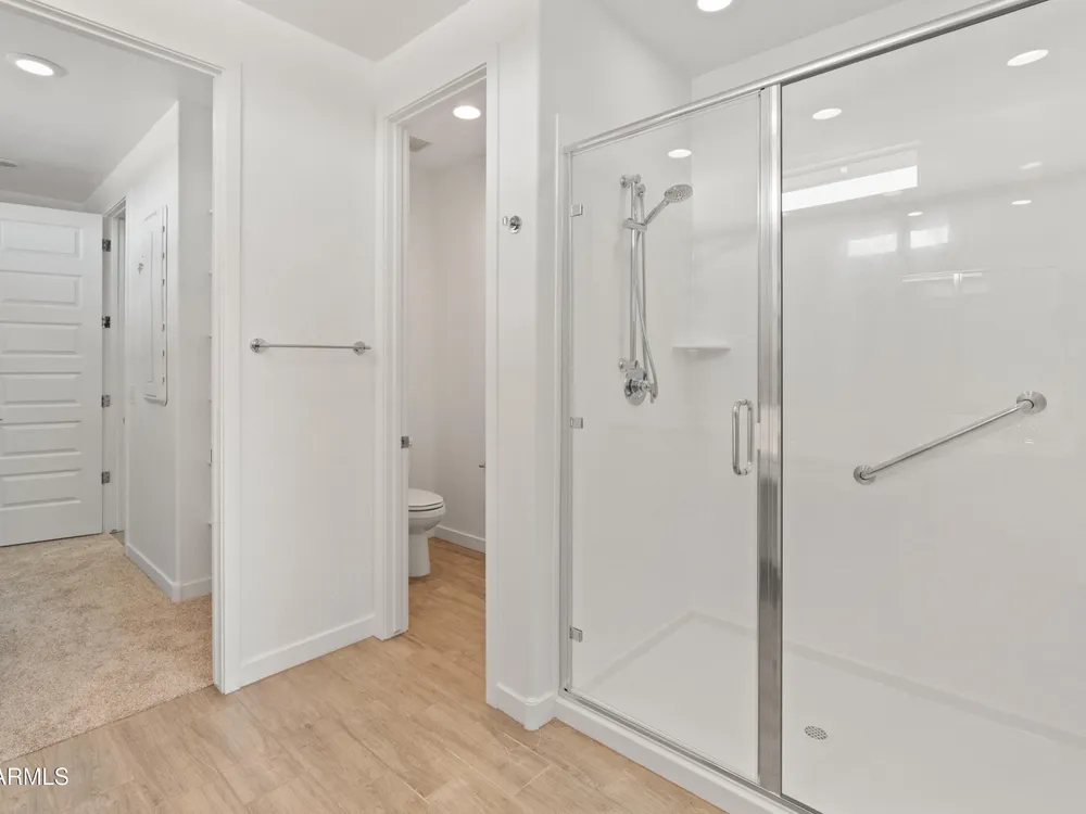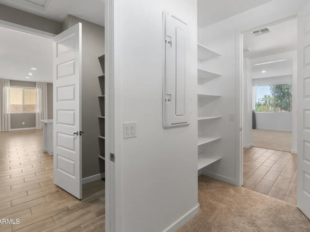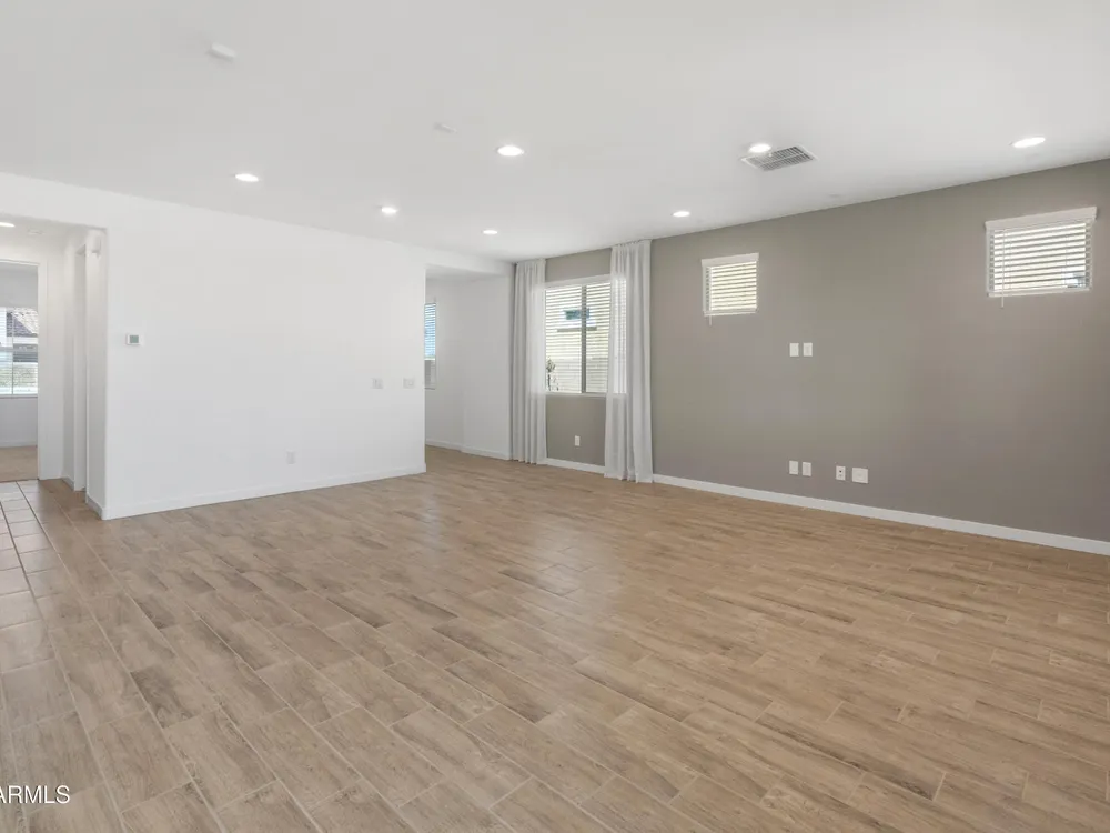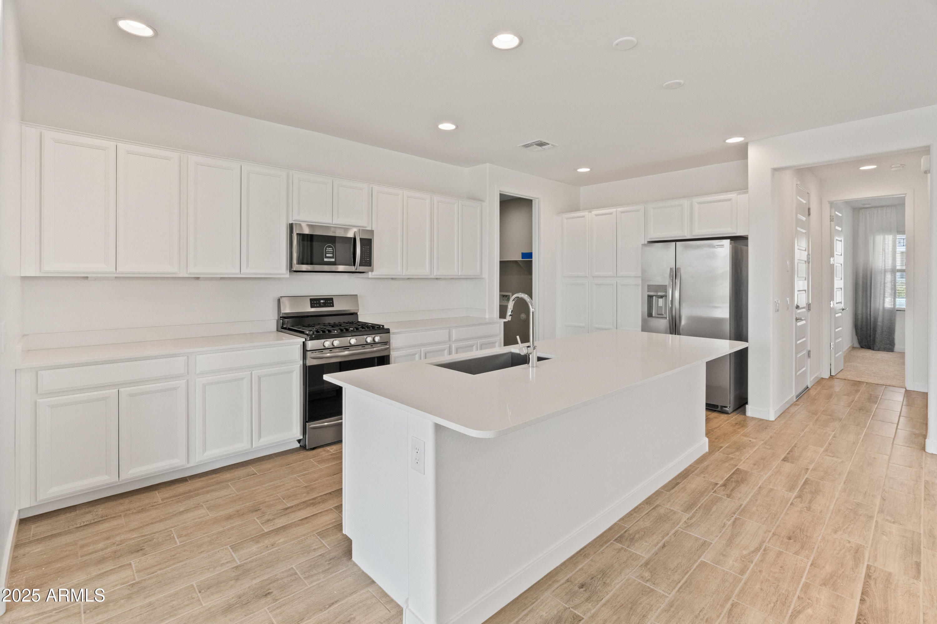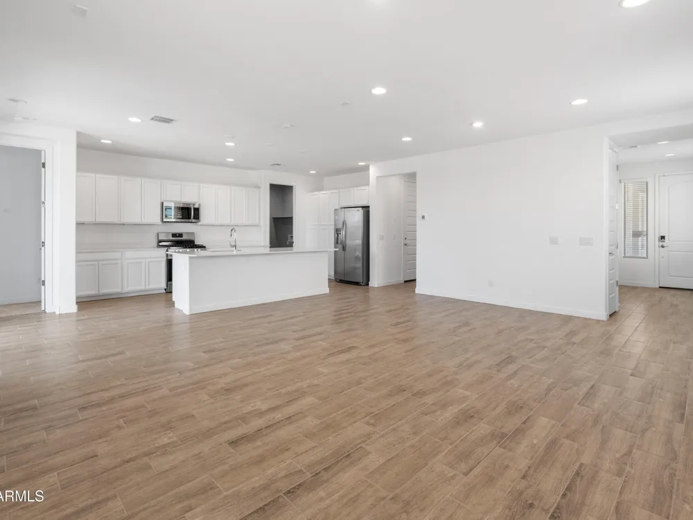 Former Lennar Model—Never Lived In! This stunning 2-bedroom, 2-bathroom home in the vibrant 55+ gated community of Heritage at Asante offers designer finishes and a prime premium lot with scenic views of the greenbelt, lake, and clubhouse—the perfect spot to enjoy Arizona sunsets. Step inside to find wood-look plank tile flooring throughout, creating a warm, modern aesthetic with easy maintenance. The spacious great room flows seamlessly into a bright, stylish kitchen featuring white cabinets, white quartz countertops, stainless steel appliances, and an open layout ideal for entertaining. The primary suite offers a peaceful retreat with a large walk-in closet, double sinks, and a walk-in shower. A standout feature of this model is the laundry room's direct access to (see supplements) to the primary closeta convenient upgrade that's no longer available from the builder. Outside, enjoy low-maintenance desert landscaping, a covered patio, and view fencing that opens to expansive views. Living in Heritage means enjoying resort-style amenities: multiple swimming pools, a full fitness center, pickleball courts, dog parks, a vibrant clubhouse, and a wide range of community events. This move-in-ready home offers not just luxury and comfortbut an active lifestyle in one of the West Valley's most desirable 55+ communities.