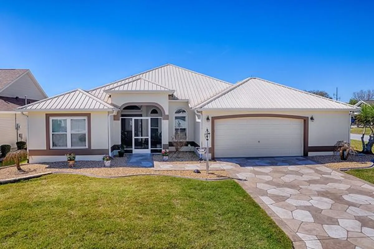 AMAZING UPGRADED POOL HOME & NO BOND. A ONE OF A KIND 3 bedroom 2 bath DESINGER GARDENIA HAS AN OVERSIZED STRETCHED GARAGE on LARGE CORNER HOMESITE. The SELLERS PRIDE Shows Throughout. This BEAUTIFUL HOME HAS A RARE METAL ROOF. MOSTLY REMODELED TO INCLUDE A NEW KITCHEN with QUARTZ COUNTERS, UPGRADED 36" AND 42" CABINETS & HARDWARE, CROWN MOLDING, UPGRADED PULLOUT SHELVING, QUIET SOFT CLOSE DOORS & DRAWERS, COMPLIMENTARY TILED BACKSPLASH, SPLIT STAINLESS STEEL SINK & FAUCET WITH COMPLIMENTARY STAINLESS STEEL APPLIANCES. HOME HAS NO CARPET. ALL POPCORN CEILINGS have been removed and REPLACED with KNOCKDOWN TEXTURED CEILINGS and 6 INCH CROWN MOLDING THROUGHOUT. HOME OFFERS VOLUME CEILINGS FOR A LIGHT AND AIRY FEELING, & INCLUDES A SOLAR TUBE IN MAIN LIVING AREA. NEW ENERGY EFFICIENT DOUBLE PANE WINDOWS. HOME HAS SOLAR PANALS FOR LOWER UTILITY COSTS. THE SPACIOUS MAIN BEDROOM HAS 2 WALK IN CLOSETS, DOUBLE VANITIES, & ADDITIONAL BUILT IN STORAGE. THE FRONT BEDROOM HAS A BUILT IN MURPHY BED & DESK WITH UNDER CABINET LIGHTING. GUEST BATH HAS BEEN UPGRADED WITH NEW WALK IN SHOWER, VANITY, SINK & QUARTZ COUNTER. THE BIRDCAGED COVERED SALT WATER POOL IS WHERE YOU WILL WANT TO RELAX & ENJOY THE GORGEOUS FLORIDA WEATHER, ENTERTAIN OR JUST RELAX WITH A BOOK OR YOUR FAVORITE BEVERAGE & EVEN HAS AN ADDITIONAL REFRIGERATOR, SINK & CONVERSATION BAR. EPOXY GARAGE FLOOR, ADDITIONAL 6 FOOT STRETCH IN GARAGE TO ACCOMMODATE GOLF CART OR EXTRA STORAGE. STAMPED DESIGNED DRIVEWAY. THIS HOME OFFERS SO MUCH MORE, YOU HAVE TO SCHEDULE A TOUR & SEE FOR YOURSELF. DON'T WAIT THIS ONE IS A CHARMER.
