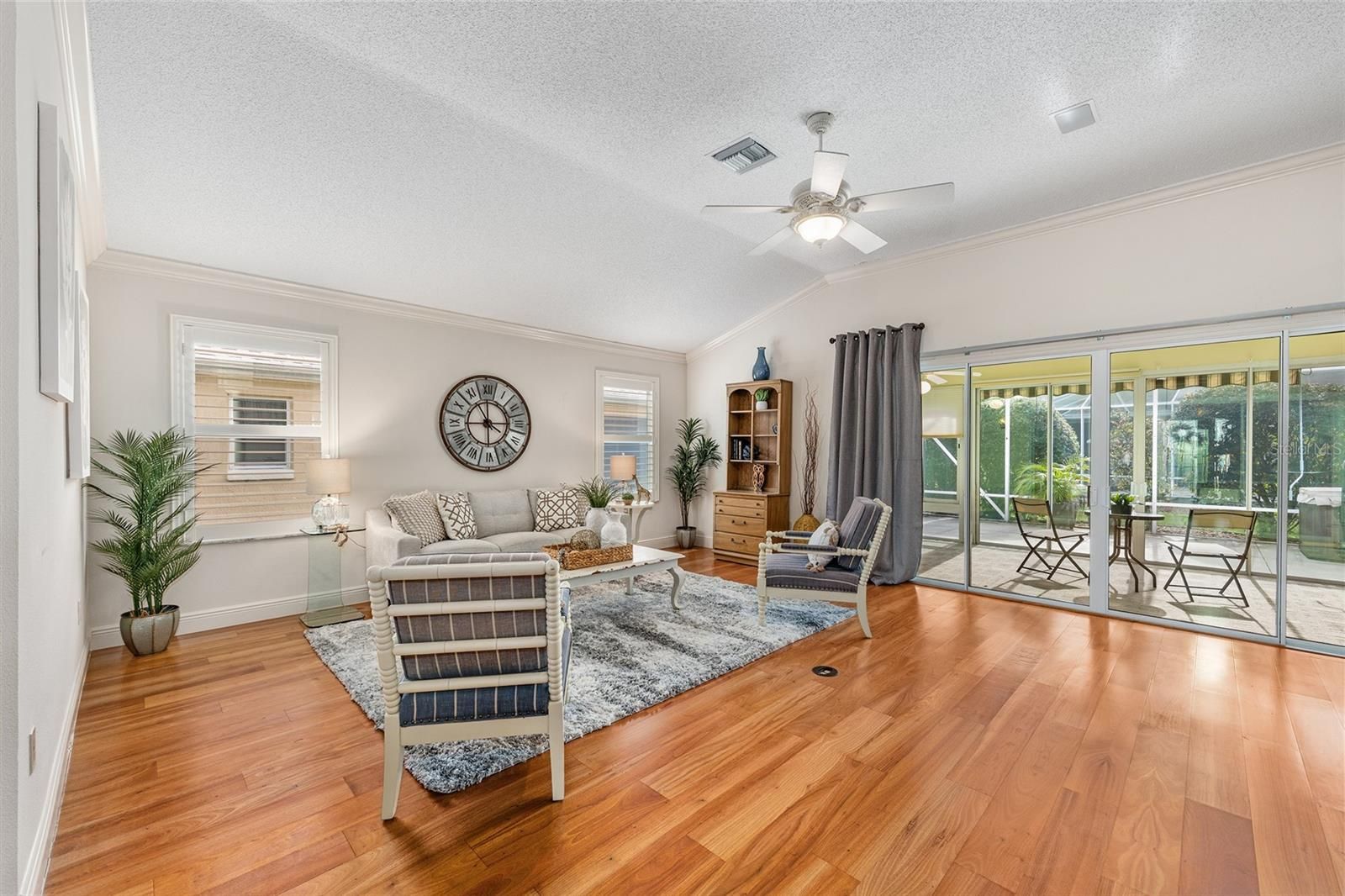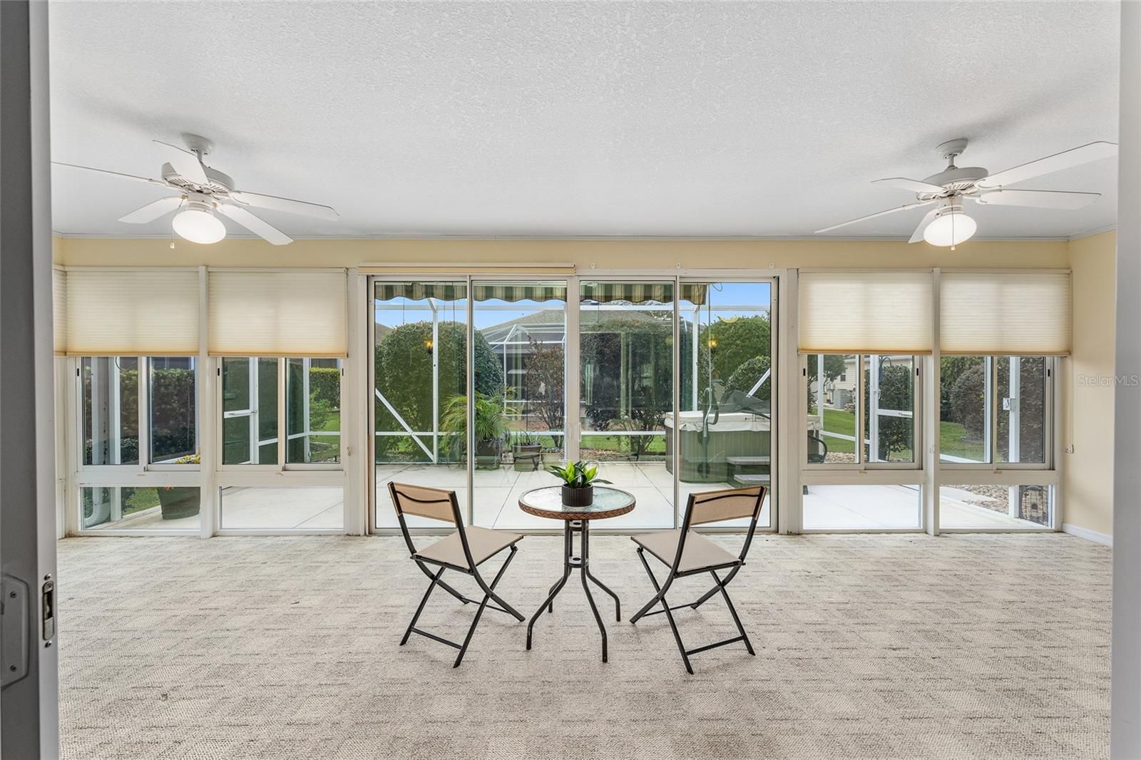 NO BOND!!! Extremely popular Designer Series home in the Village of Chatham community of The Villages. Just 1.5 miles from the Nancy Lopez Country Club and Restaurant, and also right down the street from Oakleigh Executive Golf Course. This home features a wonderful large and open layout, with high ceilings and lots of light throughout. Wonderful extra touches, such as specialty entry windows and door, upgraded flooring, kitchen lighting, and built ins! This lovely home is perfect for entertaining, with a layout that is welcoming to guests, and plenty of room for everyone! The kitchen features wood cabinets, and a light and bright breakfast area, while the dining area is conveniently off of the kitchen. The open living area looks out onto a large lanai, which is fully enclosed for all season use, and beyond that is an extended patio, which contains a hot tub, and has a bird cage enclosure! The primary suite has direct access to the lanai, as well as elevated ceilings, two walk in closets, and an en-suite bathroom. The second bedroom has a murphy bed cabinet, which gives the homeowner much more usable space in the room to make it a hobby/workout/craft room. The third bedroom/flex room has a built in office area as well as storage cabinets and another built in murphy bed, expanding the guest options. The garage features built in cabinets for your storage needs. This is a highly sought after floor plan, so don't miss your opportunity to be one of the first to see this beautiful home!