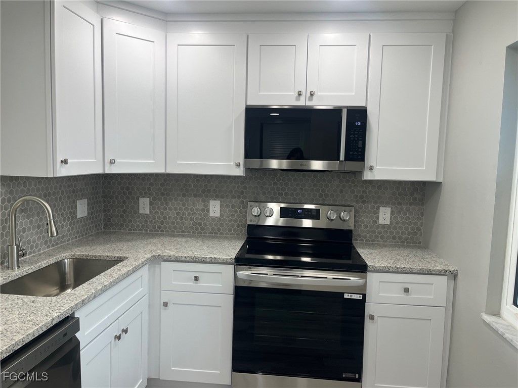 Welcome Home to Your Completely Updated Unit!! This 2 bedroom 1-bathroom Berkshire Model has new luxury vinyl flooring throughout the condo. The kitchen has shaker white soft close cabinets, granite countertops, Tile Backsplash and brand-new stainless-steel LG appliances, there is plenty of cabinet storage too. Impact Resistant Windows Throughout the back window is Ceiling to Floor to capture the view of Seven Lakes Golf Couse. Air Conditioner is 2024 and Hot Water Heater 2025. The bathroom has been remodeled with new Vanity and Tiled Tub/Shower. New electric switches and outlet and lights. Come Live an active 55+ lifestyle, Golf Bundled for two owners to play on the 18-hole executive course with no green fees no trail fees. 6 Tennis Courts, Pickleball, Bocce, Shuffleboard, 6 Heated Swimming Pools and Fitness Center. "Tee Room" is a full service restaurant and bar onsite. Lifestyle Dept. plans parties, dances, bus trips, educational seminars and all kinds of fun events. There's something for everyone with Hobby Rooms, Wood Shop, Art & Pottery Studio, Billiards, Card Rooms and Library. 24 hour manned guard gate adds peace of mind. Ideal location near shopping, dining, beaches, performing arts, sports arena, historic downtown, RSW Int'l Airport and lots more! Your Condo Fees cover all the amenities, plus internet/cable, water, sewer, trash removal, and lawn maintenance.... You pay for your electricity. Come take a look at our beautiful community!!!