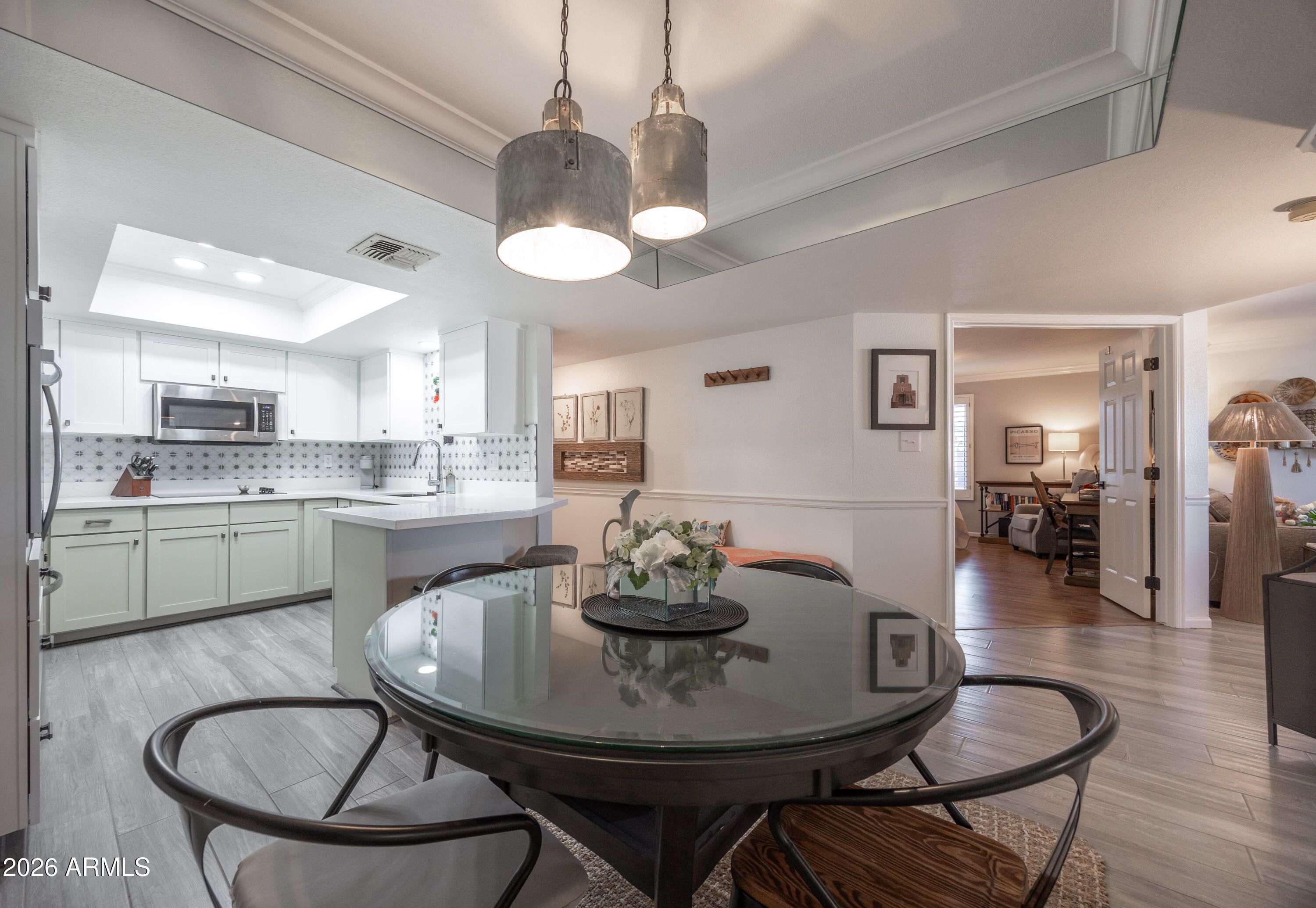 Amazing Ground-floor 2-bedroom, 2-bath condo in The Heritage — the heart of Sun City! This beautifully remodeled home is truly move-in ready, offering an expanded wraparound Saltillo-tiled patio that provides the perfect space for relaxing or entertaining. Inside, you'll find a spacious living area and an updated kitchen featuring a breakfast bar open to the dining area, newer stainless-steel appliances, canned lighting, solid-surface countertops, and raised-panel cabinetry. Elegant upgrades continue throughout with newer flooring, updated bathrooms, crown molding and plantation shutters. The second bedroom is thoughtfully designed with built-in storage cabinets, an office setup, and a convenient Murphy bed — ideal for guests or flexible living. Additional features include a patio laundry room, extra storage, and an A/C system replaced in 2018. The Heritage is a premier 55+ condo community offering resort-style amenities and access to all facilities, including a heated pool and spa, secured parking, fitness center, BBQ area, library, party kitchen, billiards room, and so much more. Come enjoy the Sun City lifestyle at its best!