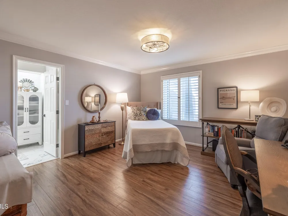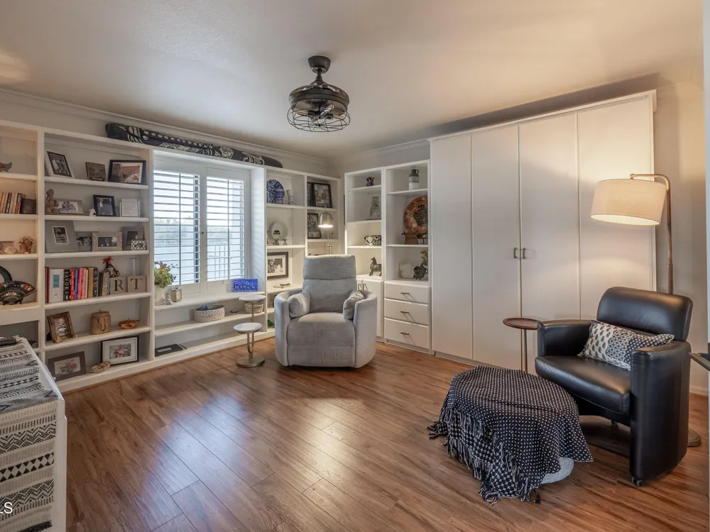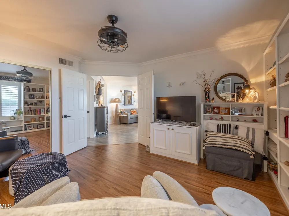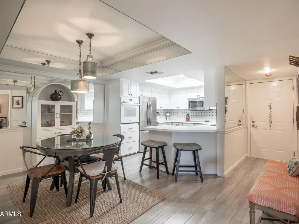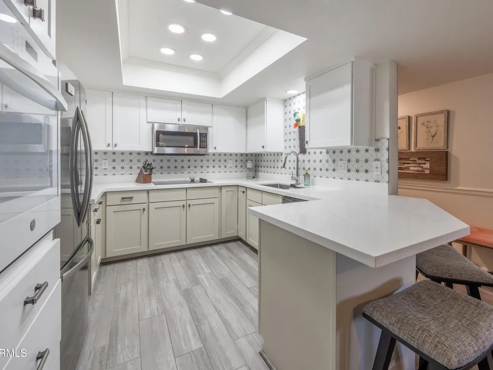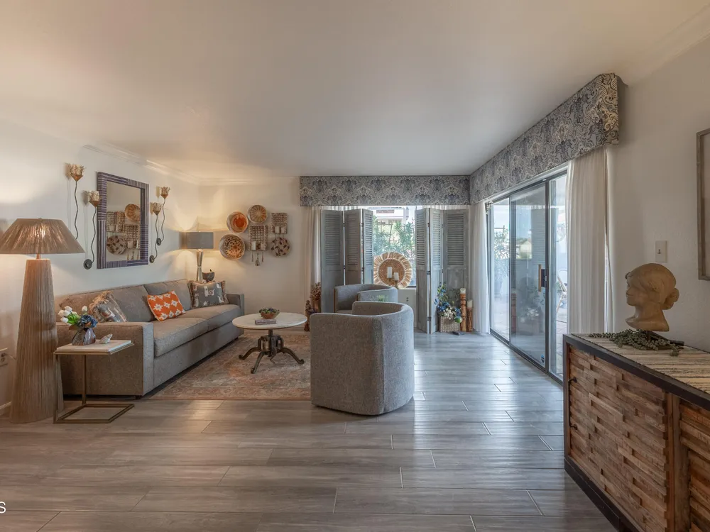 GORGEOUS GROUND FLOOR unit in THE HERITAGE! Expanded Saltillo tiled wrap around patio space and a gorgeous interior! Remodeled Bright, Beautiful kitchen w/ quartz countertops, tiled backsplash, modern cabinets, recessed lighting, & breakfast bar. Tastefully updated bathrooms too! Primary suite has double sinks, tiled shower, & walk-in closet. Crown molding and plantation shutters. Bedroom 2 contains storage cabs, office set-up and murphy bed. Patio with laundry room and storage room. AC replaced 2018. THE HERITAGE is a 55+ condo community that features resort-style amenities with access to all facilities including a heated community pool and spa, secured parking, fitness center, BBQ, library, kitchen for parties, billiard room and so much more!