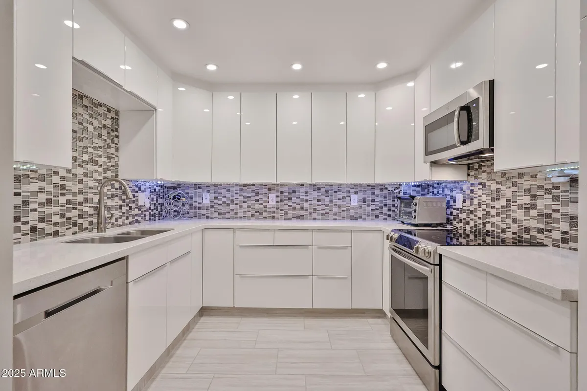Beautifully Remodeled Courtyard facing on the second floor in Gated Community Completely updated, this 2-bedroom, 2-bath unit offers modern comfort in a secure community with impeccably maintained grounds. Facing the peaceful courtyard, this home is move-in ready—nothing to do but enjoy! Highlights: • Paint with Santa Fe wall texture * Wood-look gray tile flooring throughout •Kitchen with 40'' upper cabinets, stainless steel appliances, and quartz countertops • Bathrooms with large gray tile surrounds for shower and tub •Raised ceilings in kitchen and bathrooms for an open feel •Spacious living area with access to a private balcony •True 2-bedroom layout with excellent use of space. The Heritage offers pool, spa, exercise room, kitchen facility for entertiaining, TV room, so much more Billiards table, social rooms and events. HOA also covers 100 Cox CAble Channels. No Hot Water heaters to replace. Assigned covered parking space with additional space for Golf cart and enclosed storage area with light and receptacle. This condo combines stylish updates with a serene settingperfect for full-time living or a low-maintenance retreat.