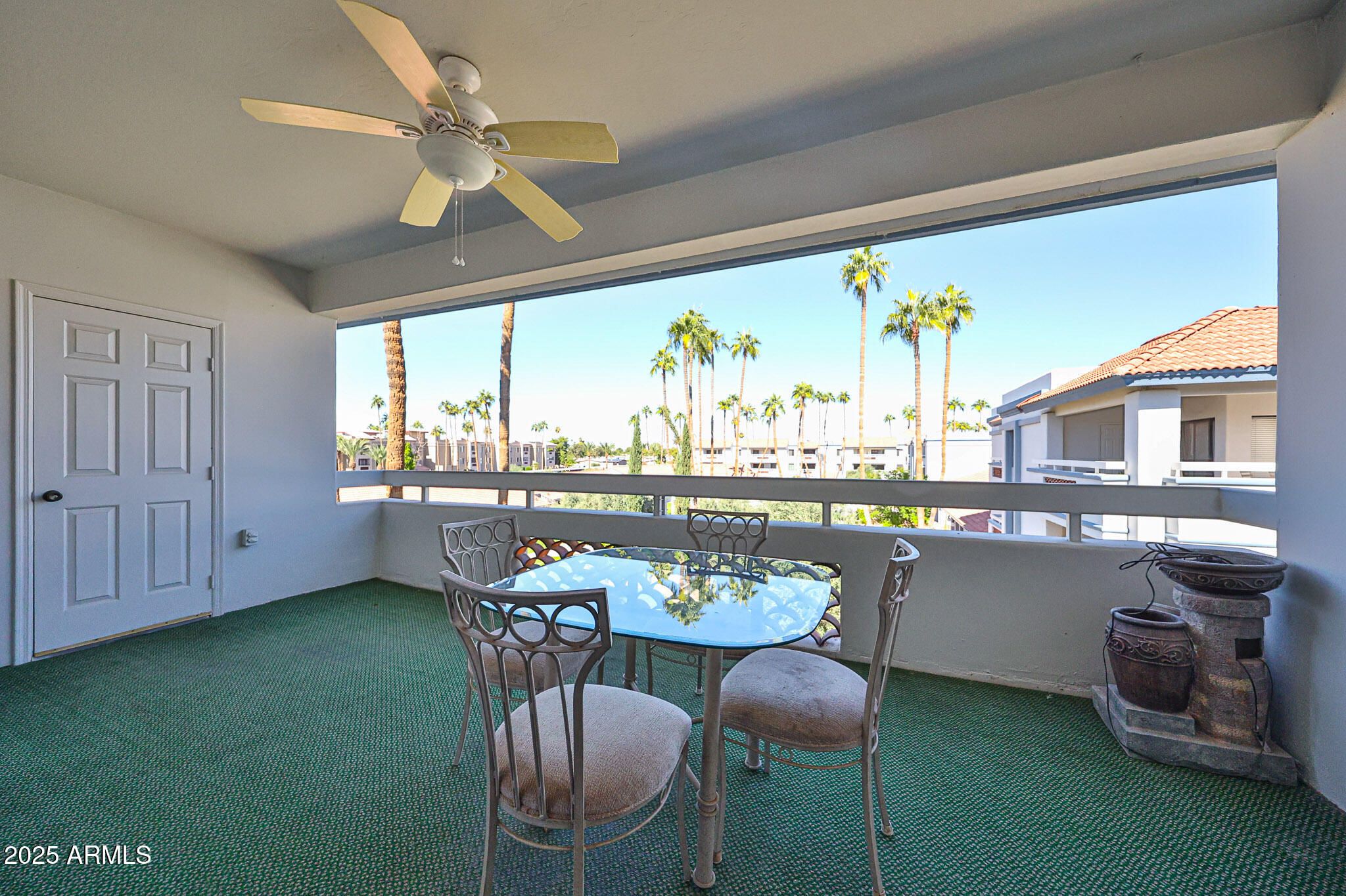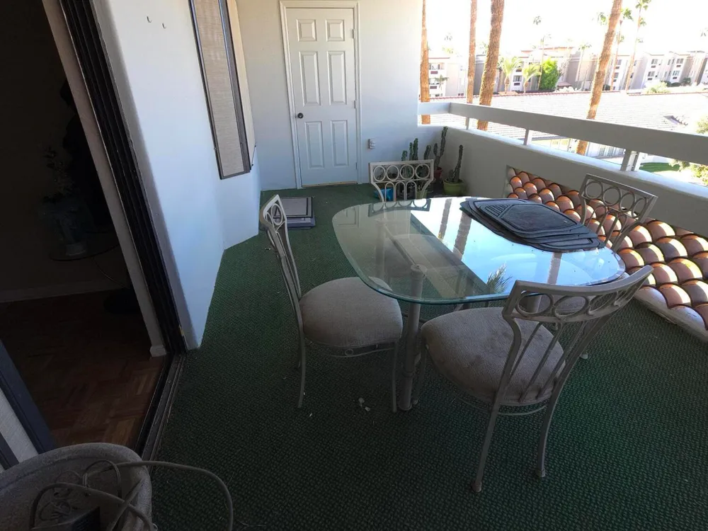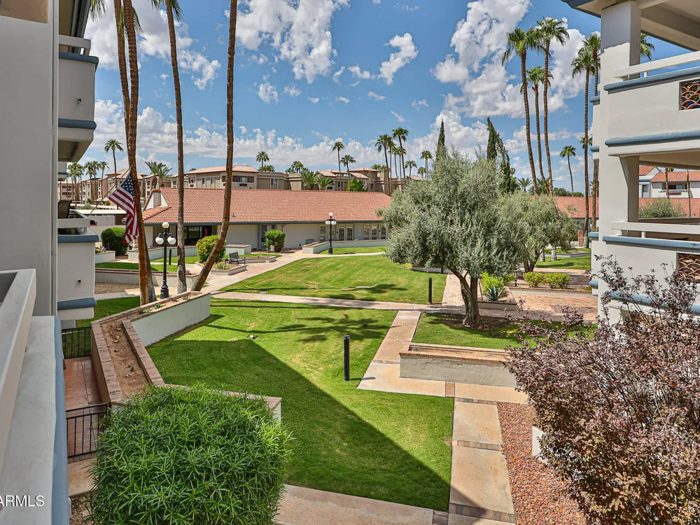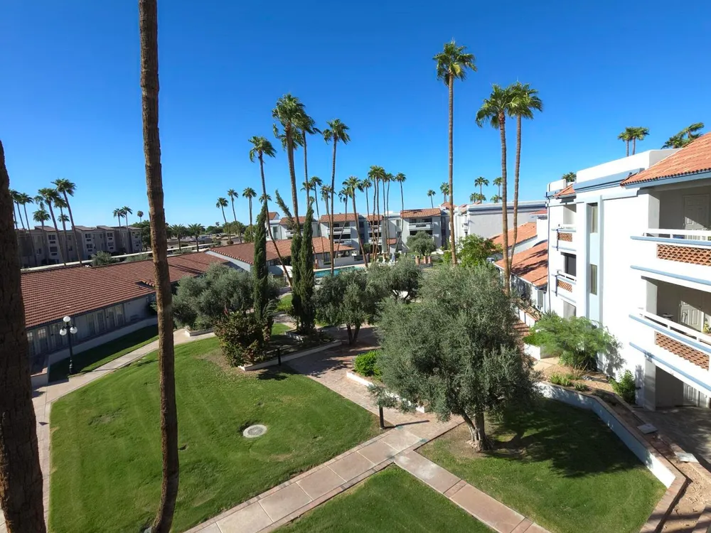 Courtyard facing larger condo. This spacious 2-bedroom, 2-bathroom residence with an additional den offers comfort, functionality, and resort-style living in the desirable Heritage community. Enjoy a north-facing courtyard with stunning views, perfect for relaxing or entertaining.The updated kitchen features sleek cabinetry, cooktop stove, refrigerator, wall oven, built-in microwave, and dishwasher. Crown molding throughtout.The large primary suite includes a double vanity, walk-in closet, make-up area, and linen closet. The guest bedroom and bath function as a second primary suite providing ideal space for visitors. The versatile den is perfect for a home office, hobby room, or reading nook.Additional conveniences include an exterior laundry area off the balcony, a separate storage room. Gated community with assigned parking with golf cart space, and a private shed. The Heritage offers a true resort lifestyle with social rooms, party kitchens, billiards, library, media room, fitness center, and a heated pool and spa. HOA fees cover water, trash, exterior maintenance, security system, Cox basic cable, and moreso you can simply enjoy life.