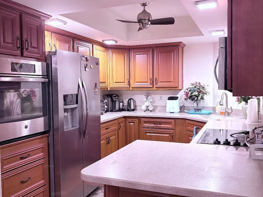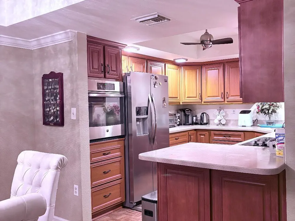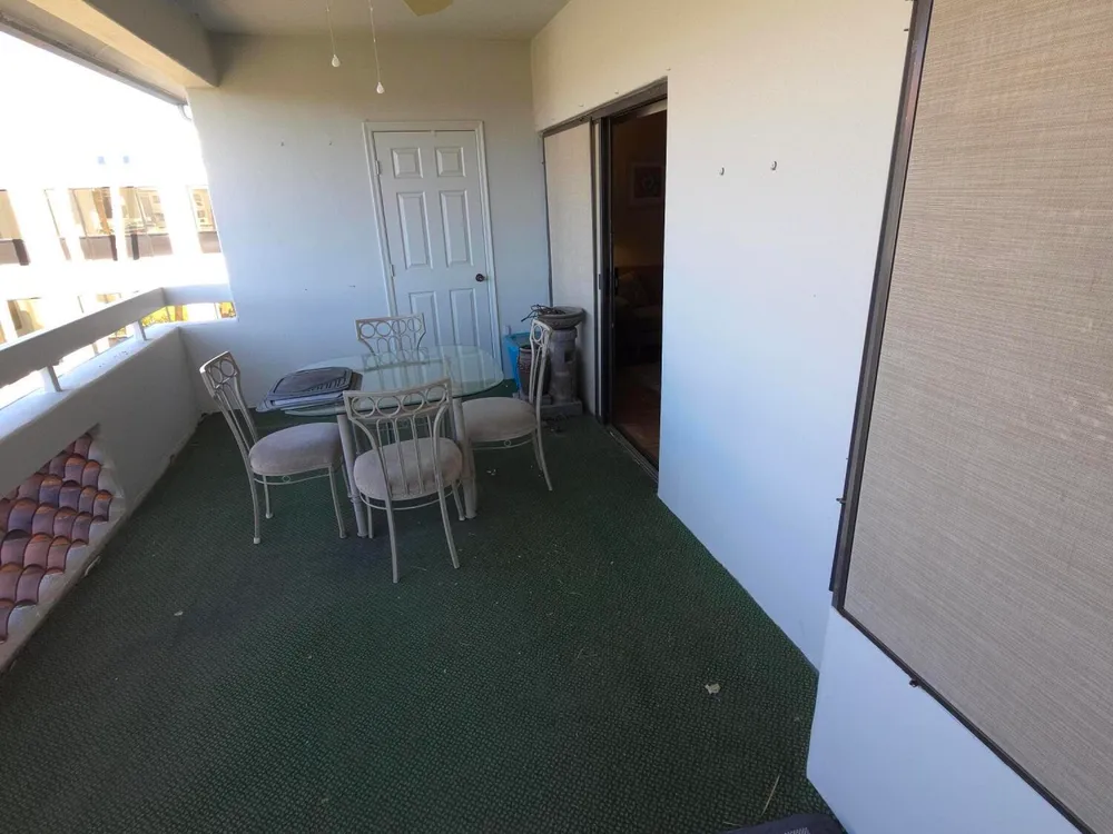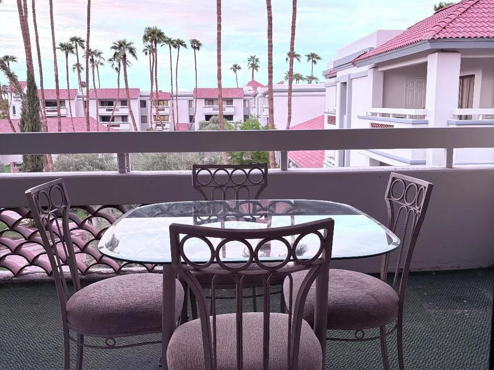 Courtyard facing larger condo. This spacious 2-bedroom, 2-bathroom residence with an additional den offers comfort, functionality, and resort-style living in the desirable Heritage community. Enjoy a north-facing courtyard with stunning views, perfect for relaxing or entertaining.The updated kitchen features sleek cabinetry, cooktop stove, refrigerator, wall oven, built-in microwave, and dishwasher. Crown molding throughtout.The large primary suite includes a double vanity, walk-in closet, make-up area, and linen closet. The guest bedroom and bath function as a second primary suite providing ideal space for visitors. The versatile den is perfect for a home office, hobby room, or reading nook.Additional conveniences include an exterior laundry area off the balcony, a separate storage room. Gated community with assigned parking with golf cart space, and a private shed. The Heritage offers a true resort lifestyle with social rooms, party kitchens, billiards, library, media room, fitness center, and a heated pool and spa. HOA fees cover water, trash, exterior maintenance, security system, Cox basic cable, and moreso you can simply enjoy life.
