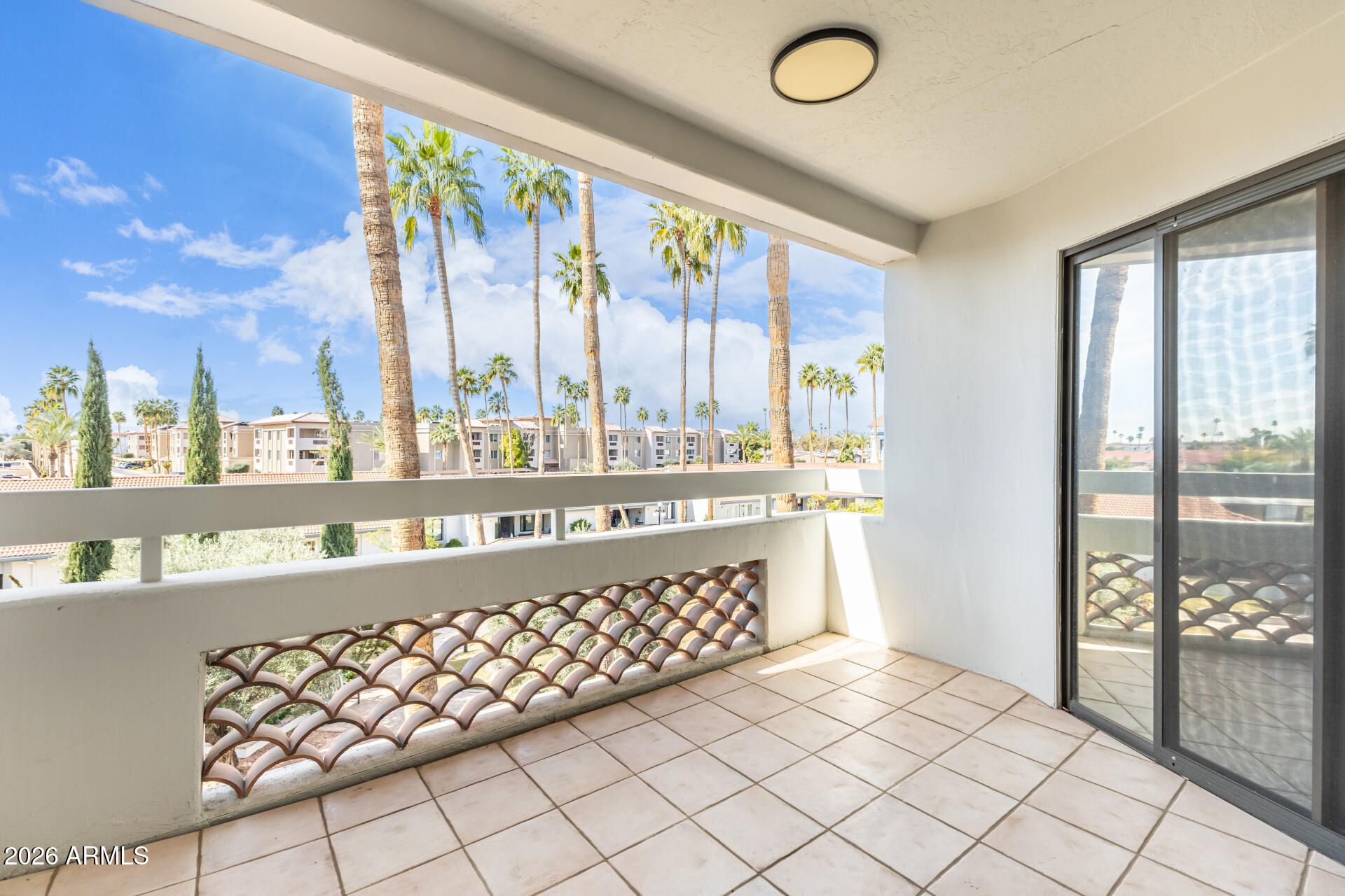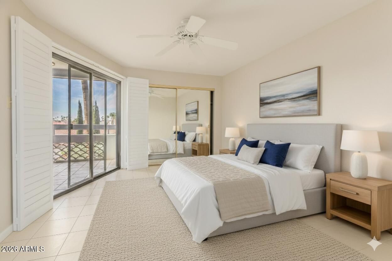 Elevator access adds everyday convenience, and the Seller will pay the Preservation & Improvement Fee. Perched on the top floor, this private end unit offers stunning Arizona sunsets and peaceful courtyard and pool views from a spacious balcony, only one shared wall. Pride of ownership shows with tile flooring, updated interior paint, and a modern kitchen featuring Silestone countertops imported from Spain, plus Brand New dishwasher, microwave & screen doors. Enjoy resort-style amenities including a heated pool and spa, fitness center, billiards and recreation rooms, library, multiple community rooms, full kitchen, trash chutes on each floor, gated entry, and beautifully maintained courtyards. Includes covered parking, golf cart parking with storage, and COX cable TV with 100+ channels. Community features include 2 large rec rooms, pool room with large pool table, kitchen facility for parties & your special events, TV room, library, heated pool & spa, workout facility, COX cable TV with over 100 channels included in the HOA fee, & smaller rec/meeting rooms on each floor. Trash chute on each floor. Close to 101 and lots of shopping.