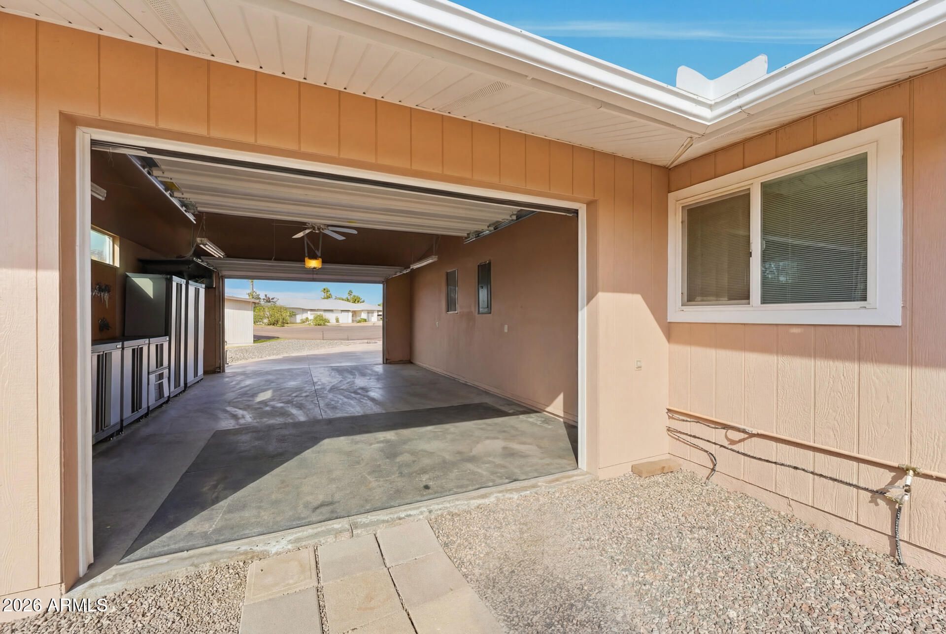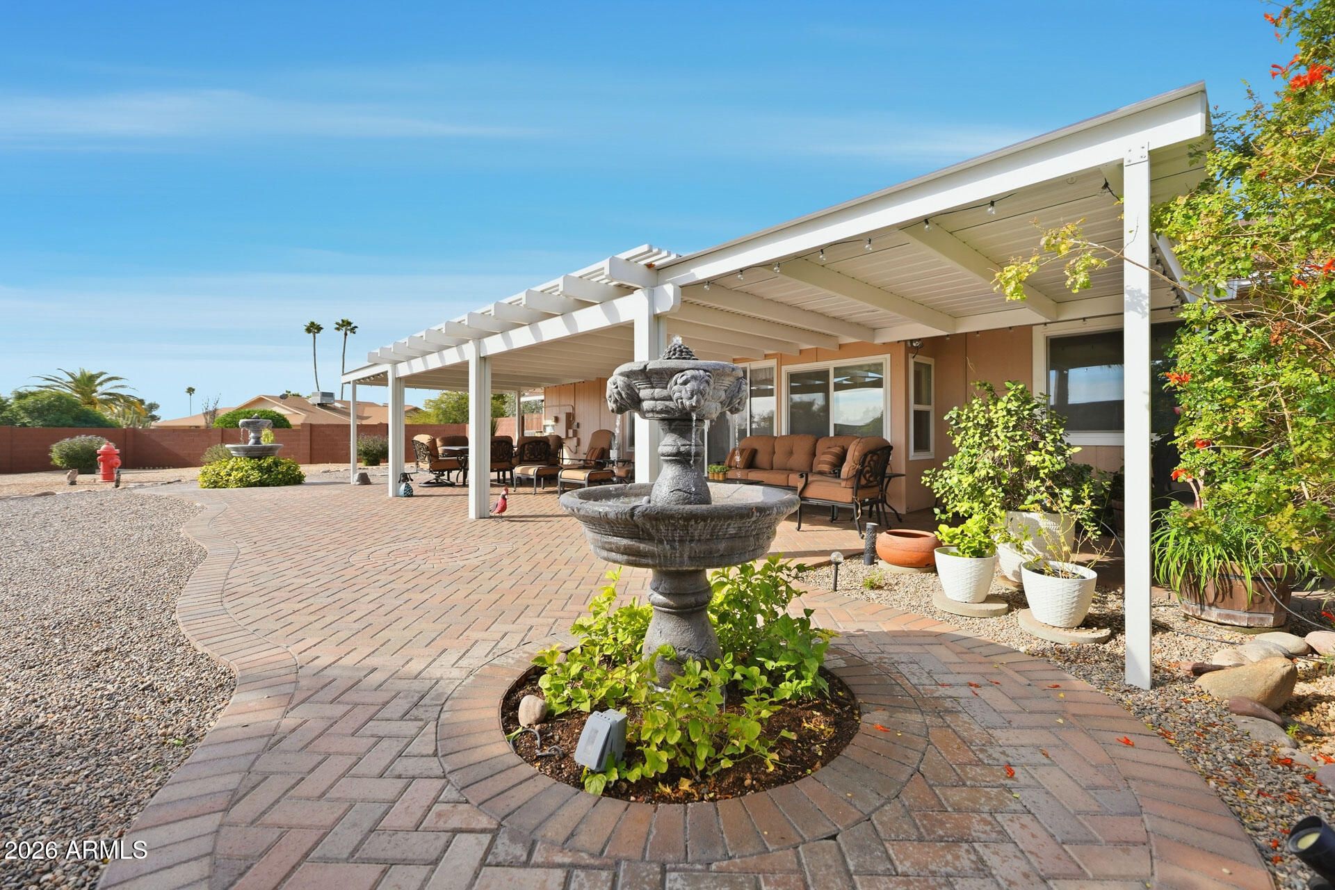 Expanded 3BR Jacaranda model featuring a rare drive-thru 3-car garage on a nearly half-acre private cul-de-sac lot with no homes behind. Beautifully updated with new exterior paint, popcorn ceilings removed throughout, and major system upgrades including a new roof and new AC (2023). Spacious eat-in kitchen offers custom cabinetry, gorgeous granite countertops, and an oversized island seating up to 8. Primary suite includes a walk-in closet and private bath with walk-in shower and dual sinks. Huge, fully enclosed backyard with new extended paver patio and walkway, extended patio roof, new pergola, mature lemon tree, and stunning landscaping, featuring two new fountains that are self maintained with shut off valve and floaters to maintain the water level and a new timer for front and back system. RO systems in the kitchen and garage for the fountains. A stub for a 220 outlet for future spa has been added. Located in Sun City West, a premier 55+ community offering 7 golf courses, 6 pools, recreation centers, fitness facilities, tennis, theater, and endless activities.