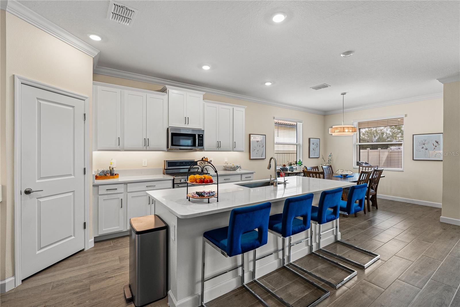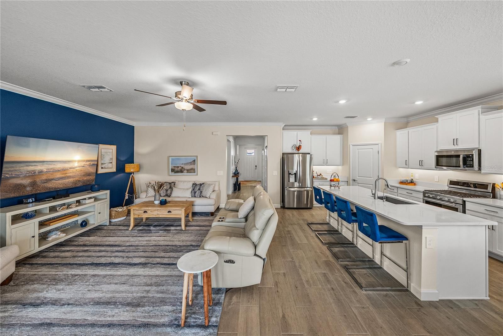 Welcome to this elegantly UPGRADED single-family residence located in the highly sought-after Medley at Southshore Bay, an active 55+ lifestyle community designed for refined, low-maintenance living. This thoughtfully designed home offers 1,956 square feet of living space with 2 bedrooms, 2 bathrooms, and a versatile BONUS FLEX ROOM featuring upgraded sliding French doors, ideal for a private home office, guest retreat, or creative space. The open-concept interior showcases custom ARCHITECTURAL details at the entry, crisp white cabinetry, QUARTZ countertops, and stainless steel appliances, including a GAS COOKTOP/OVEN for the home chef. Additional upgrades include a TANKLESS GAS WATER HEATER, designer lighting fixtures, and calming, sophisticated paint tones in the main living areas and primary suite. The primary bedroom features a CUSTOM-DESIGNED walk-in closet, offering both functionality and elevated storage. Step outside to the screened-in lanai, where peaceful evenings can be enjoyed overlooking a fenced backyard with serene country vibes and no rear neighbors, providing a rare sense of privacy. Homes with this level of outdoor privacy are rarely available within the community. Additional highlights include a generously sized laundry room, ample storage, and a 2-car garage. Residents of Medley enjoy a vibrant 55+ resort-style lifestyle, with exceptional amenities, an active social calendar, and a community designed to support both relaxation and connection. Opportunities to own a single-family home with this combination of upgrades, privacy, and location are limited, making this an exceptional offering within one of Wimauma’s most desirable active adult communities. Schedule your private showing today to experience this exceptional home firsthand.
