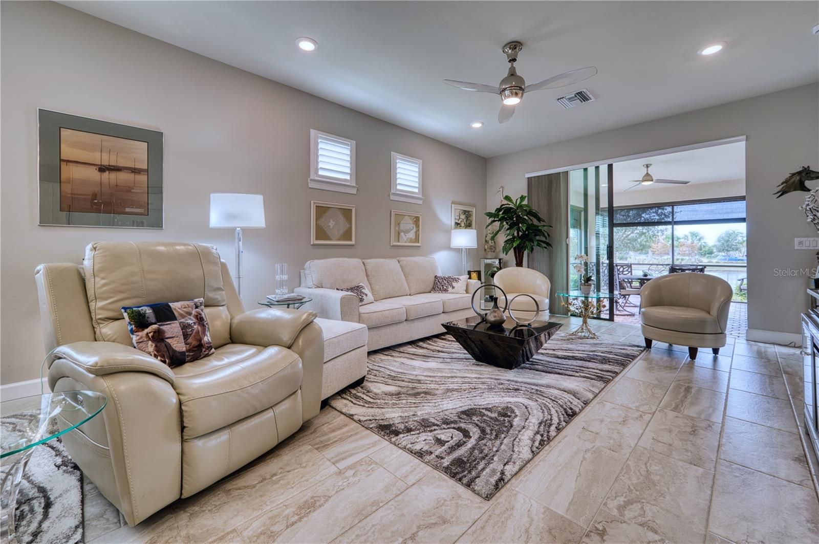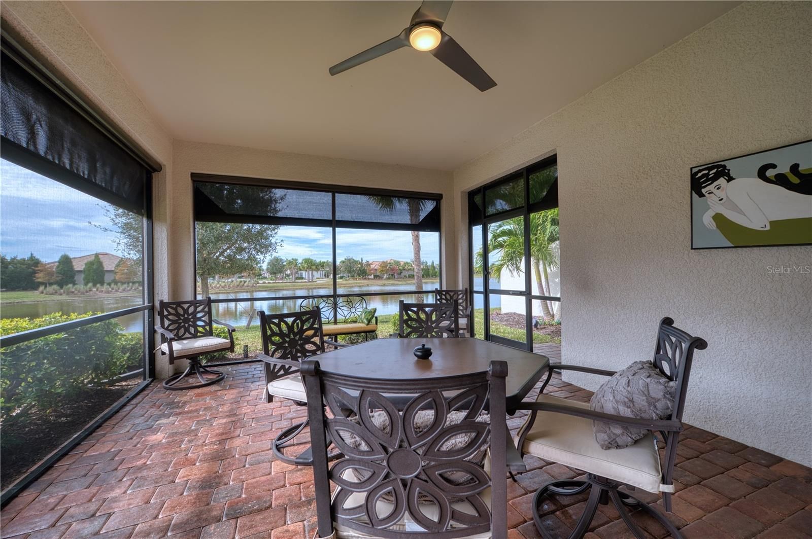 Contemporary and Comfortable with a Fabulous view is what you will feel in this 2 Bed, 2 Bath plus Den Serenity paired villa. Beautifully appointed, you will want to relax on the extended lanai with storm screens - ( Accordion shutters are on the rest of the windows which will add to your peace of mind. )This home is ready for you to enjoy as either part time or full time, with plenty of space in the open floor plan. Del Webb offers resort style living with wonderful amenities including pickleball, tennis, and a fully equipped gym, card rooms, the "Lakehouse"restaurant, a resort style pool, a secondary pool and a full schedule of activities for every interest. With an entrance on Masters' Ave as well, the location is perfect- allowing access to University Pkwy, Waterside, UTC Mall, Mote Marine, downtown Sarasota, our beautiful beaches and everything North or South. This is a must see- your pathway to relax, renew and reboot!