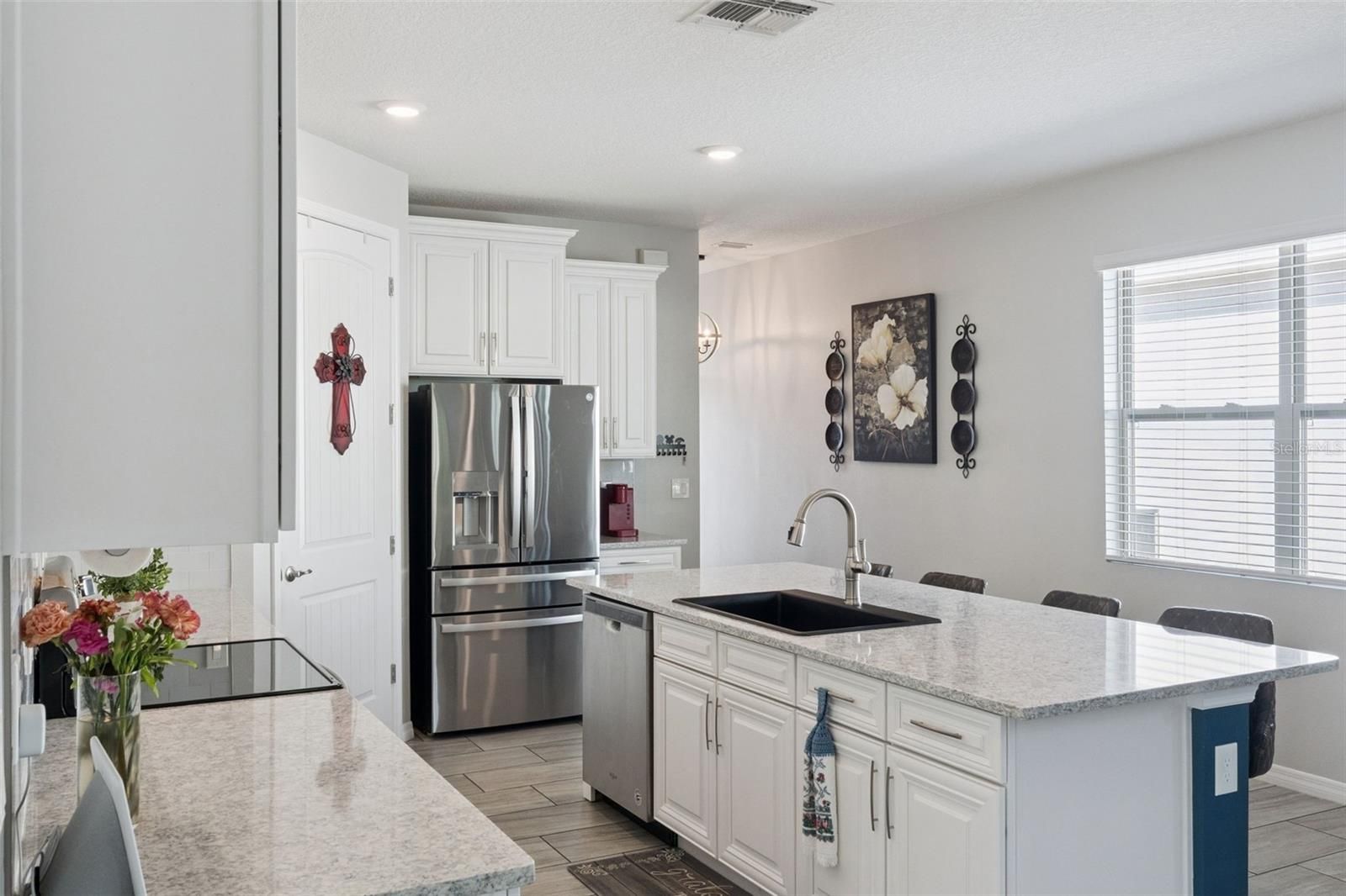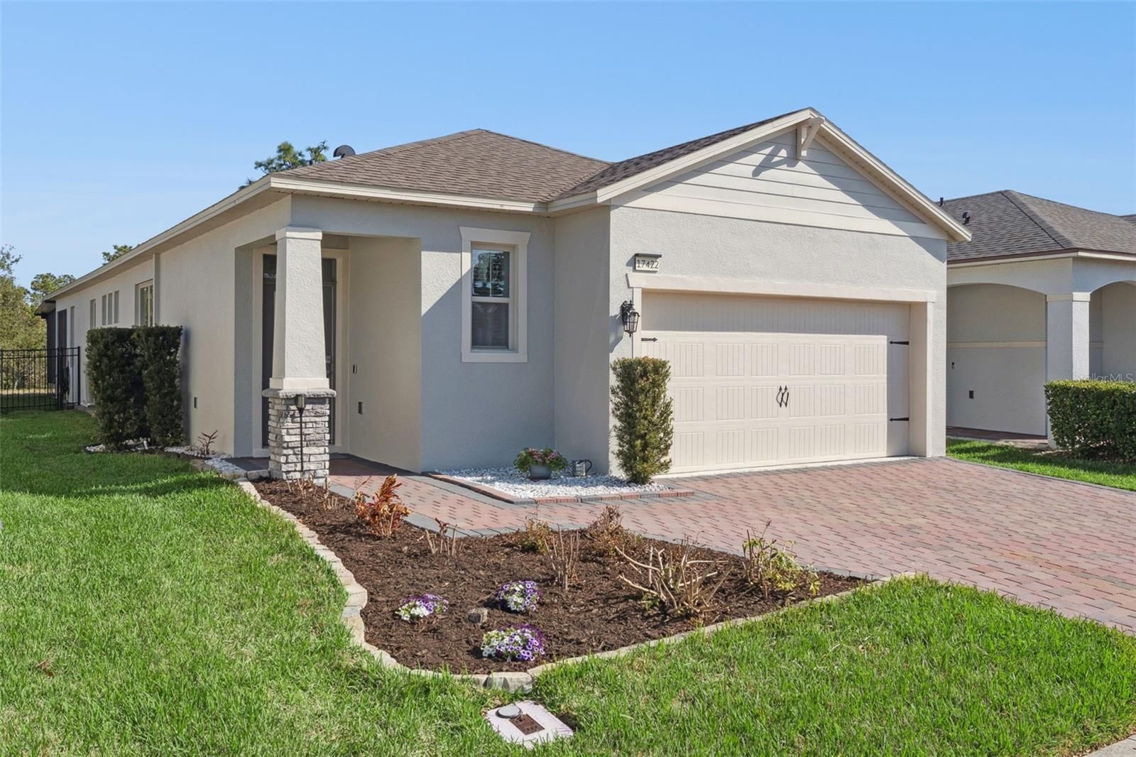 Welcome home to the resort-style living you've been dreaming of! Located in the sought-after 55+ gated community of Palms at Serenoa and built in 2021, this beautifully designed 3-bedroom, 2-bath home offers comfort, chic design, and low-maintenance living in one exceptional setting. A pavered driveway, fresh exterior paint, and lush landscaping create eye-catching curb appeal, welcoming you into a bright foyer highlighted by a stunning statement light fixture. Inside, the spacious great room seamlessly blends the living, dining, and kitchen areas, making it perfect for both everyday living and effortless entertaining. The modern kitchen is the heart of the home, featuring a large island, 42" soft-close cabinetry with crown molding, quartz countertops, stainless steel appliances, and sleek contemporary finishes. Overlooking the main living space, it’s designed to keep you connected while preparing meals of any size. The private primary suite offers a peaceful retreat with a generous walk-in closet and a spa-inspired en suite bath complete with dual sinks and an oversized walk-in shower. Secondary bedrooms provide flexibility for visiting guests, a dedicated office, or a hobby room filled with natural light. Step outside to the screened-in lanai, ideal for enjoying Florida’s beautiful weather without the pests, all while taking in the serene conservation views that provide the privacy and tranquility you’ve been searching for. Porcelain tile runs throughout the main living areas, adding durability and sophistication to the home’s thoughtful design. As part of this vibrant gated 55+ community, residents enjoy resort-style amenities including a pool, fitness center, park, and more. Even better, lawn care, cable, and internet are included, allowing you to spend less time on upkeep and more time enjoying life. Conveniently located near Highway 27 and SR 429, you’re just 25 minutes from Walt Disney World and close to outstanding shopping, dining, and entertainment throughout Central Florida. Don't wait on this amazing home, schedule a private showing TODAY!!