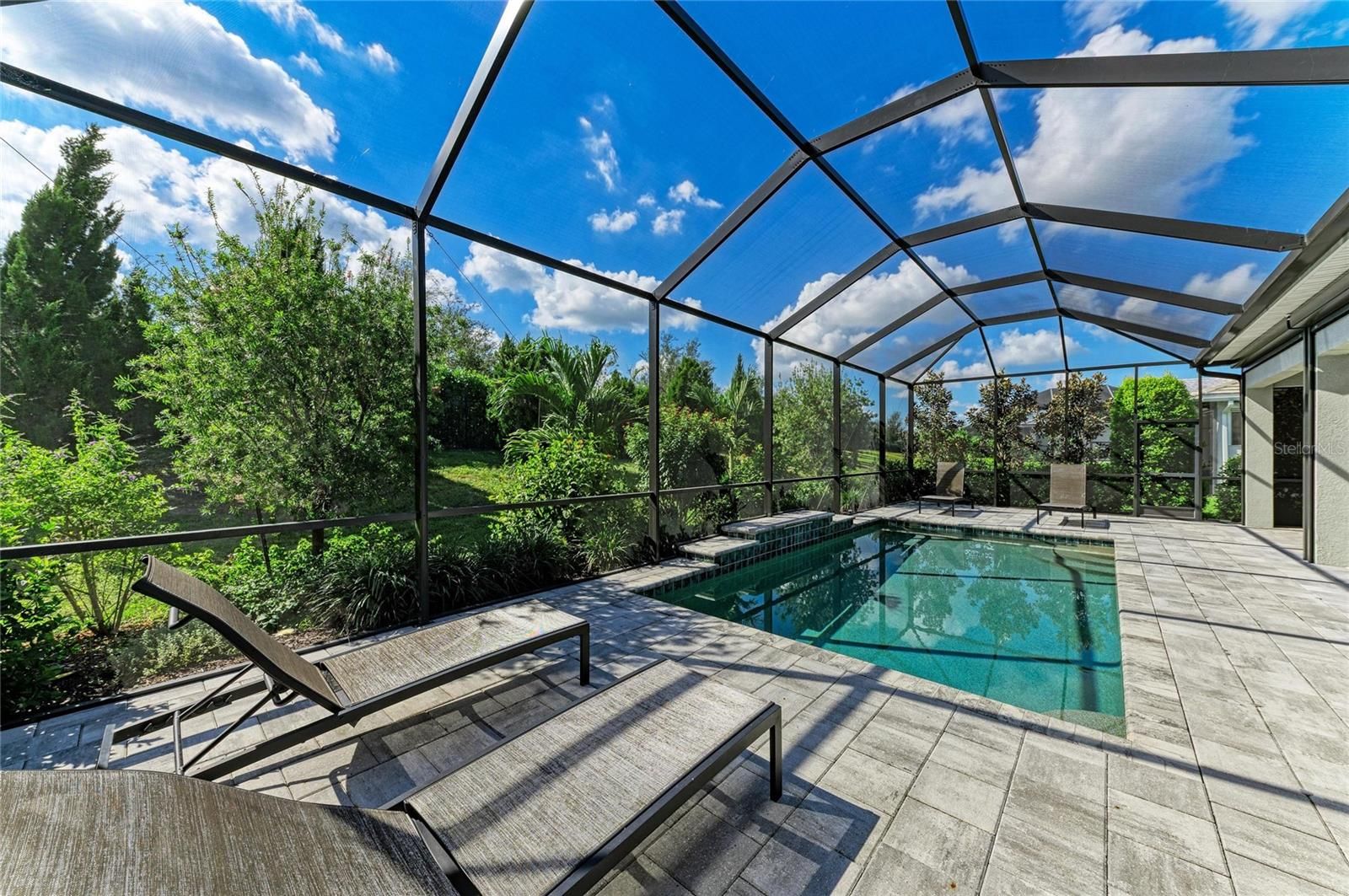Imagine waking up each morning to the soft sounds of nature — coffee in hand, sitting beneath the covered lanai as sunlight dances off the waterfall spilling into your private pool. The only thing more serene than the view is knowing that everything — from the lawn to the high-speed internet — is already taken care of. This is the effortless Florida lifestyle waiting for you in Cresswind, Lakewood Ranch’s premier 55+ resort community. Step through custom glass entry doors into a light-filled home that strikes the perfect balance between elegant design and everyday comfort. The open-concept great room welcomes you with soaring tray ceilings, designer lighting, and a stunning custom-built entertainment wall featuring a 6-foot linear electric fireplace flanked by dual bookshelves. A wall-mounted TV (included) creates a ready-to-enjoy gathering space that seamlessly connects to the chef-inspired kitchen — complete with quartz countertops, graphite cabinetry, a beverage cooler, upgraded pantry, and built-in appliances. The primary suite offers a tranquil retreat overlooking the pool, with a spa-like bath featuring a walk-in shower with bench, dual raised vanities, and a spacious custom closet. Two additional guest bedrooms and a private den provide flexibility for visiting family, hobbies, or a home office (with a wall-mounted TV included). Every inch of this home is curated with thoughtful detail — from designer fans and window treatments to brass-trim floor outlets and upgraded plumbing fixtures. Outside, your personal oasis awaits. A 12’x24 lighted pool with waterfall anchors the expanded lanai, where motorized hurricane screens offer instant protection and privacy. The outdoor TV (included) and under-roof living space make it ideal for entertaining year-round. Beyond the lanai, lush 360° landscaping and paver driveway set the tone for timeless curb appeal — all maintained by the HOA. Even the garage impresses with an epoxy floor, insulated door, backup opener, steel storage racks and cabinets — perfect for your Florida lifestyle essentials. As a resident of Cresswind at Lakewood Ranch, you’ll enjoy access to a vibrant active-adult community designed for connection and wellness: resort-style and resistance pools, tennis and pickleball courts, fitness center, walking trails, arts studio, dog parks, food truck nights, and a full-time lifestyle director. All just minutes from the shopping, dining, and beaches that make Lakewood Ranch the #1 multi-generational community in the U.S. Why wait to start living your best Florida life? This home is the perfect blend of sophistication, low-maintenance living, and resort-level amenities — ready for you to move in and start making memories today. Home is virtually staged.